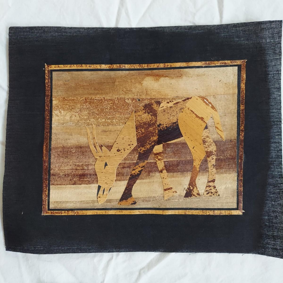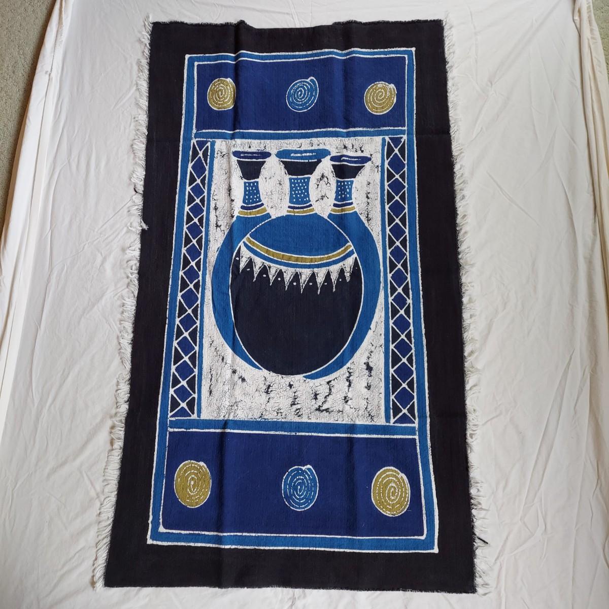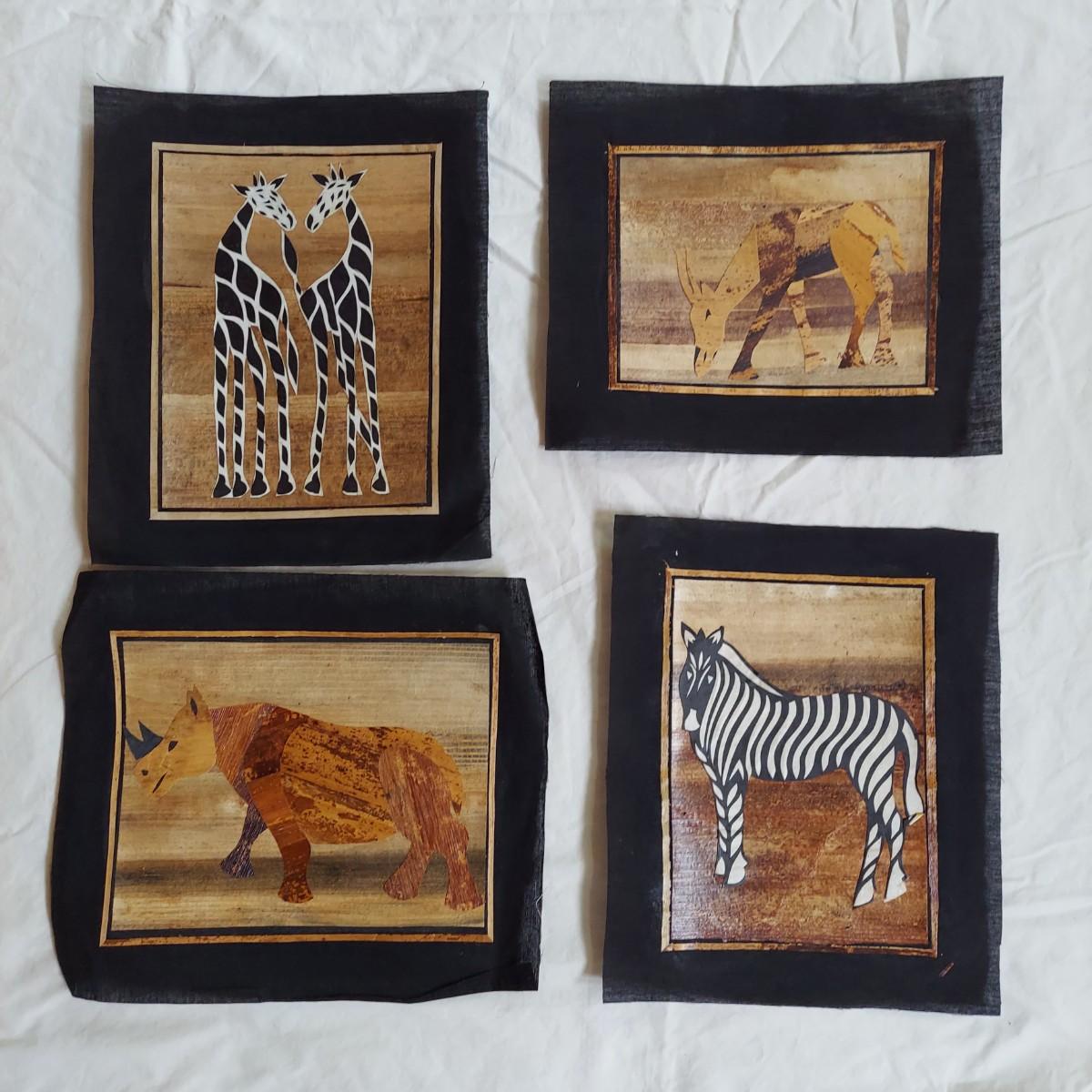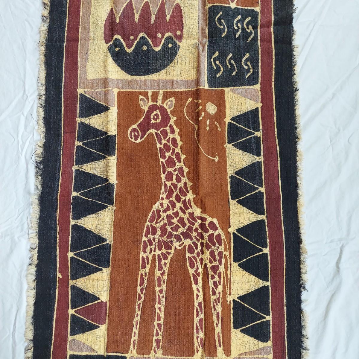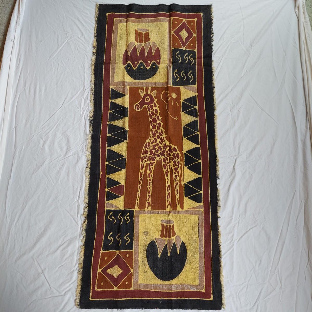 Various types of African art. There are six cloth tapestries in varying sizes. The smallest is the red Egyptian tapestry. It measures approximately 37" x 15". The largest is the blue batik style cloth and its approximately 57" x 34". There are six pen and ink drawings of animals. They measure 10" x 13"H. There are eight art pieces made of cloth, wood and paper. They're approximately 9" x 11"H. Shipping available.