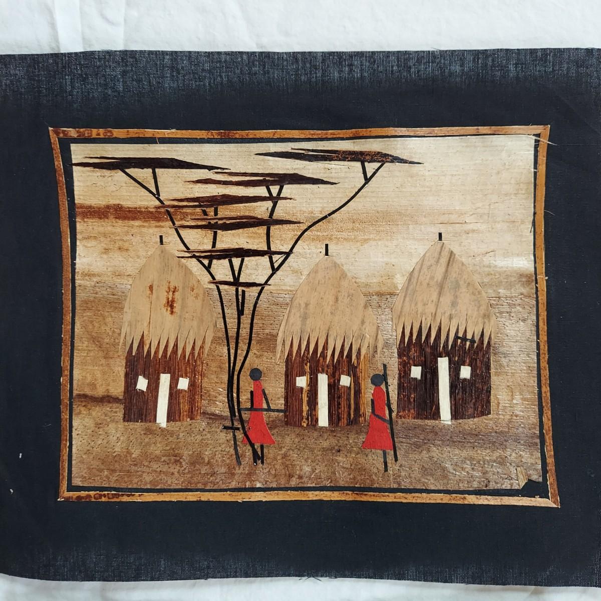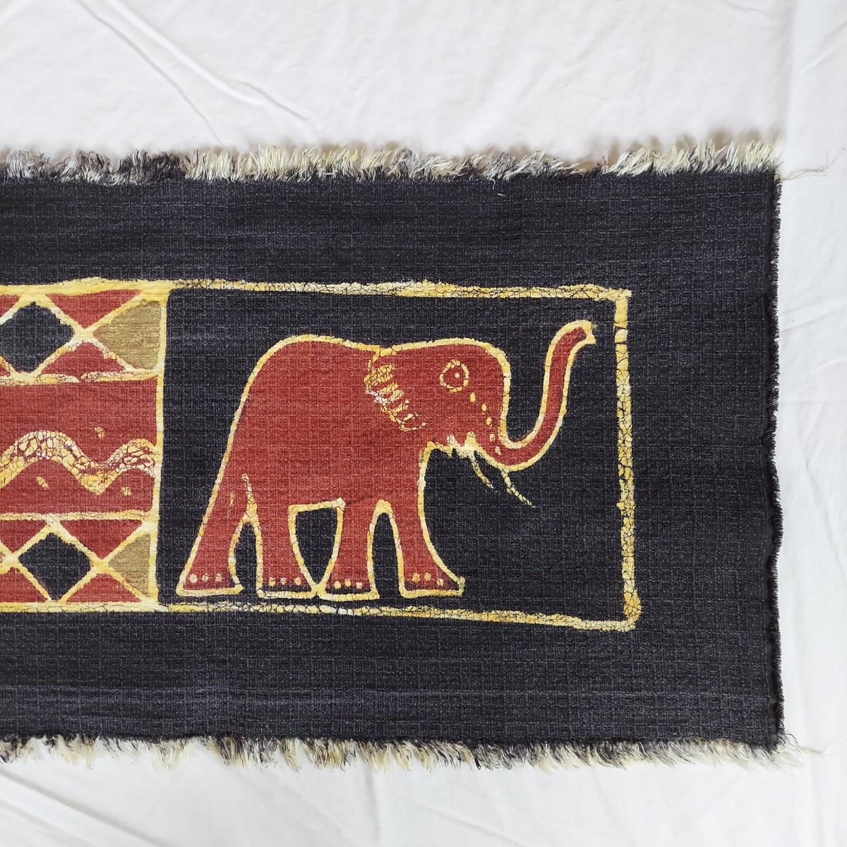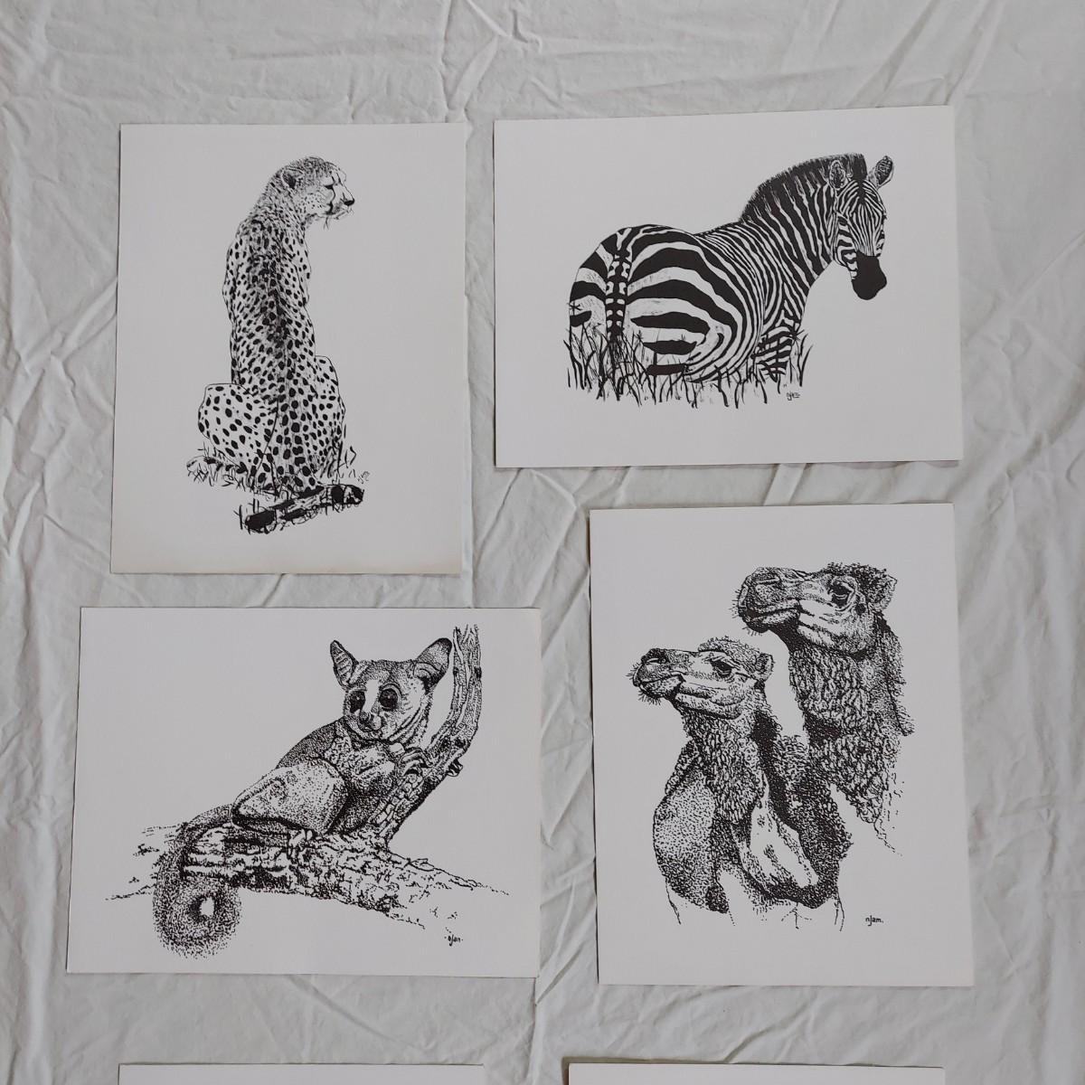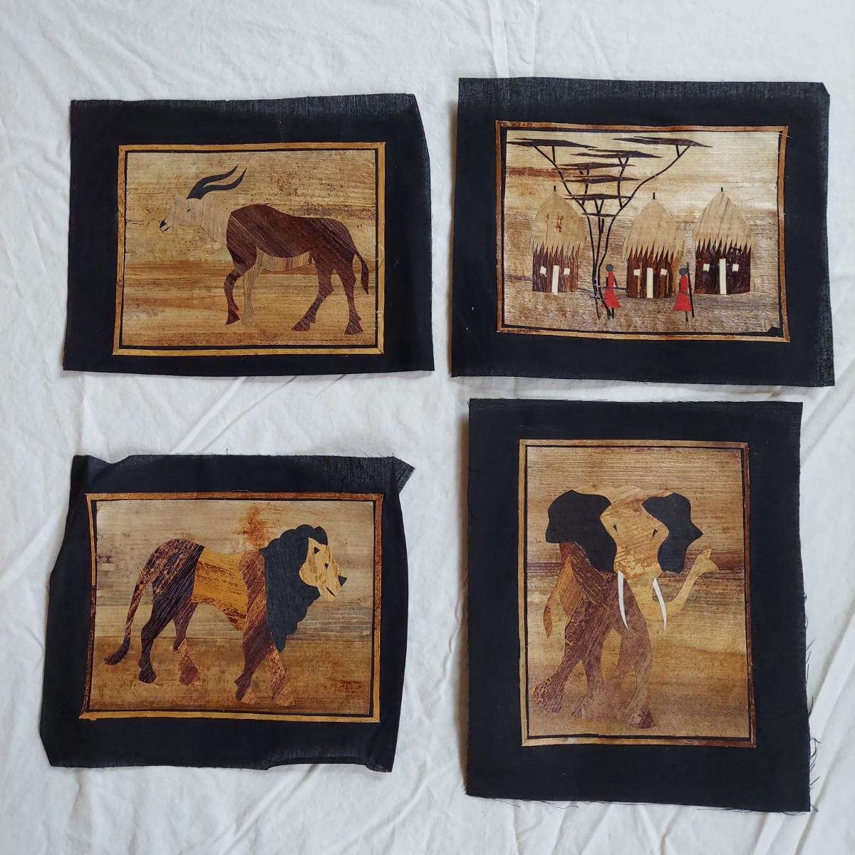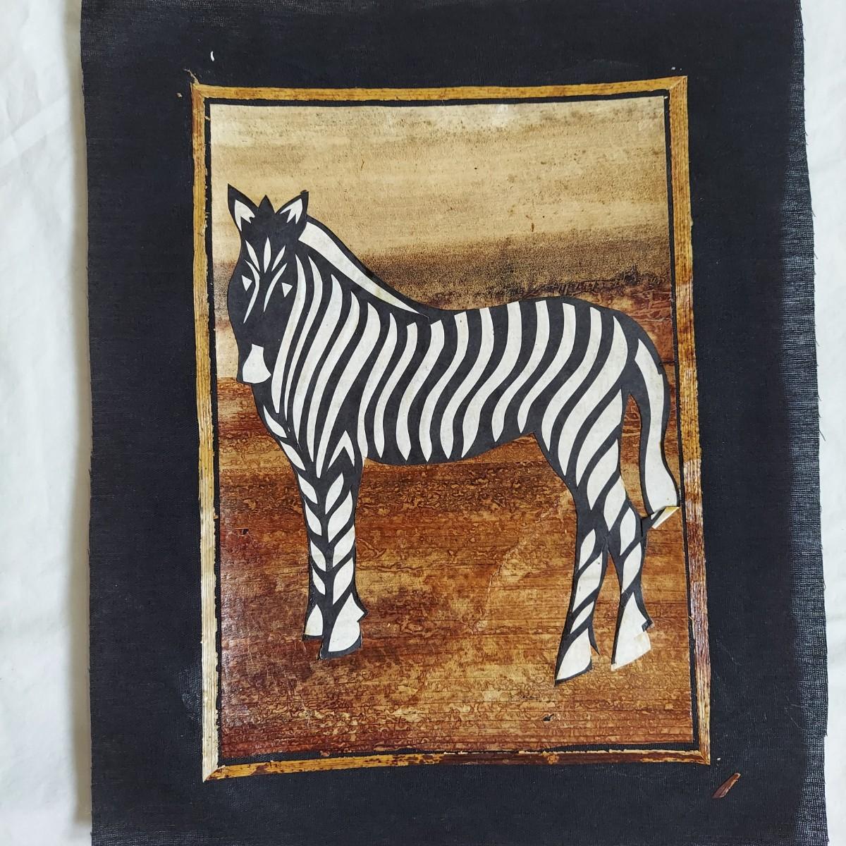 Various types of African art. There are six cloth tapestries in varying sizes. The smallest is the red Egyptian tapestry. It measures approximately 37" x 15". The largest is the blue batik style cloth and its approximately 57" x 34". There are six pen and ink drawings of animals. They measure 10" x 13"H. There are eight art pieces made of cloth, wood and paper. They're approximately 9" x 11"H. Shipping available.