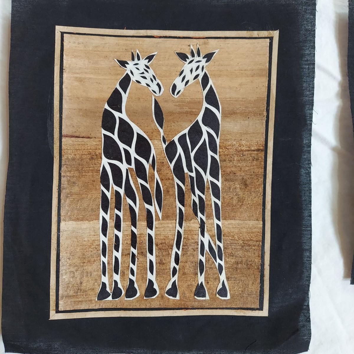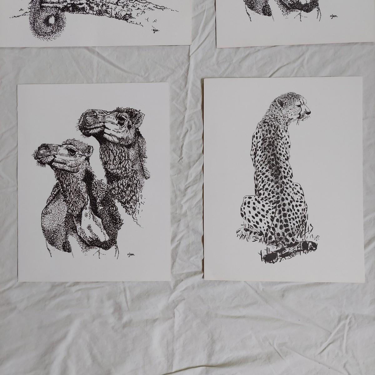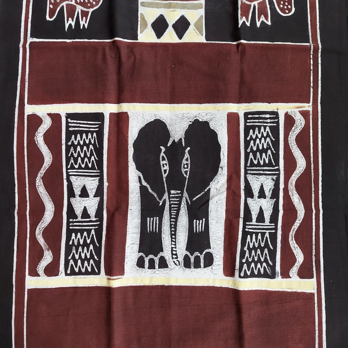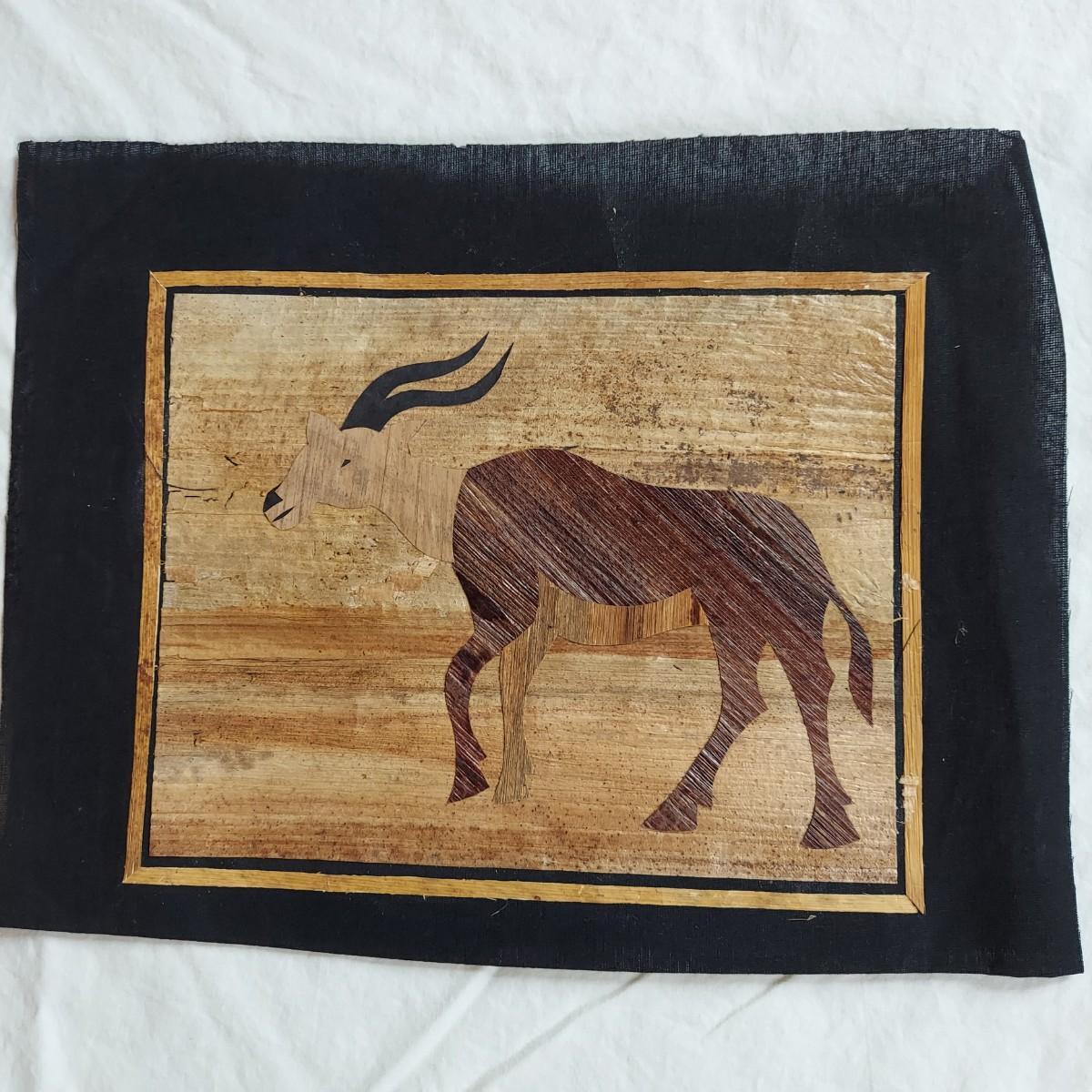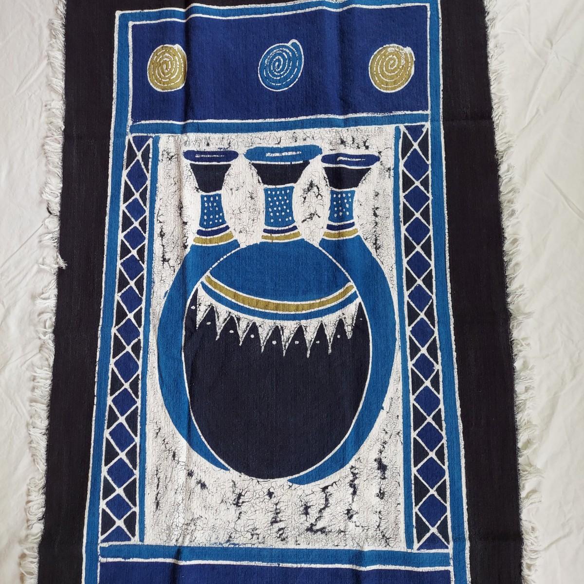 Various types of African art. There are six cloth tapestries in varying sizes. The smallest is the red Egyptian tapestry. It measures approximately 37" x 15". The largest is the blue batik style cloth and its approximately 57" x 34". There are six pen and ink drawings of animals. They measure 10" x 13"H. There are eight art pieces made of cloth, wood and paper. They're approximately 9" x 11"H. Shipping available.