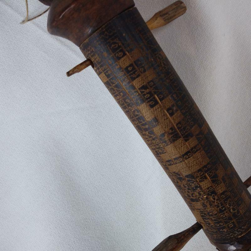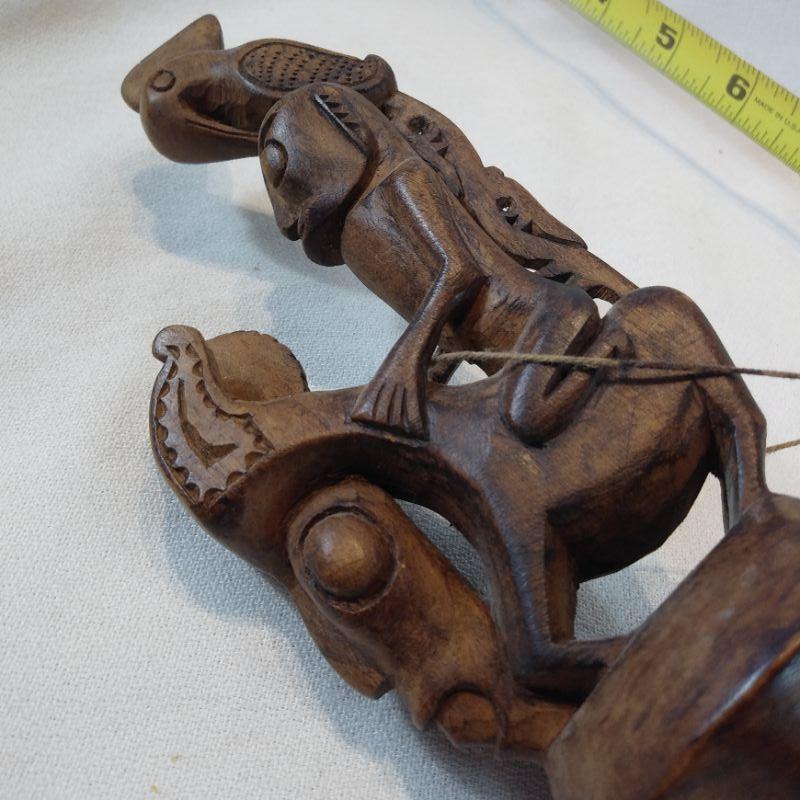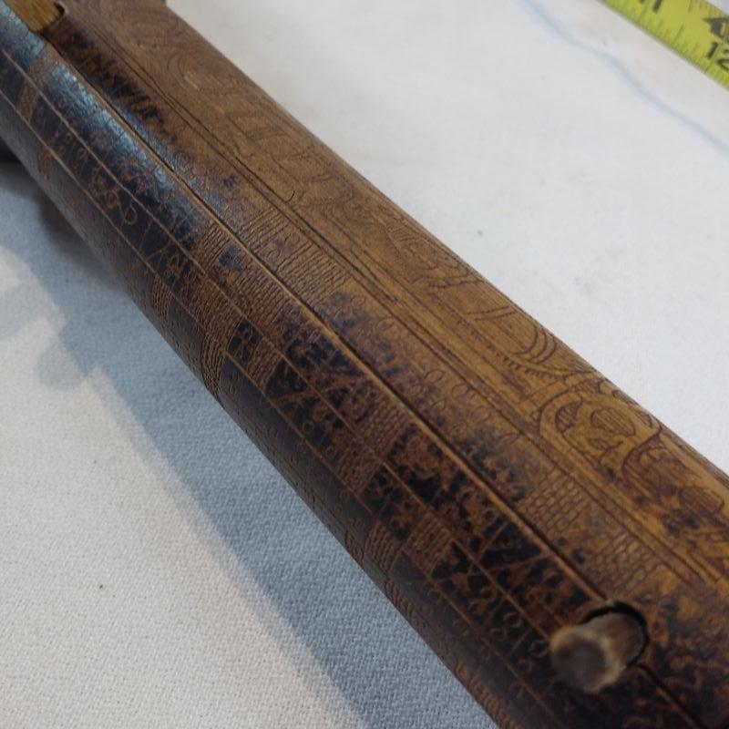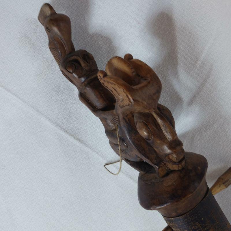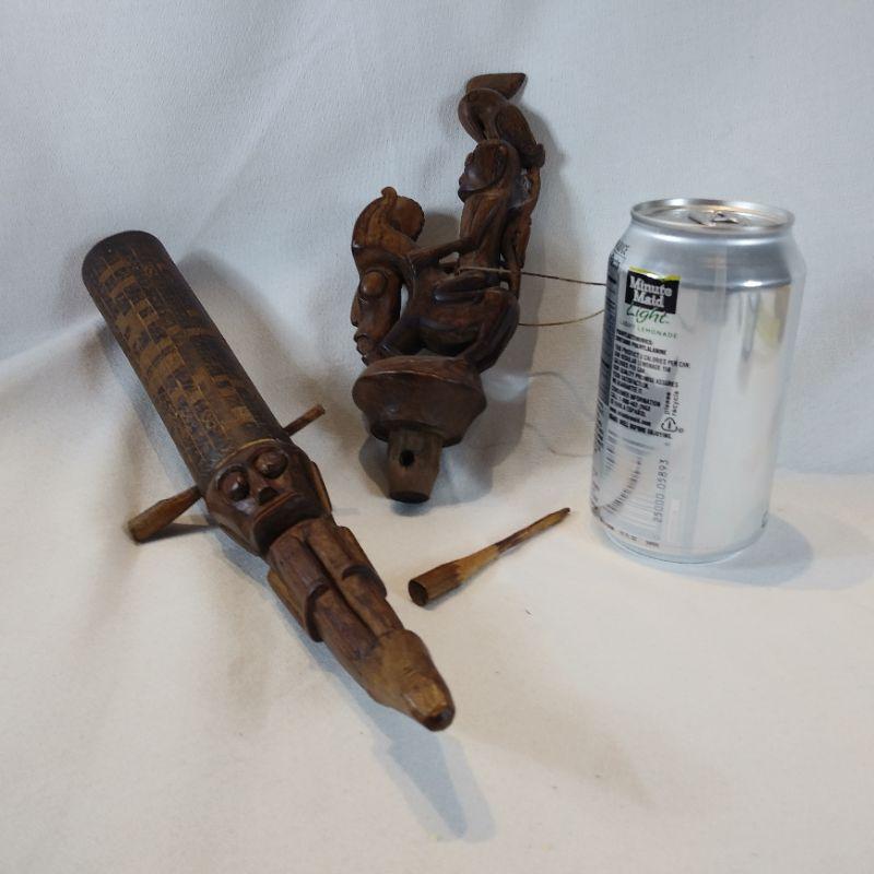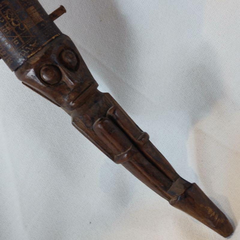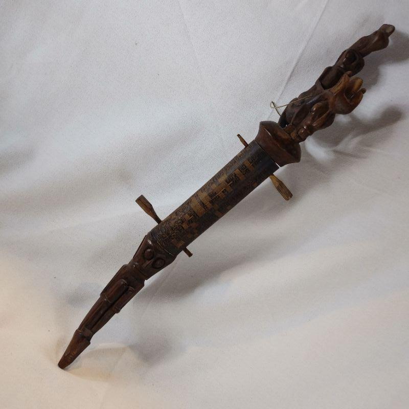 This is a very unusual piece. Client brought back from living in Singapore for years, said it was a gift. Age? Origin? Hand-carved and decorated - comes apart with the wooden pins. Was told it was a Tribal Pipe. It is 18 1/2-inches long and looks to be in good condition.
