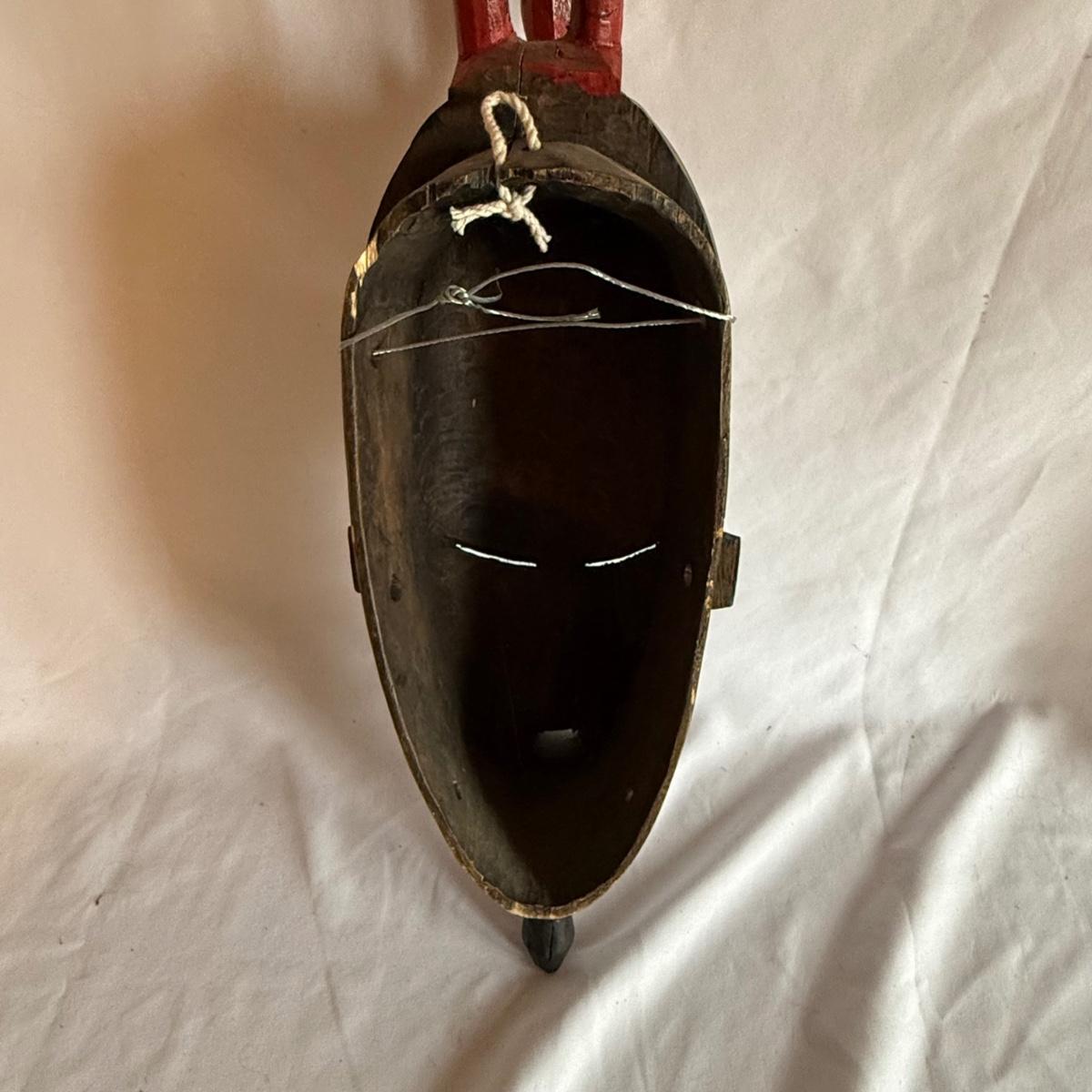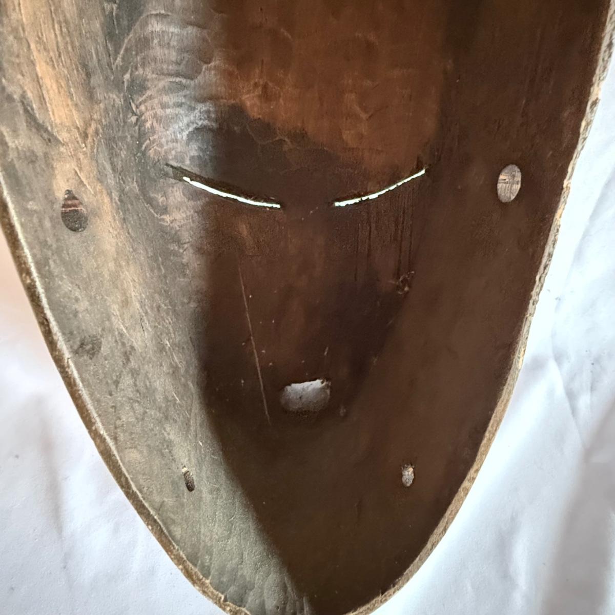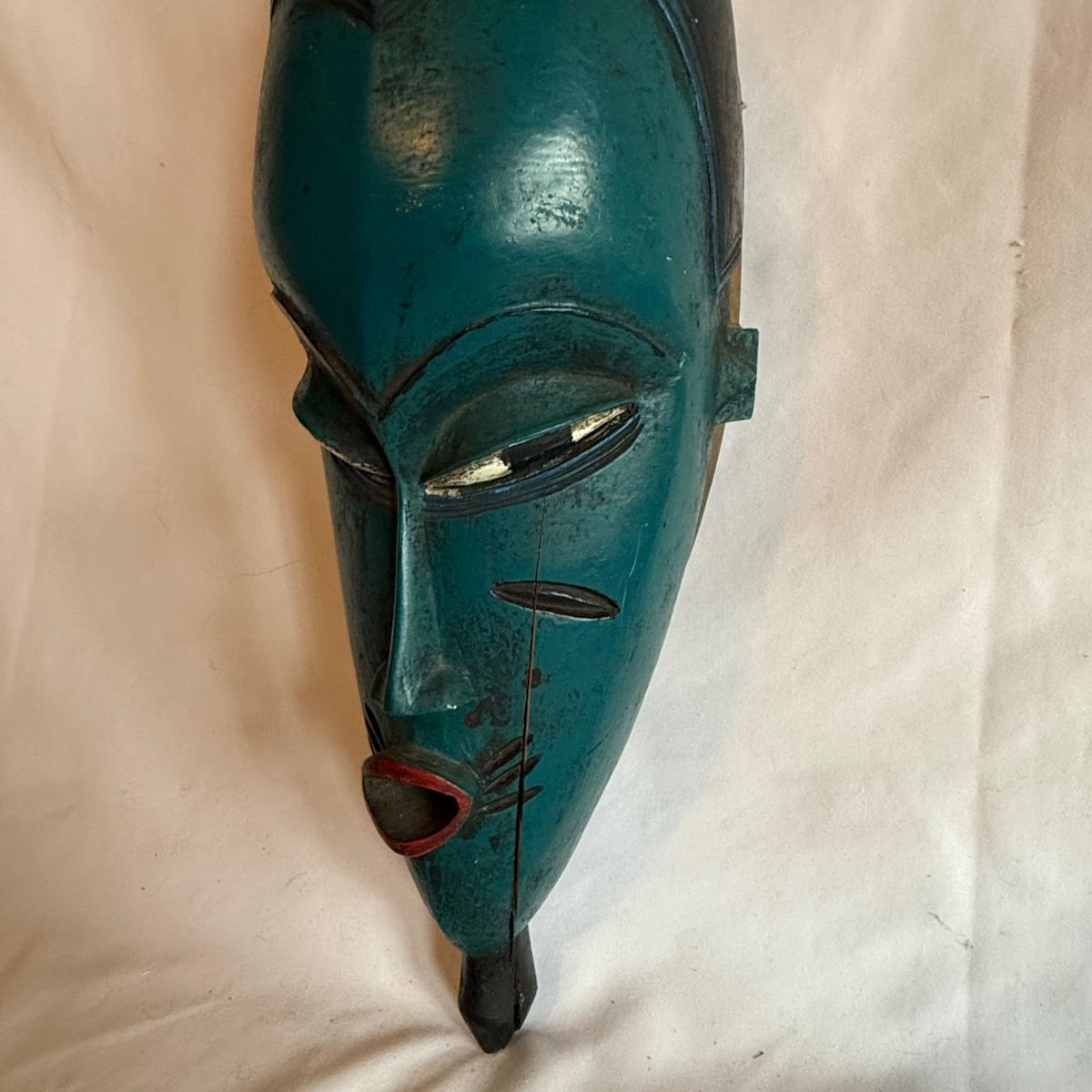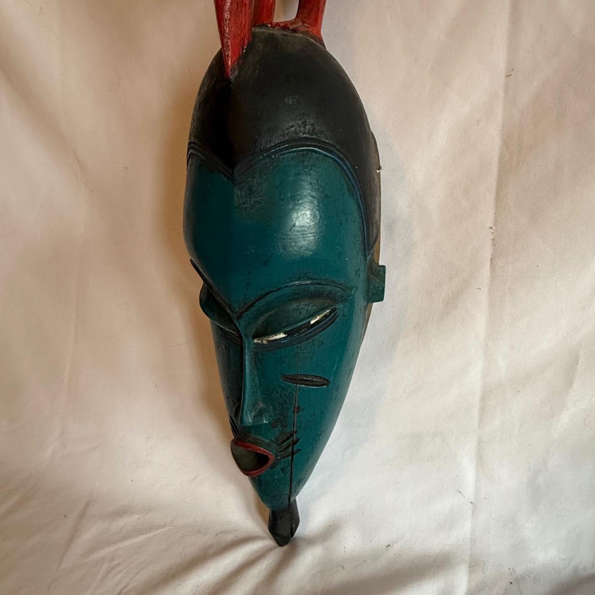 A carved wood mask that appears to be African and hand carved/hand painted. The mask measures approximately 5” X 5” X 24”H.