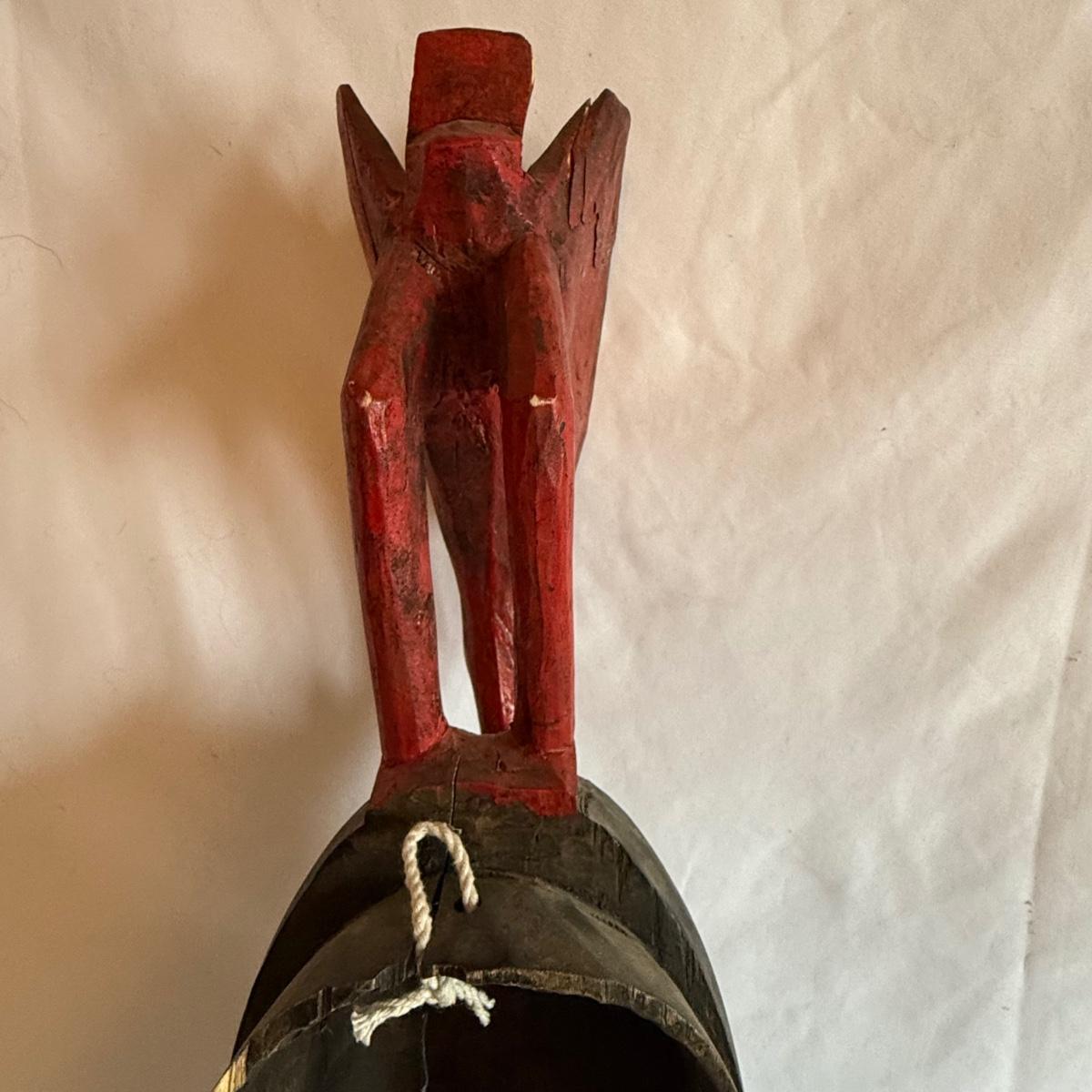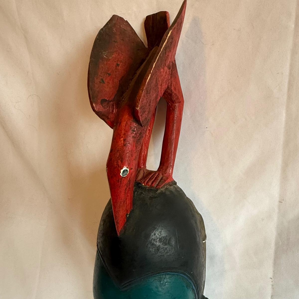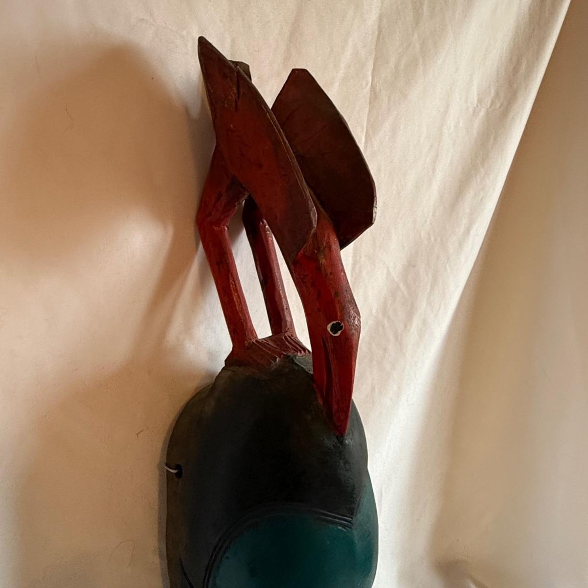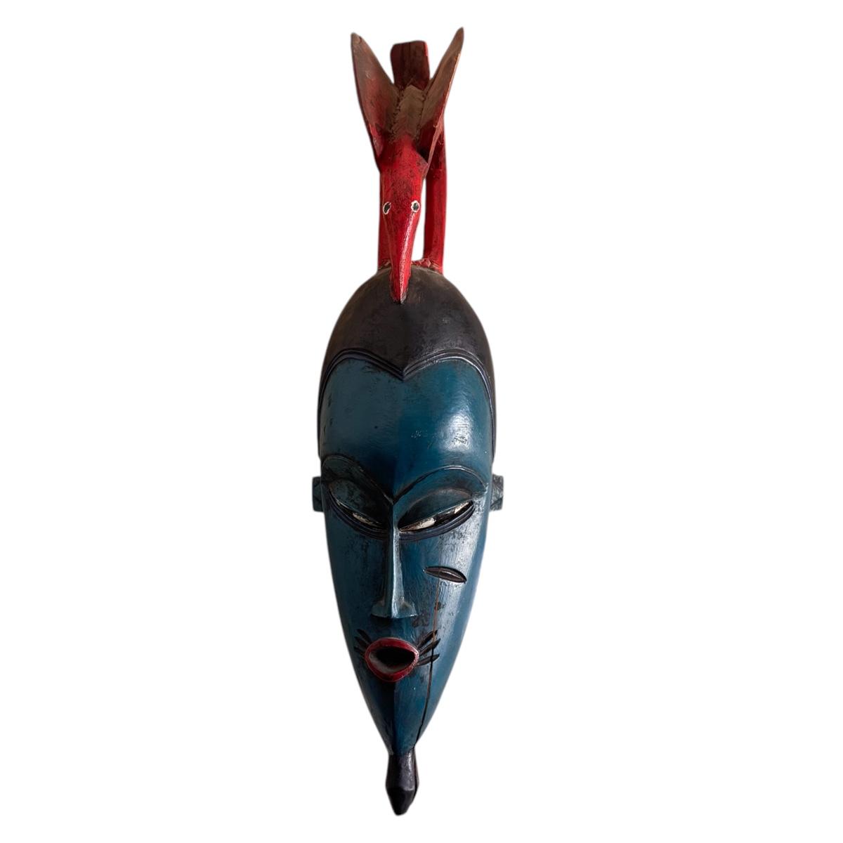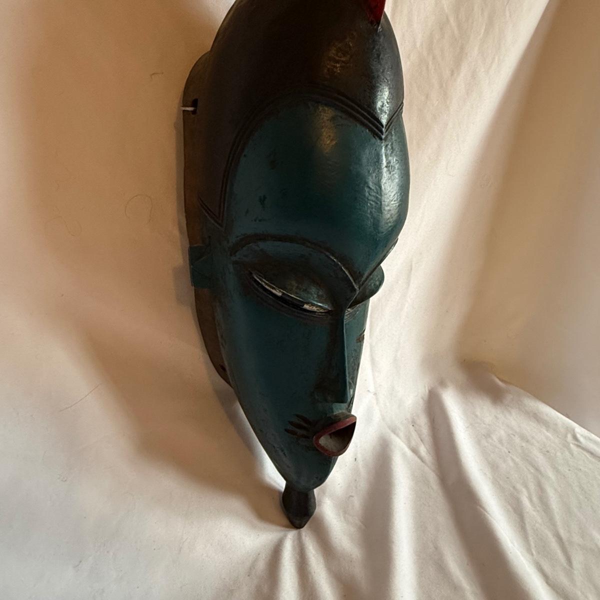A carved wood mask that appears to be African and hand carved/hand painted. The mask measures approximately 5” X 5” X 24”H.