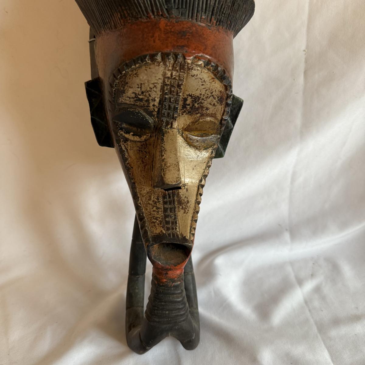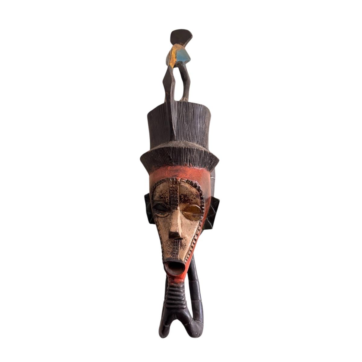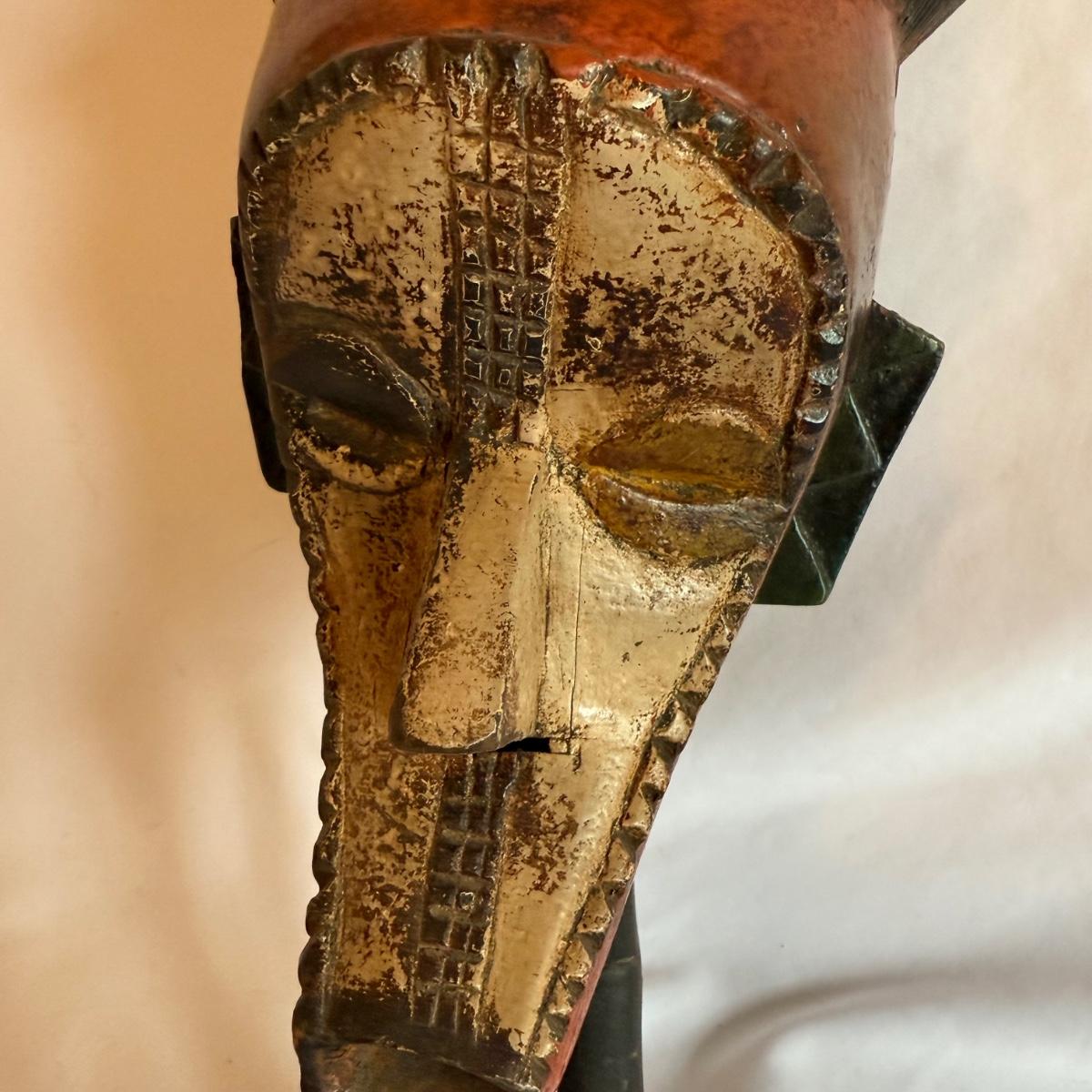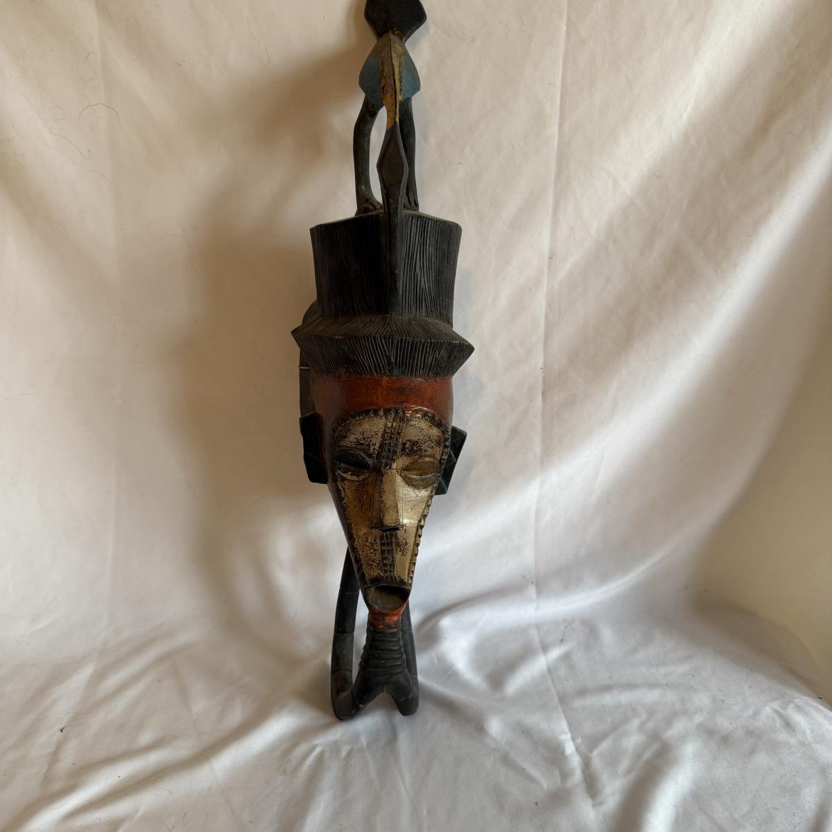 A carved wooden mask that appears to be African with lots of detail. The piece measures approximately 6” X 6.5” X 24”H.