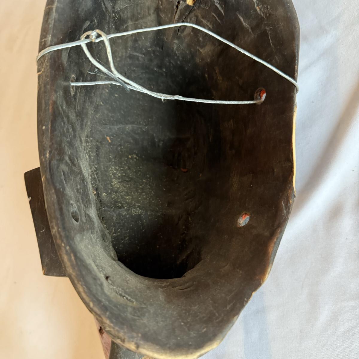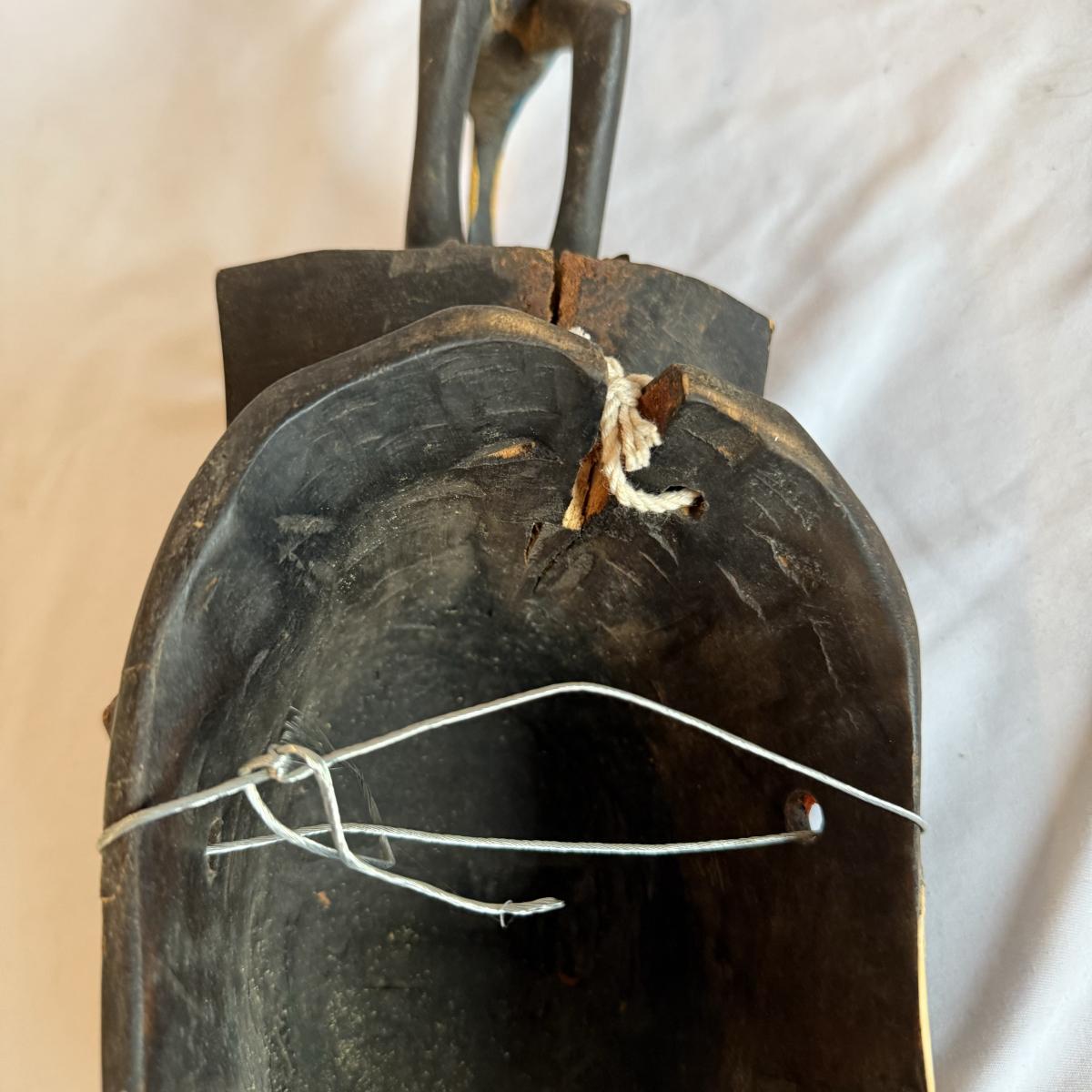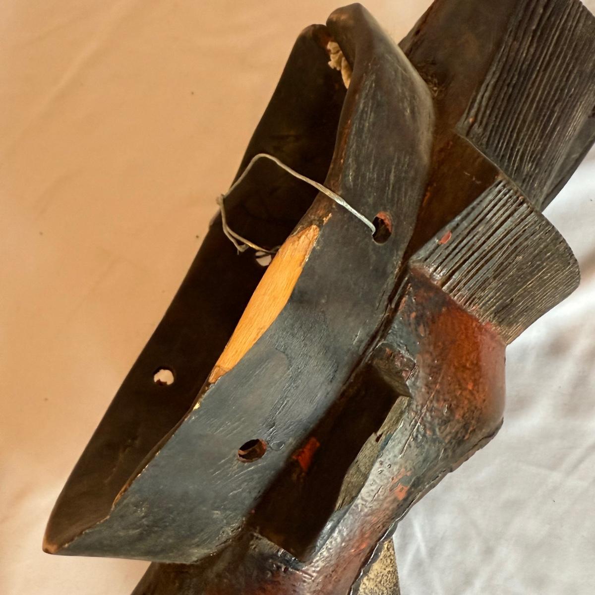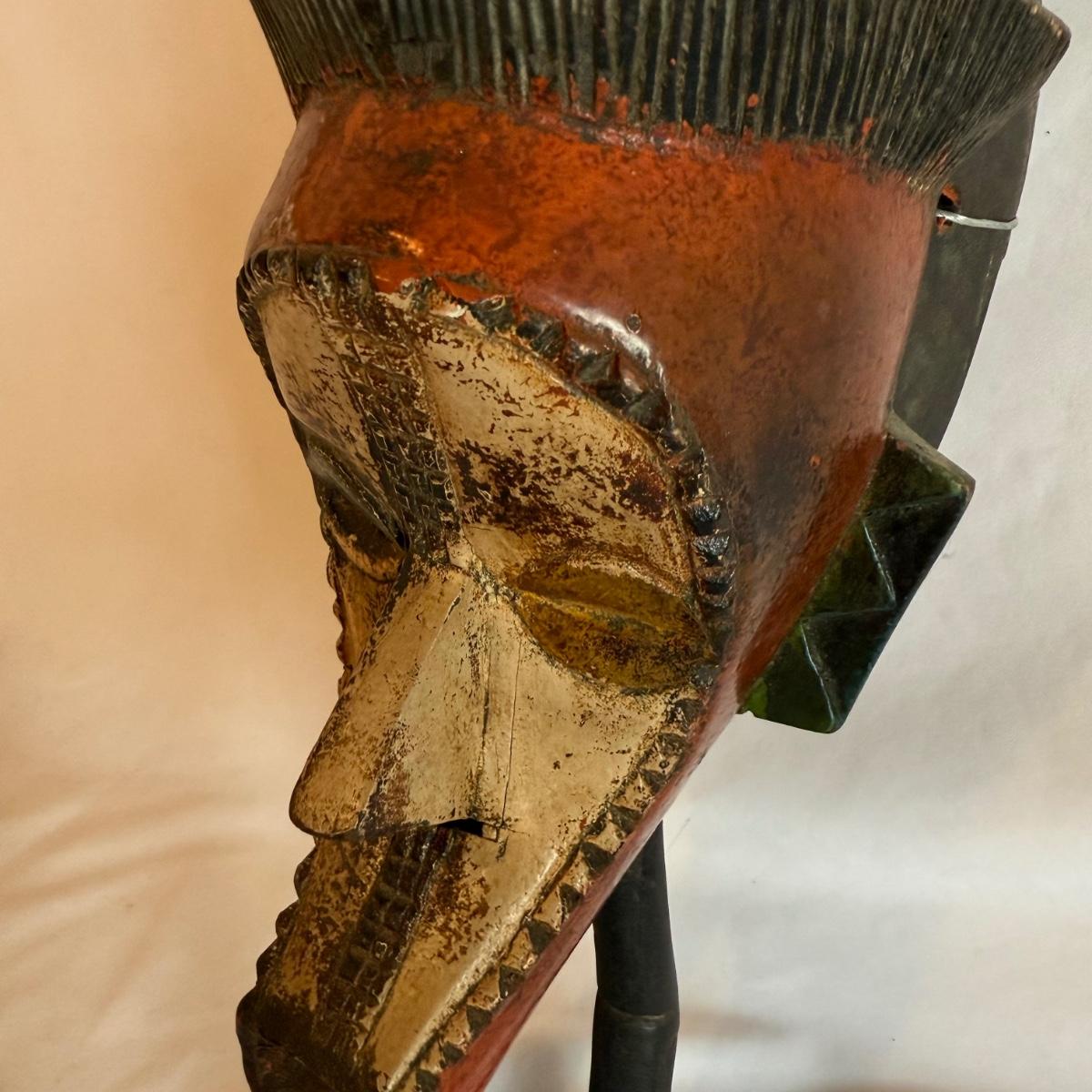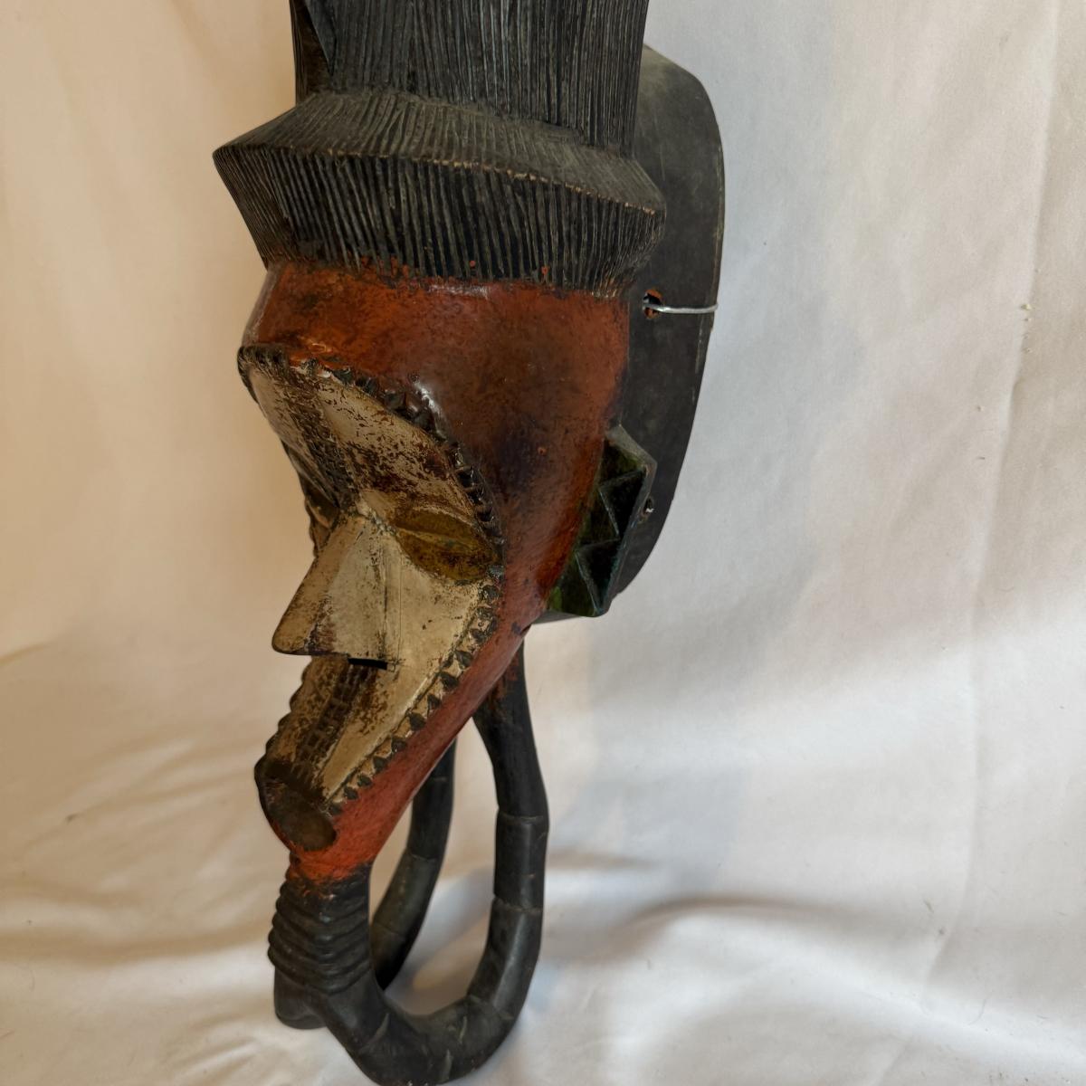 A carved wooden mask that appears to be African with lots of detail. The piece measures approximately 6” X 6.5” X 24”H.
