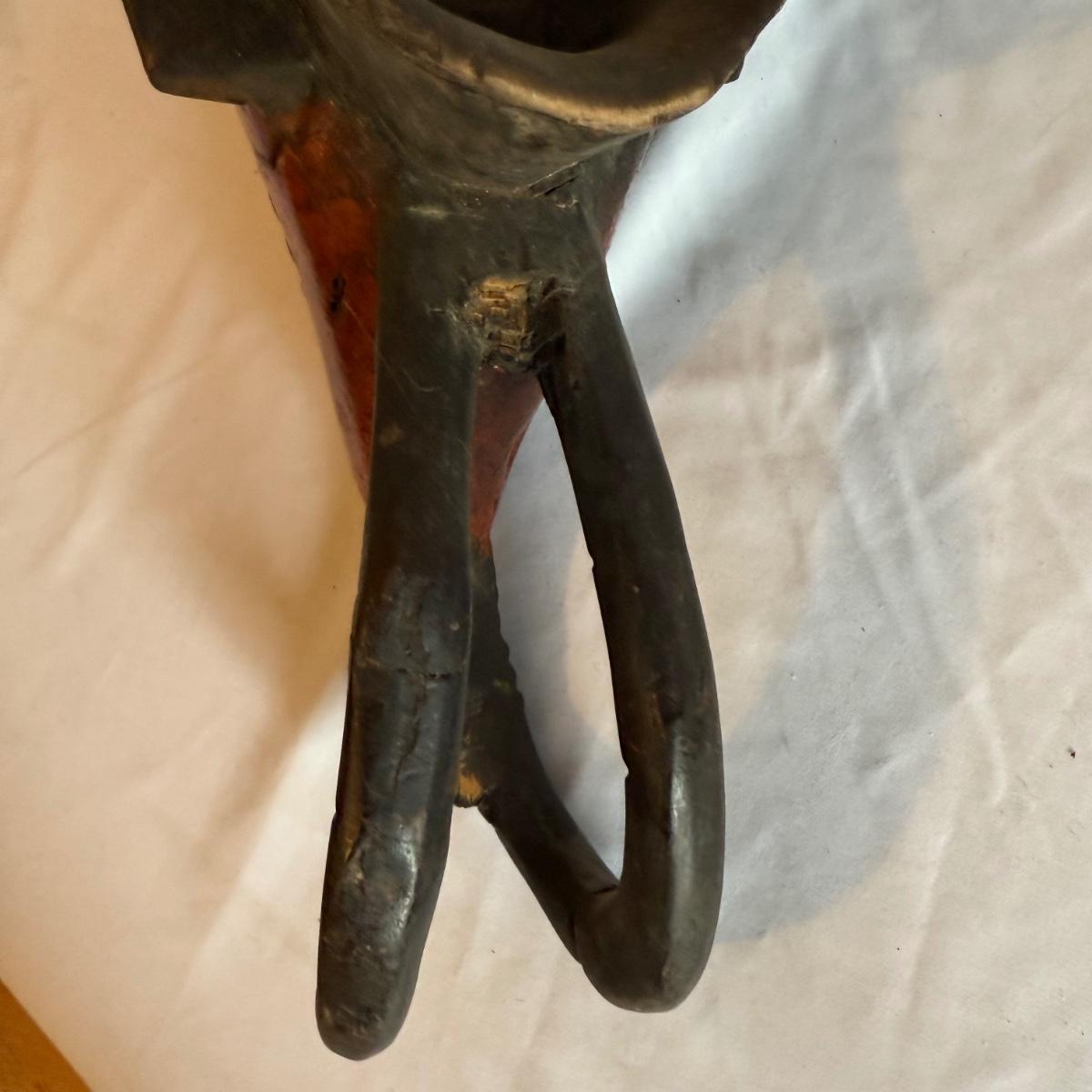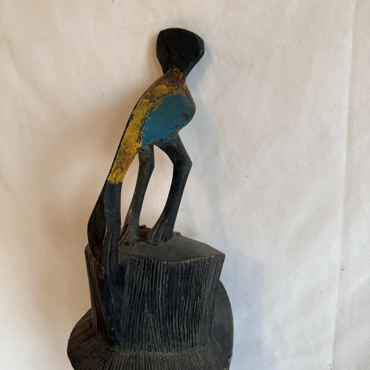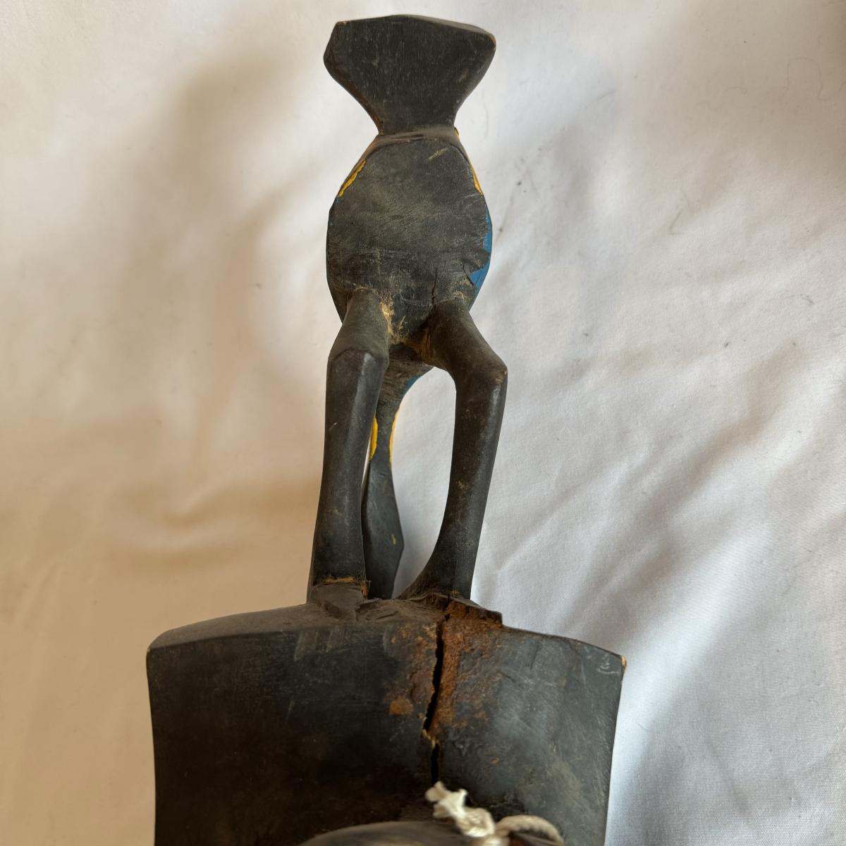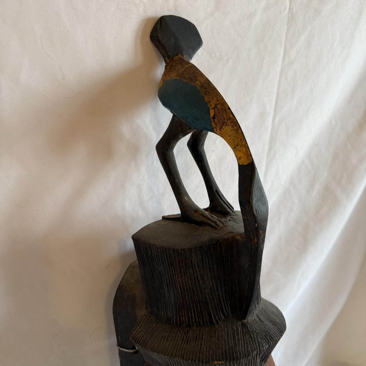 A carved wooden mask that appears to be African with lots of detail. The piece measures approximately 6” X 6.5” X 24”H.