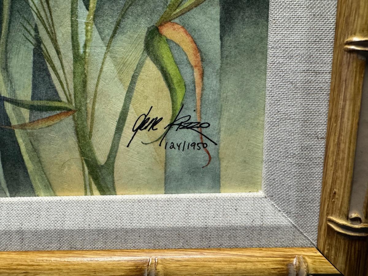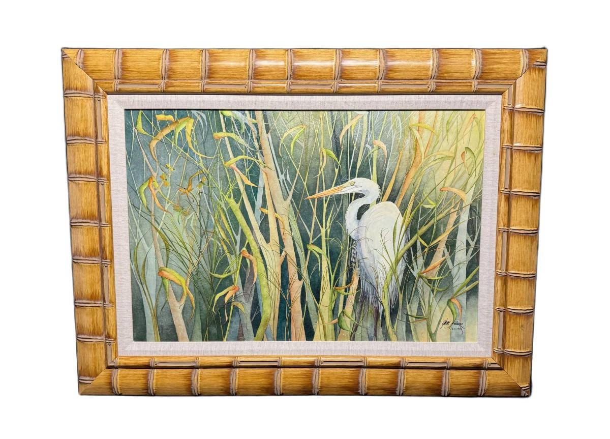 This depicts an egret, and has a bamboo inspired frame. It is numbered 124/1950. Measurement: 31” x 23”. [AG]
