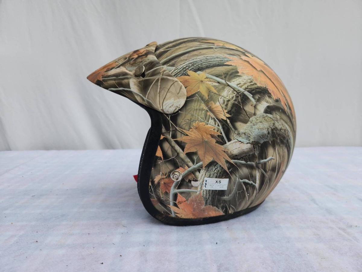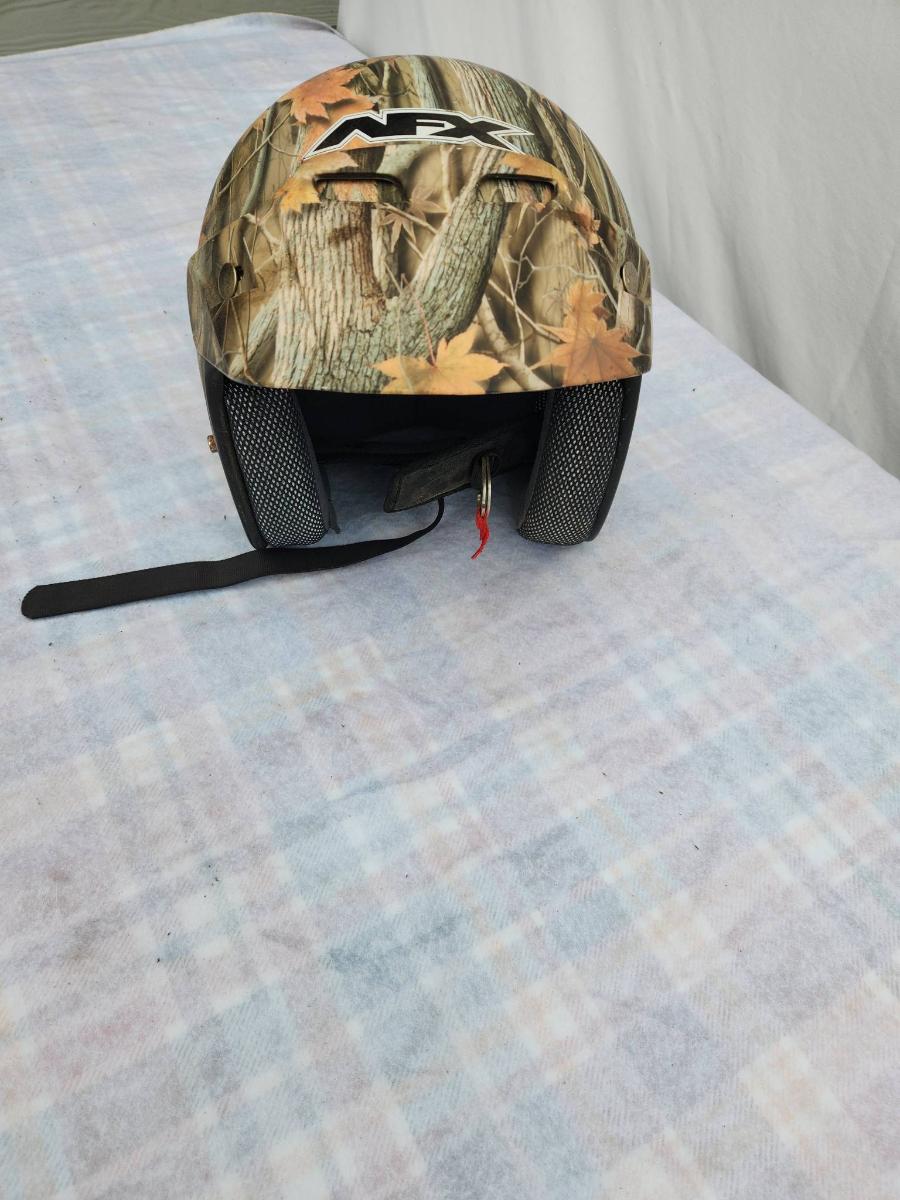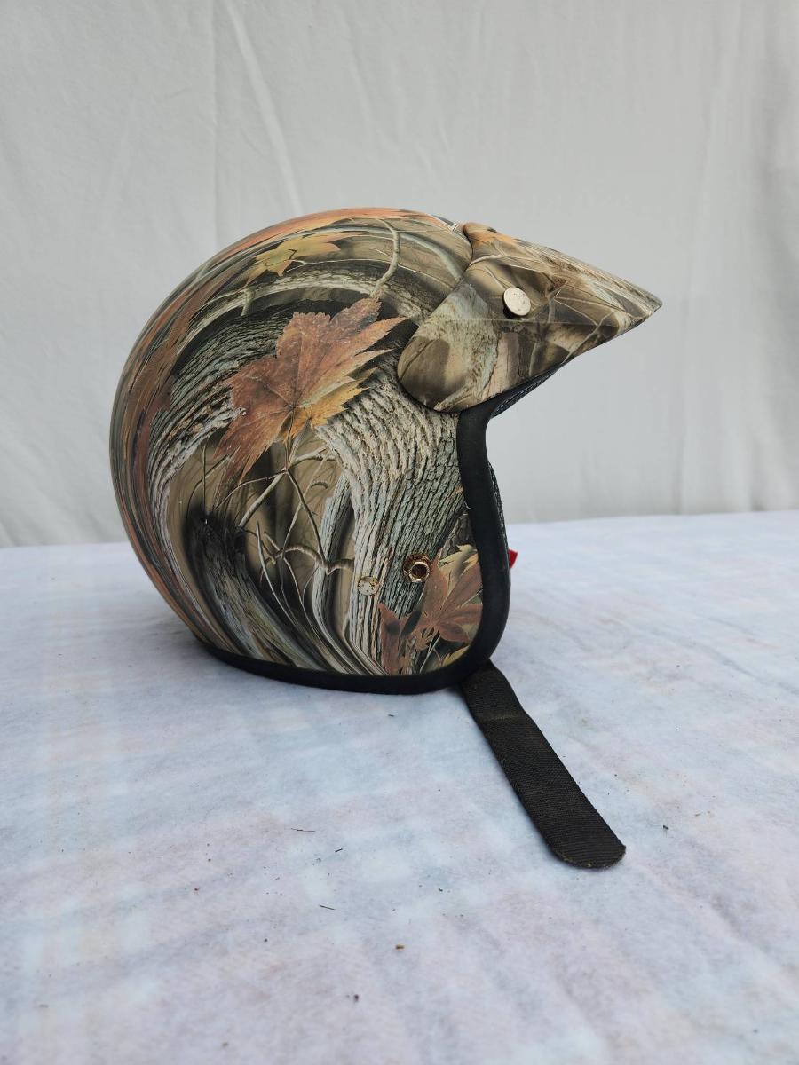 AFX half helmet featuring a camouflage pattern with autumn leaves. Includes an adjustable chin strap with quick-release buckle for secure fitting. Lightweight and designed for safety with padding along the edge. Ideal for outdoor enthusiasts and motorcyclists. Condition appears to be gently used, with minimal signs of wear.