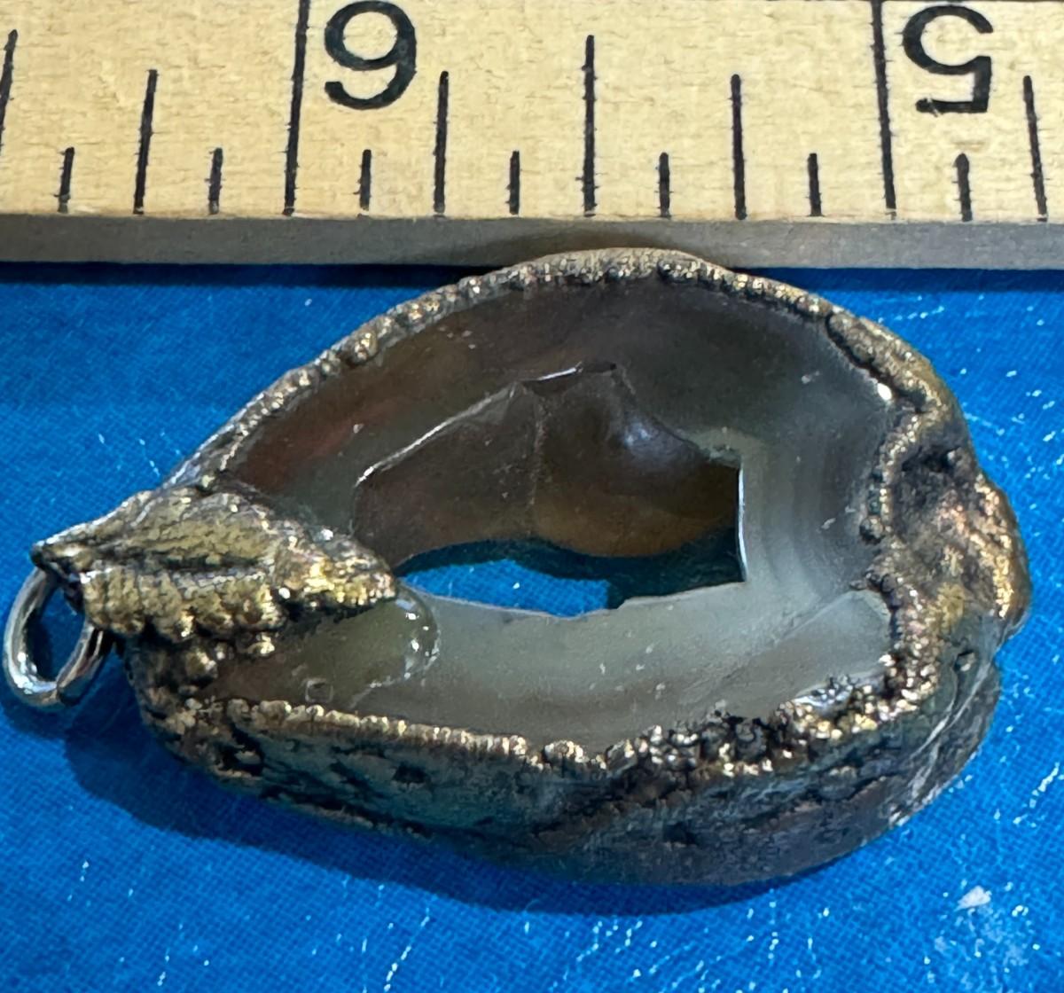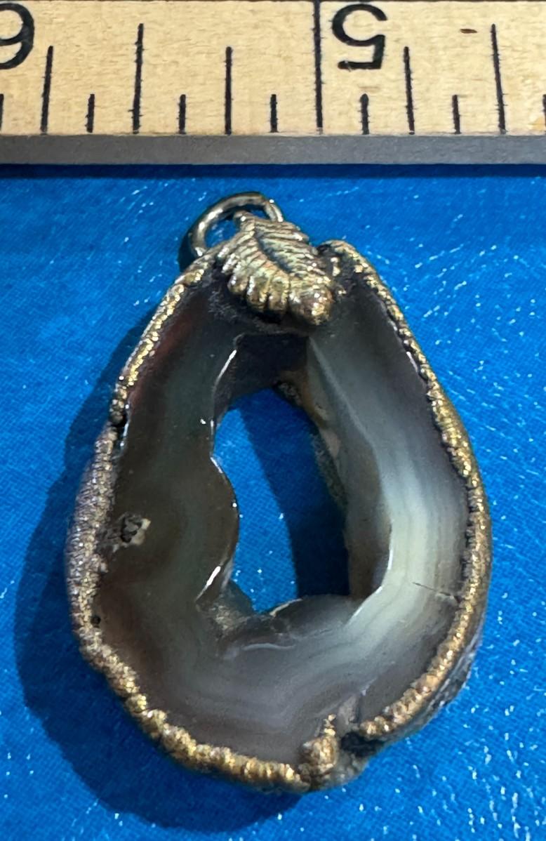 agate geode pendant, made from a polished slice of an agate geode, featuring sparkling druzy crystals within its cavity and a metallic electroplated edge and bail for use as jewelry.