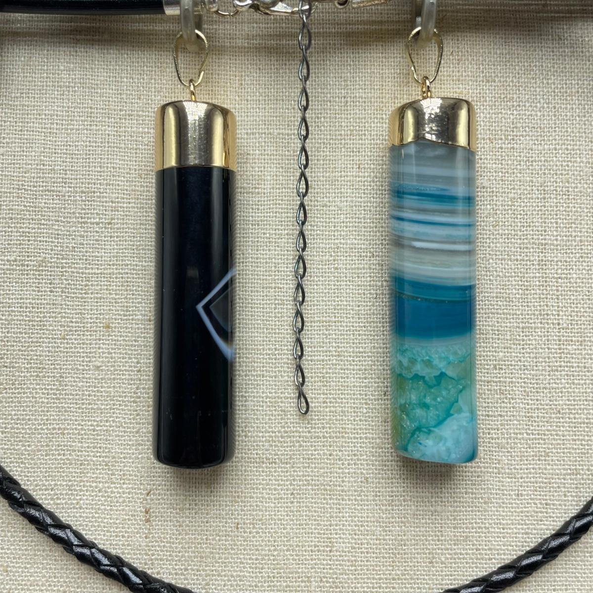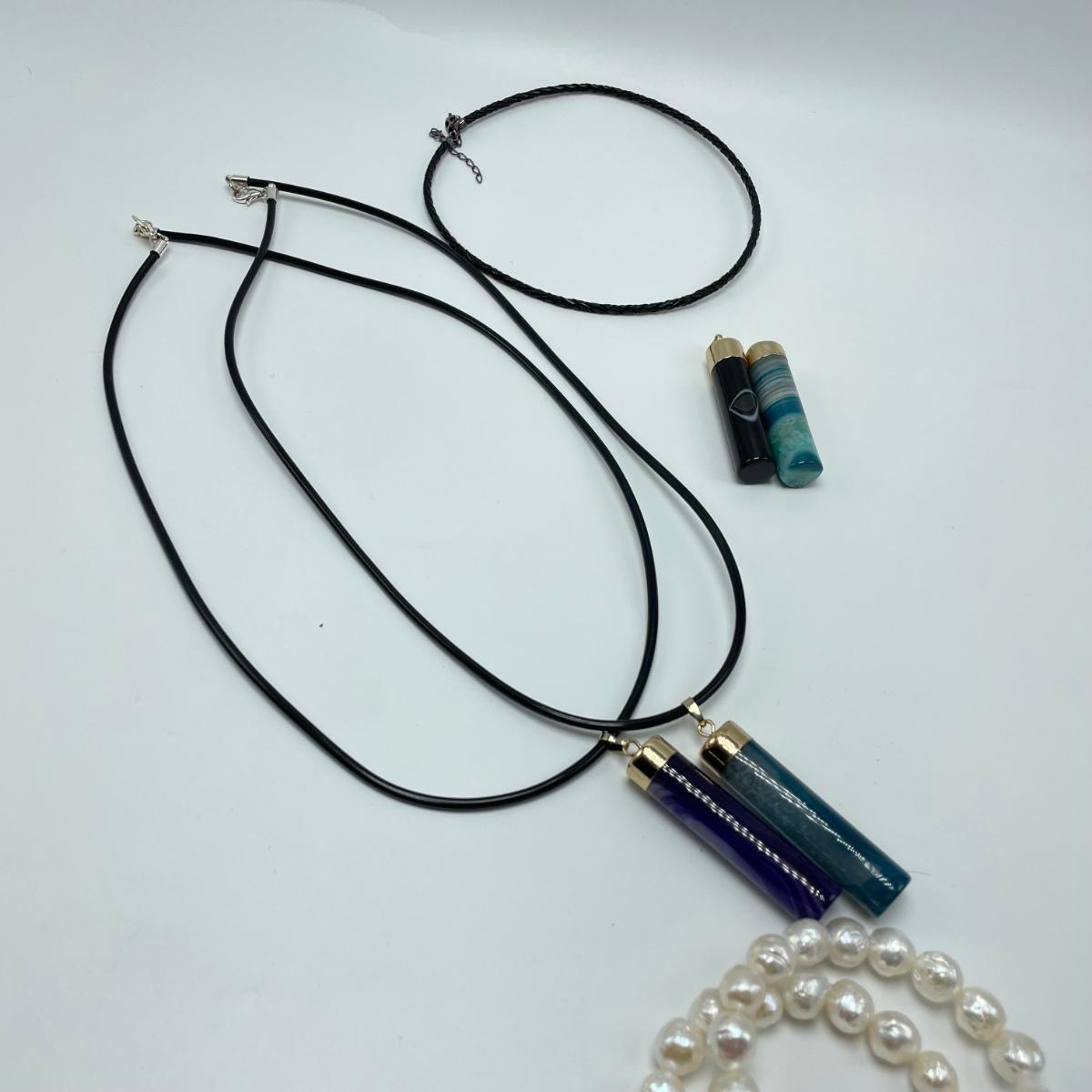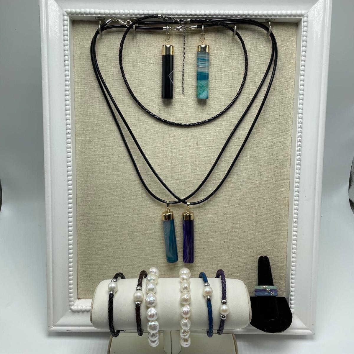 Four pendants that appear to be polished agate with two 24” vinyl like necklaces. Lot also includes three Jade like rings with 14K stamped for their gold accents. Lot also includes a black leather choker, perfect for another agate pendant, four colors of leather with Pearl centerpieces and two elastic Edison Pearl-like beads. Please see photos for all markings found. We cannot guarantee the authenticity of the gemstones. All sales are final. No returns or refunds. Please bid accordingly.