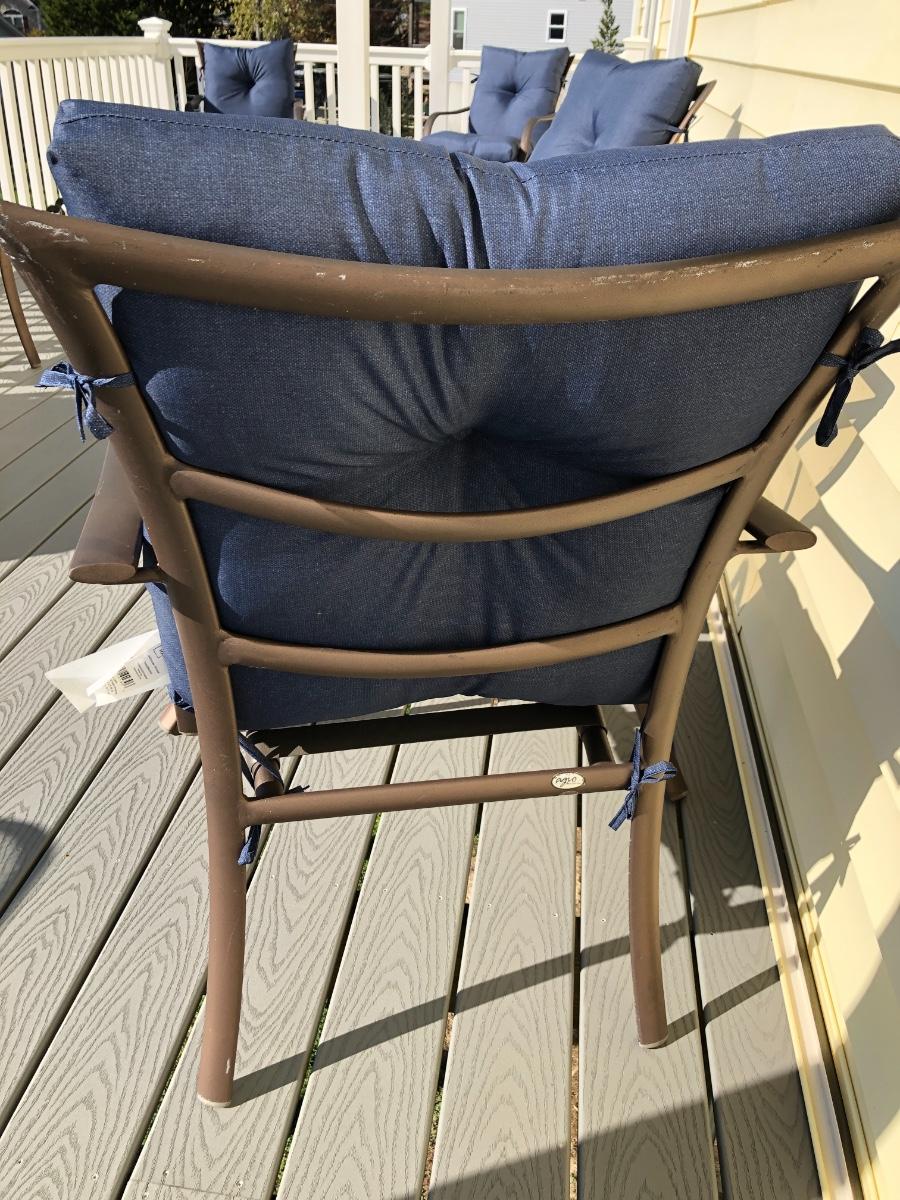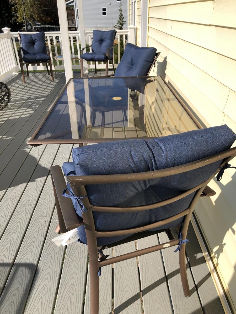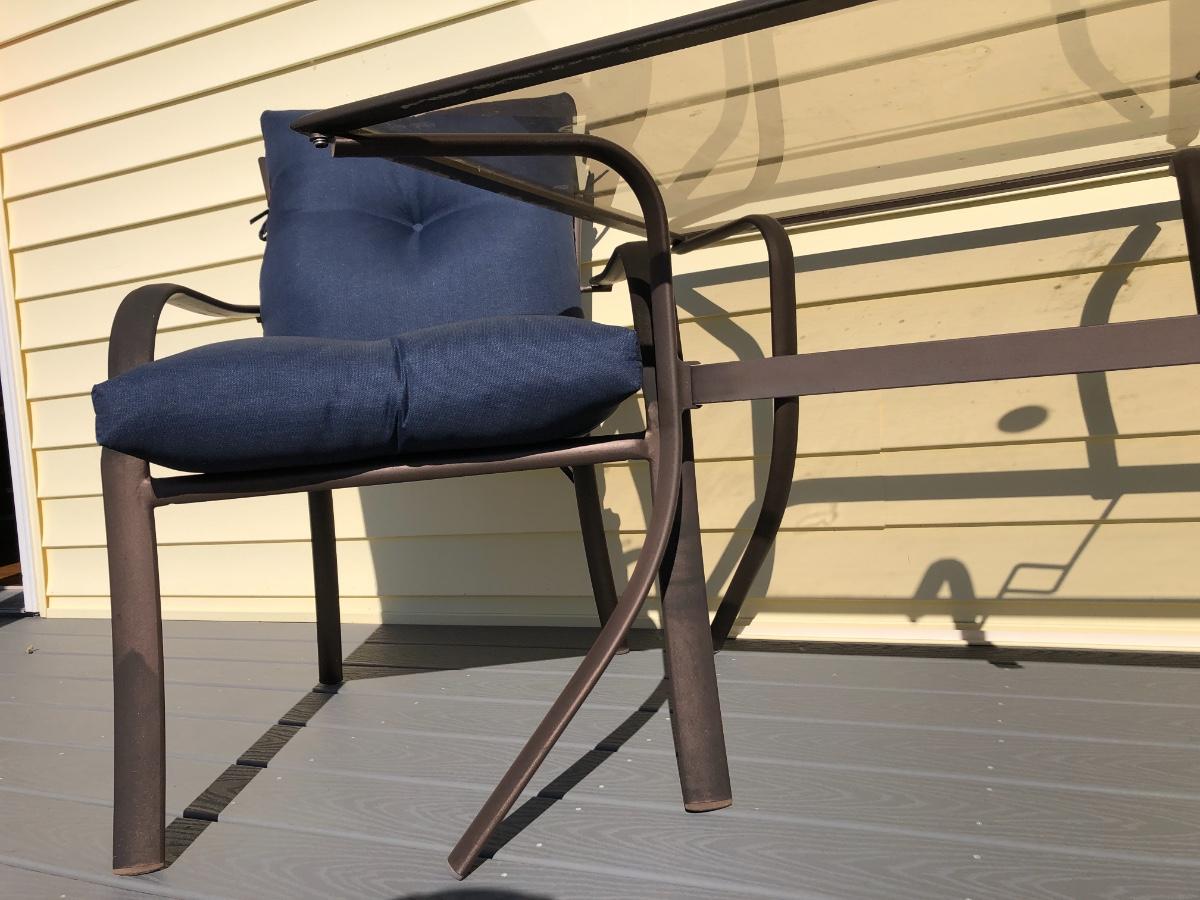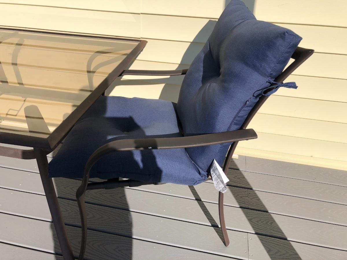 6 Piece Patio Set Tables Chairs / Stand Alone Umbrella / Plus COMFORTABLE FRESH Blue Seat Cushions