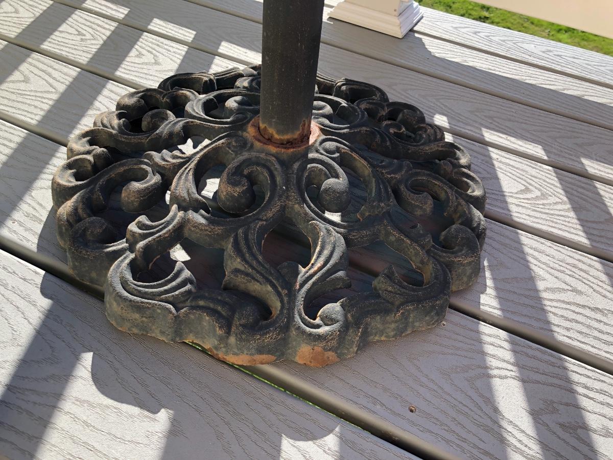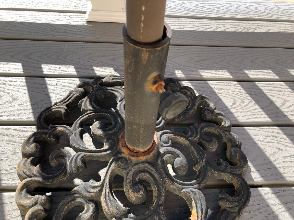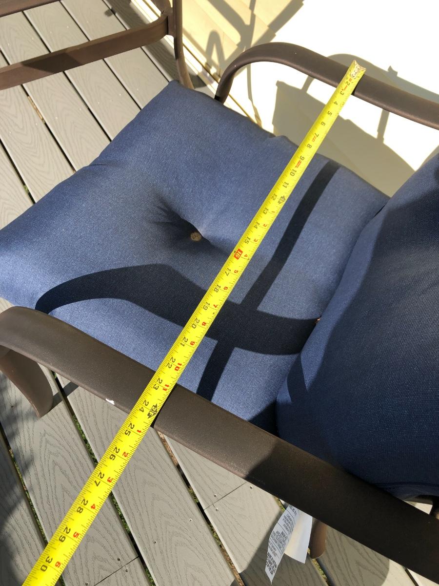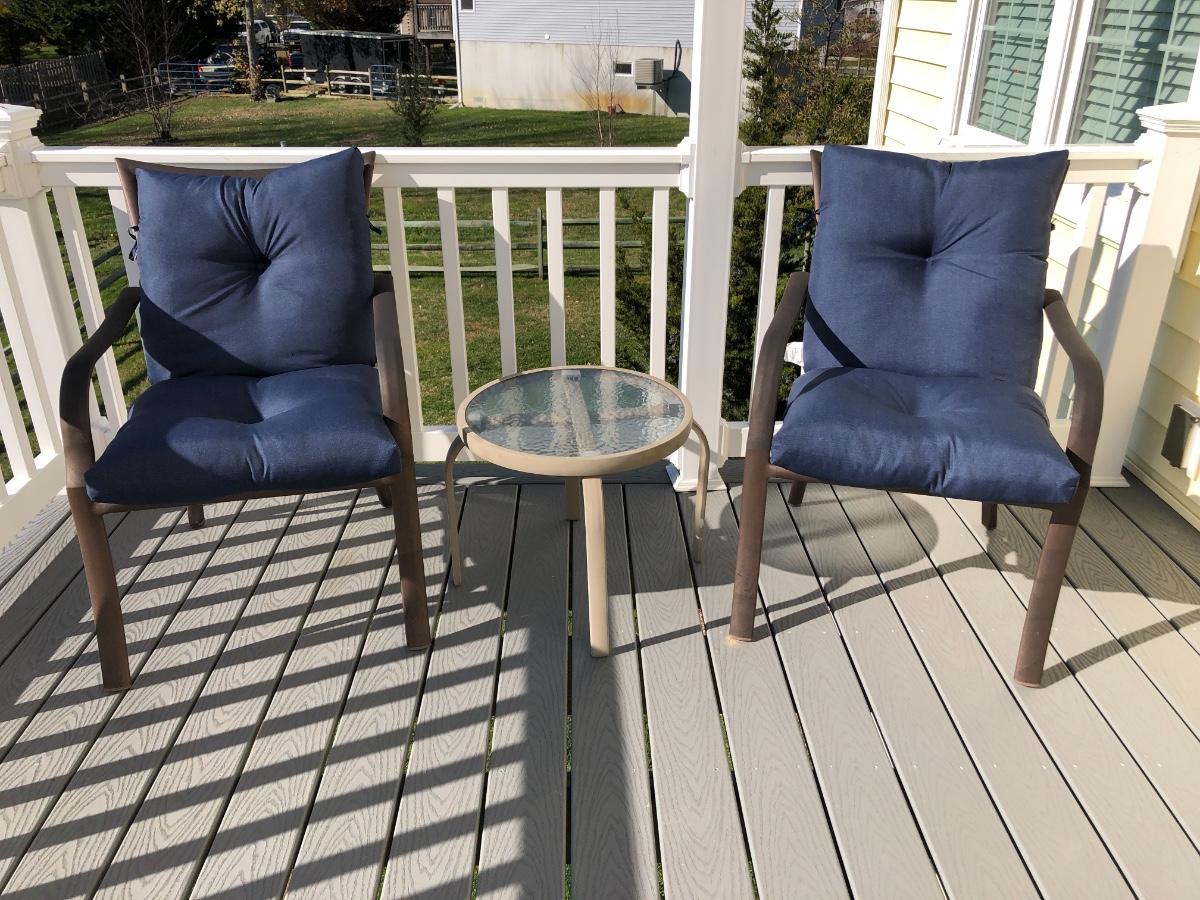 6 Piece Patio Set Tables Chairs / Stand Alone Umbrella / Plus COMFORTABLE FRESH Blue Seat Cushions