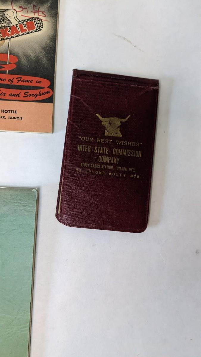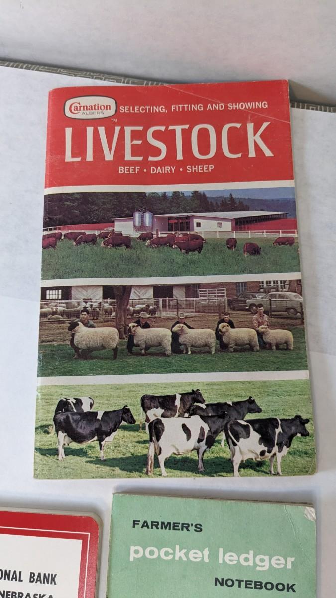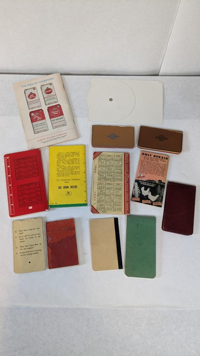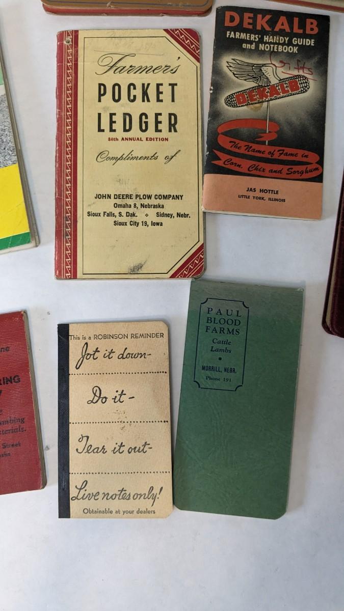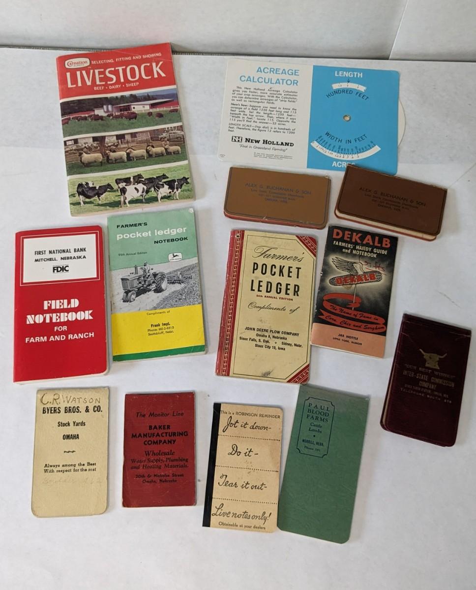 a great assortment of agriculture ephemera. Includes Dekalb guide and notebook circa 1956 that's unused, a used John Deere ledger book from the 60's, acreage calculator, Carnation Livestock book from 72, good advertising notepads from Omaha and other surrounding areas, and neat Robinson Reminder tear out notepad. All in good display and some useable condition!