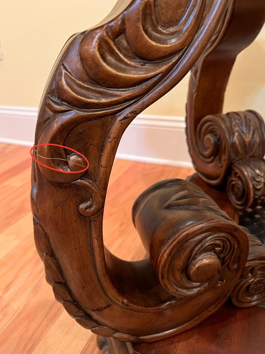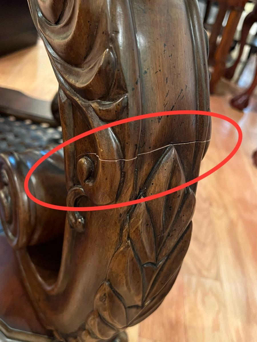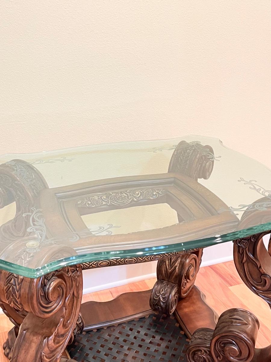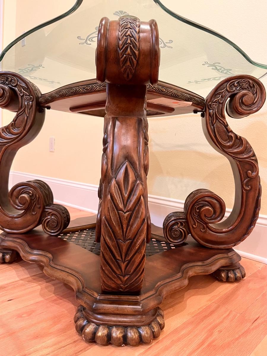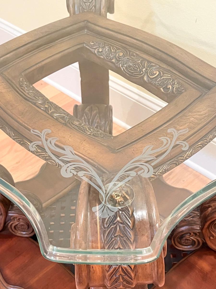 26” H x 31” W x 27” D ~ One leg has a crack in it as seen in photo but not broken off. It still remains extremely sturdy. Bottom shelf is metal. This piece is super duper heavy. You will need help!! Piece is not solid wood, per say, it is made with wood, and appears to be some type of resin based because of its weight.
