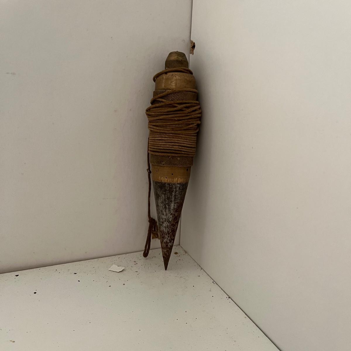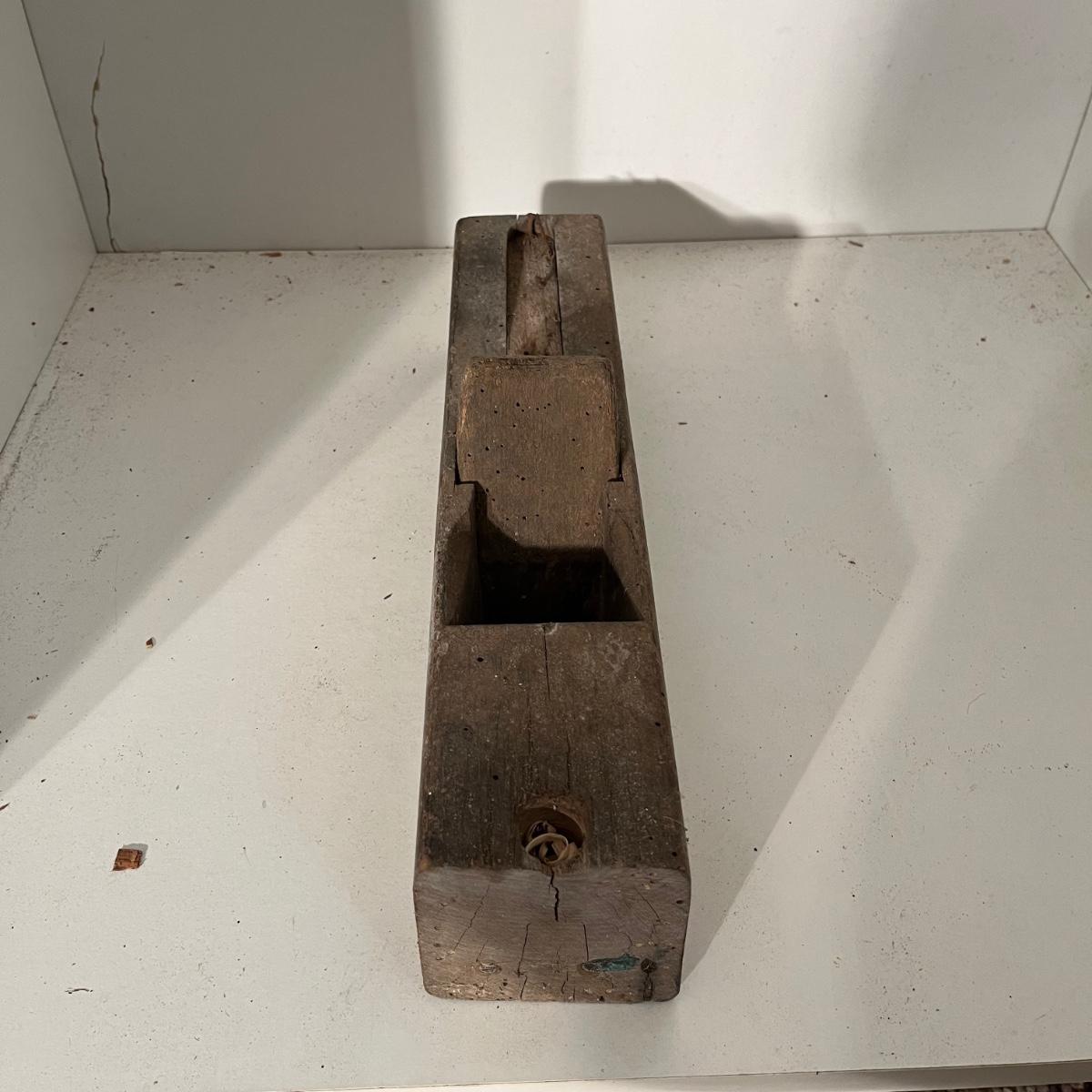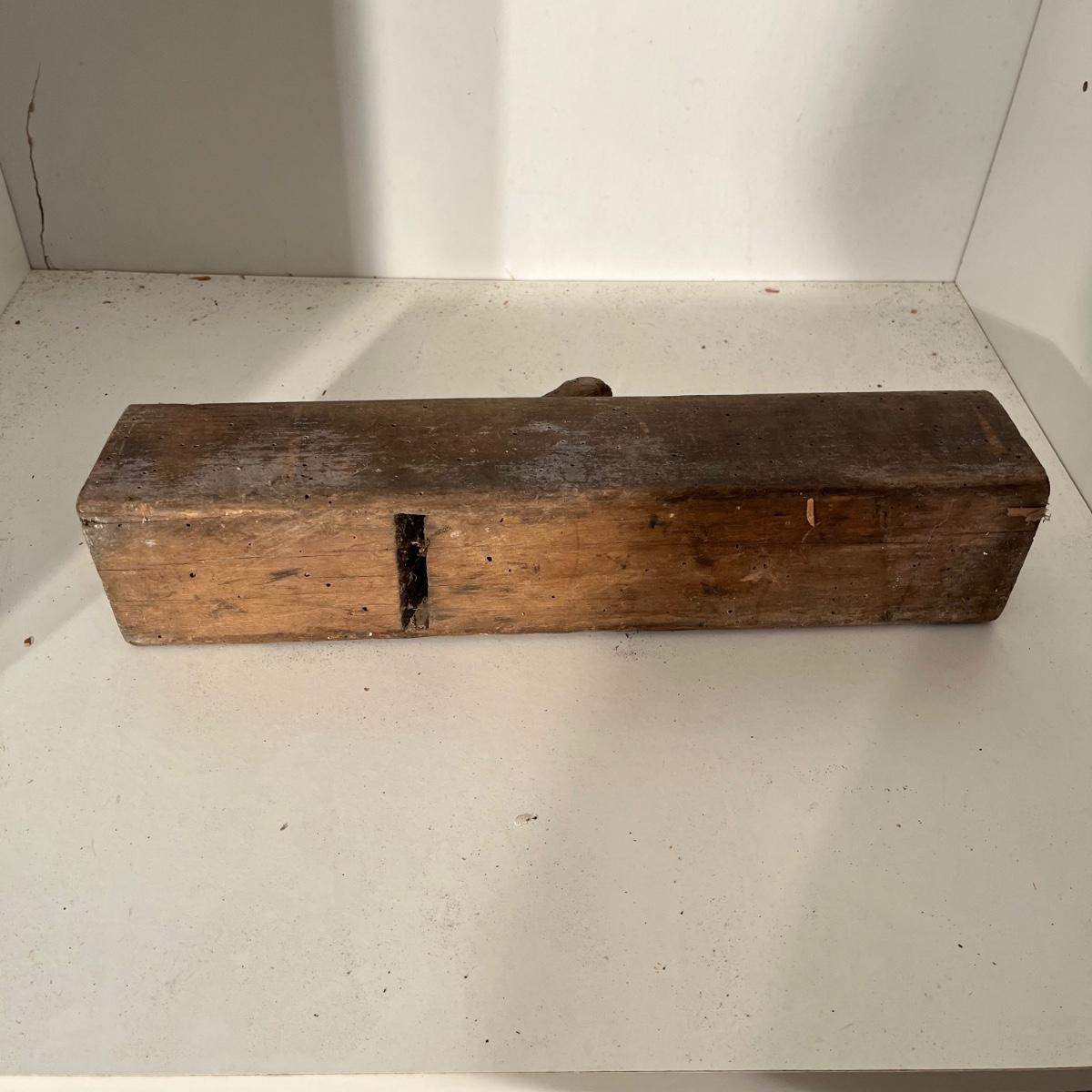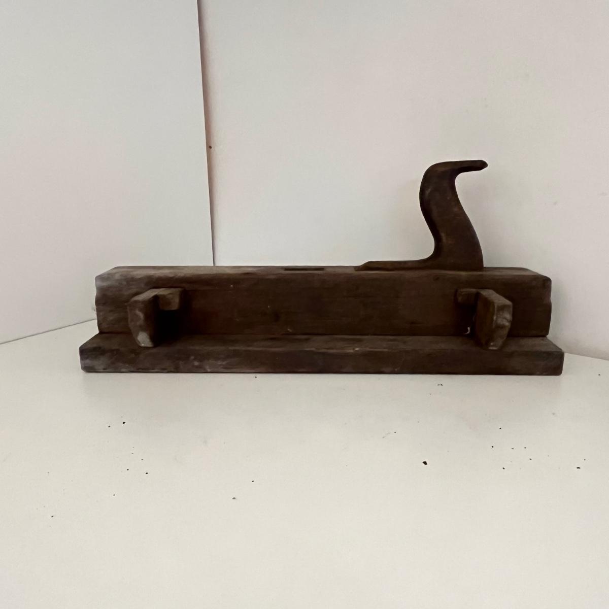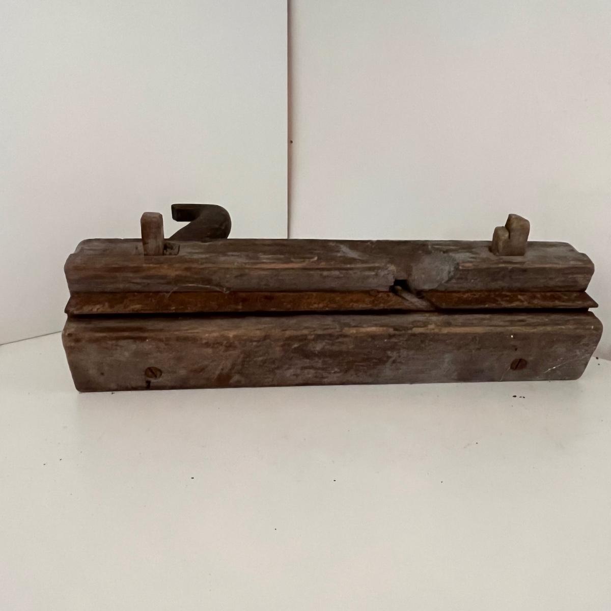 Lot includes a wooden Aikman hat stretcher, two wooden woodworking tools and a plum bob. Hat stretcher measures 6” x 7.5” x 2.5”.