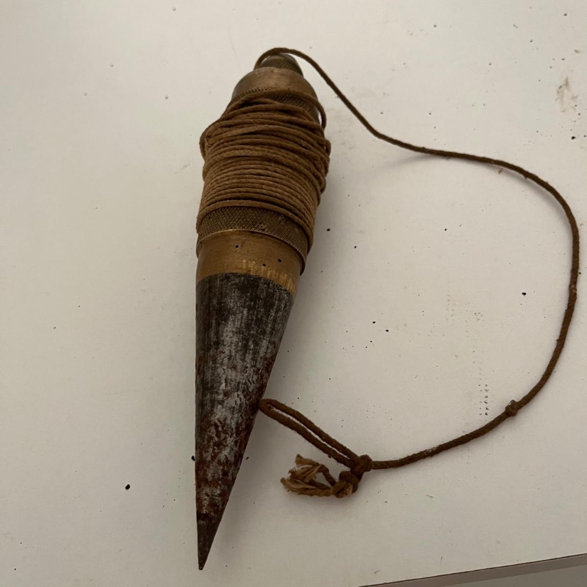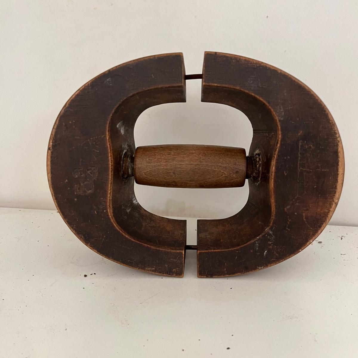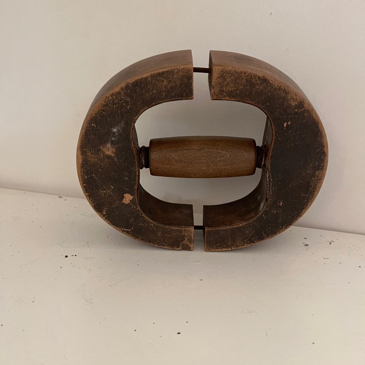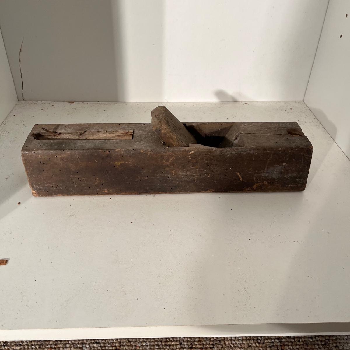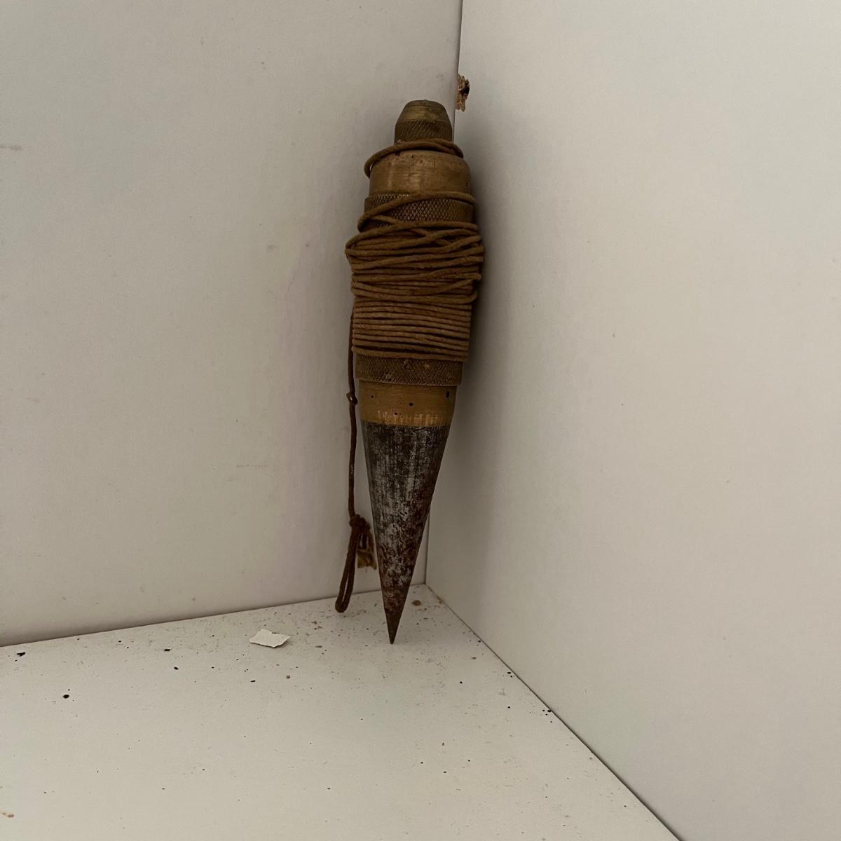 Lot includes a wooden Aikman hat stretcher, two wooden woodworking tools and a plum bob. Hat stretcher measures 6” x 7.5” x 2.5”.