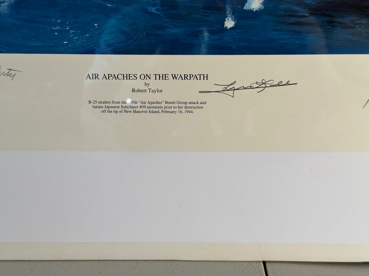 Certificate of Authenticity says this limited edition print is signed by the artist along with 4 pilots and crew who flew the B-25 with 345th Air Apache Bomb Group in the Pacific. Numbered 232/600