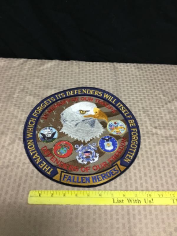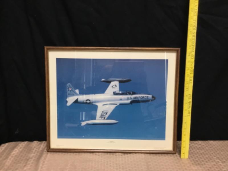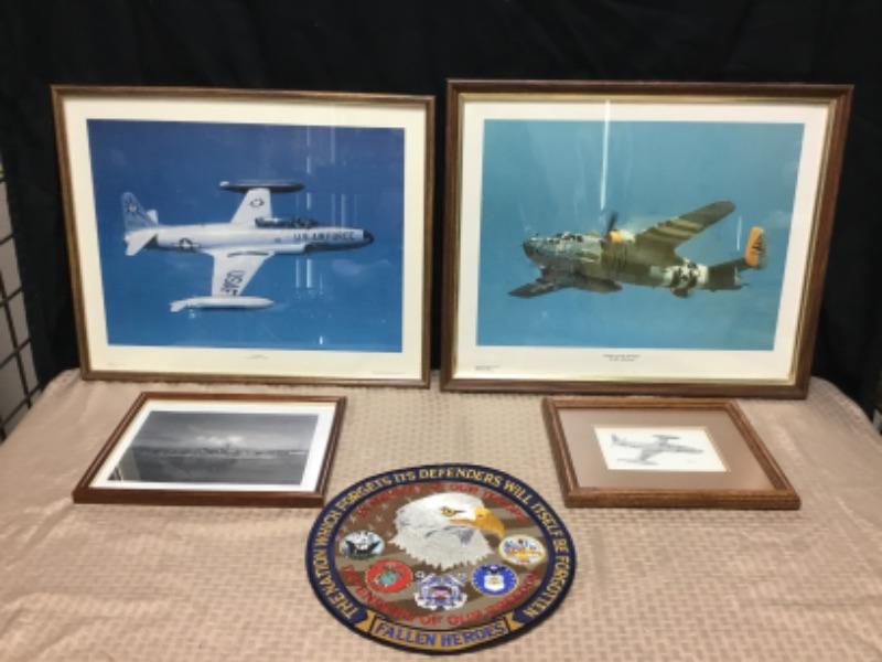 Three air force pictures, one ship picture, one In memory of our troops patch