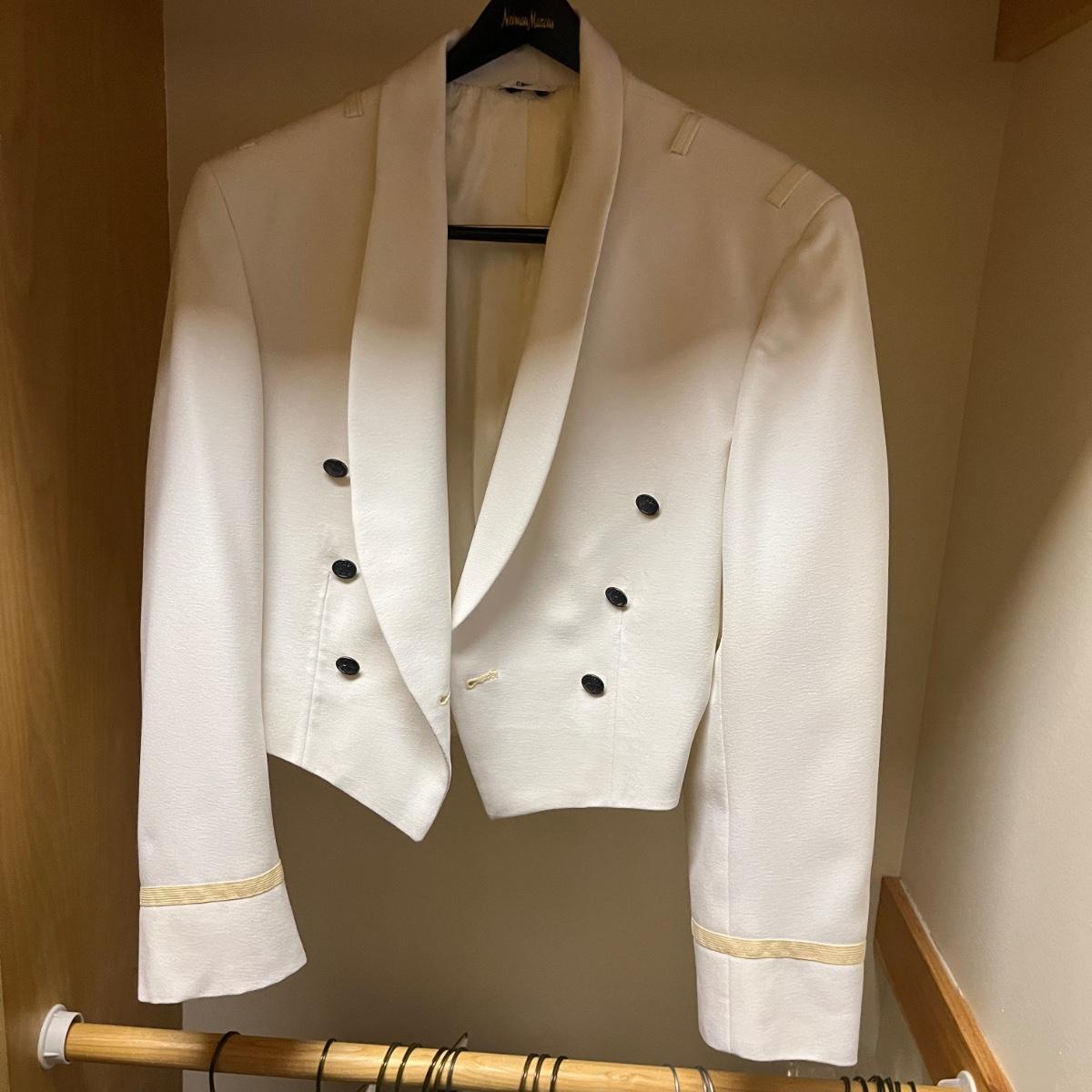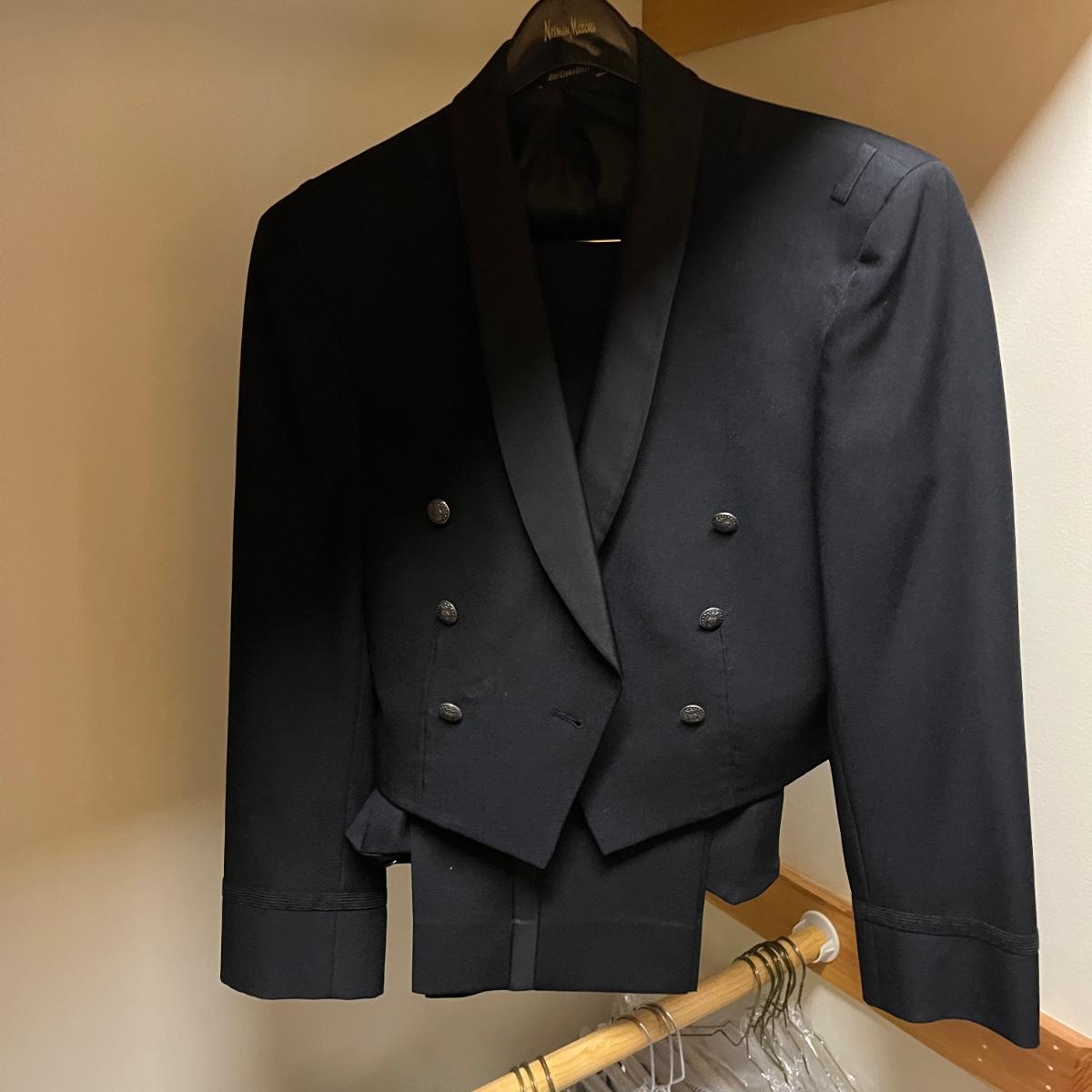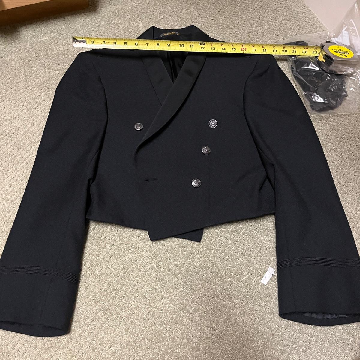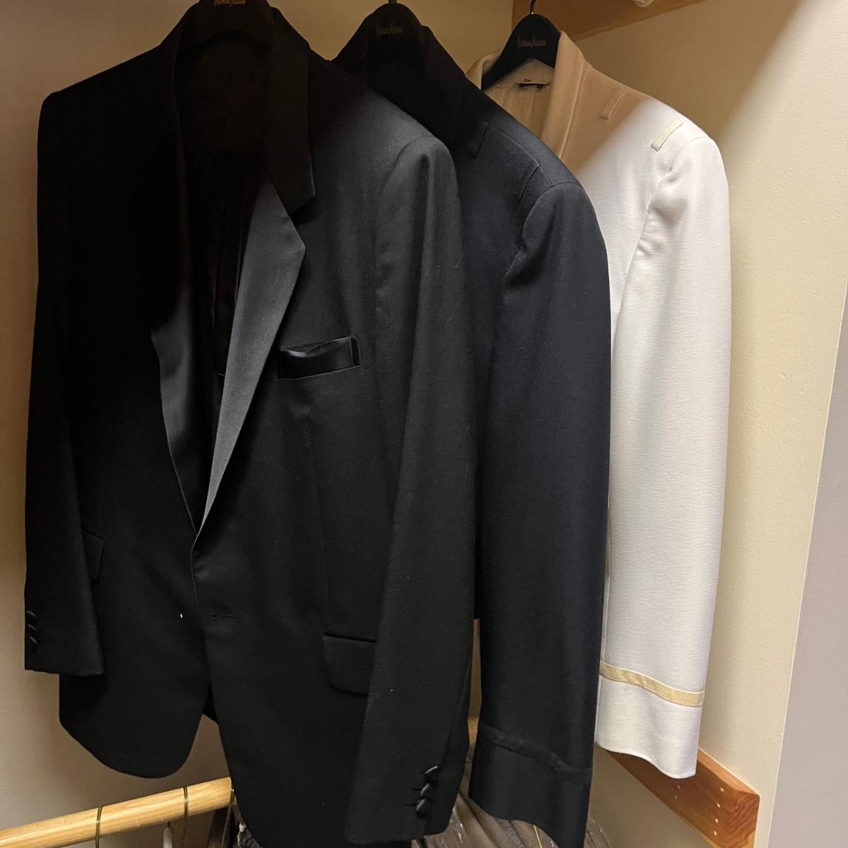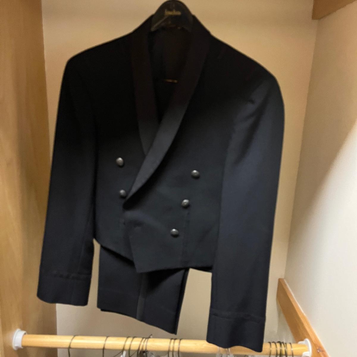 Lot includes an Air Force Officers black and white mess jacket, trousers and a tuxedo with cummerbund and ties. See images for sizes.