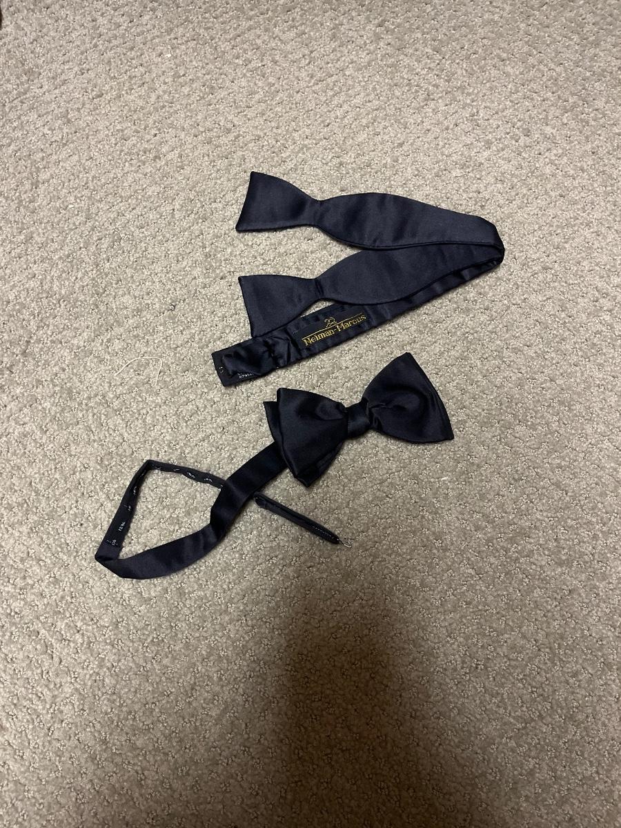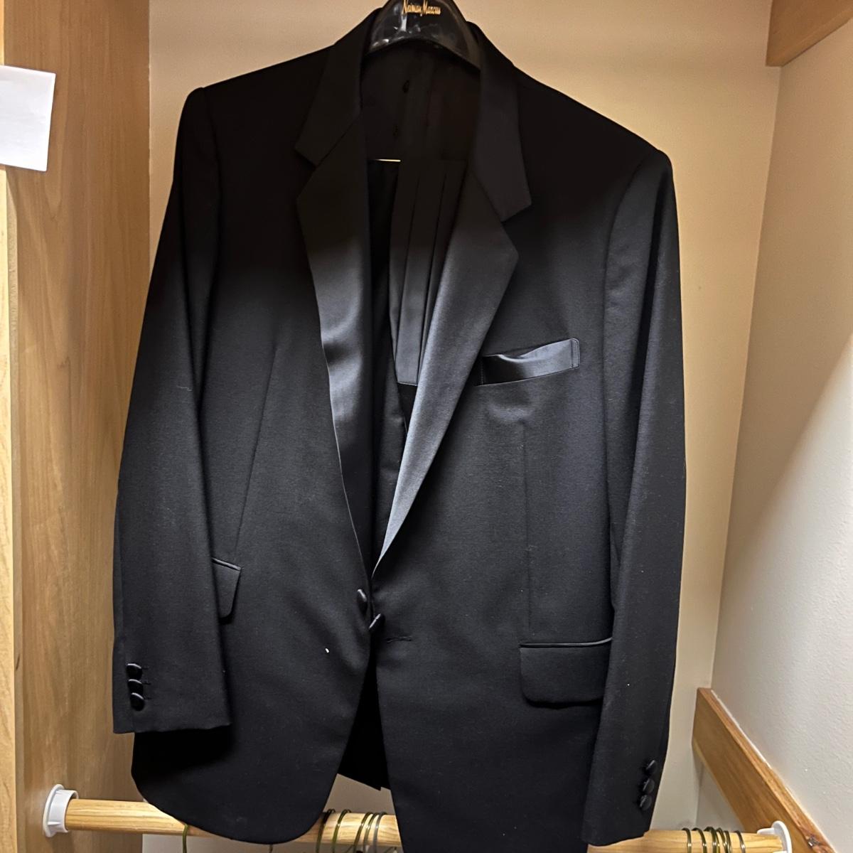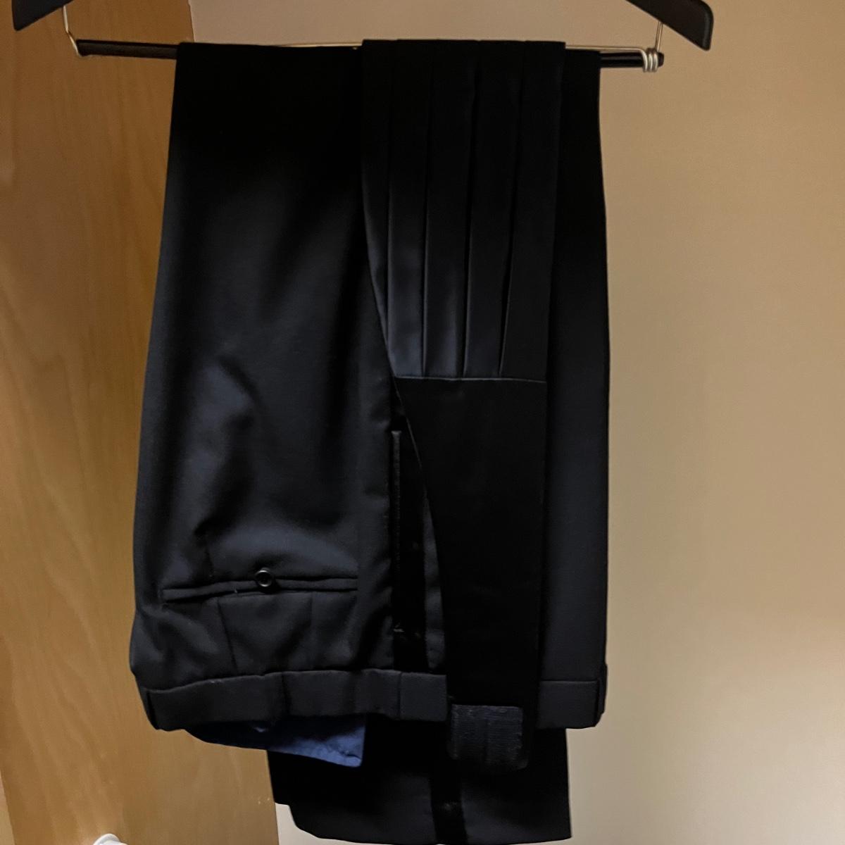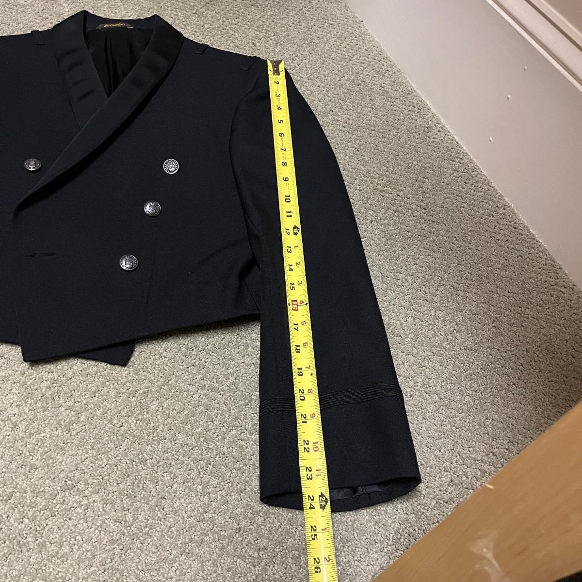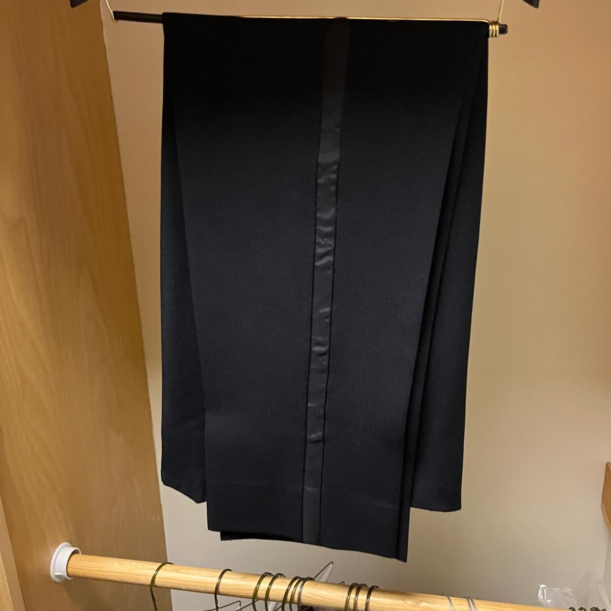 Lot includes an Air Force Officers black and white mess jacket, trousers and a tuxedo with cummerbund and ties. See images for sizes.