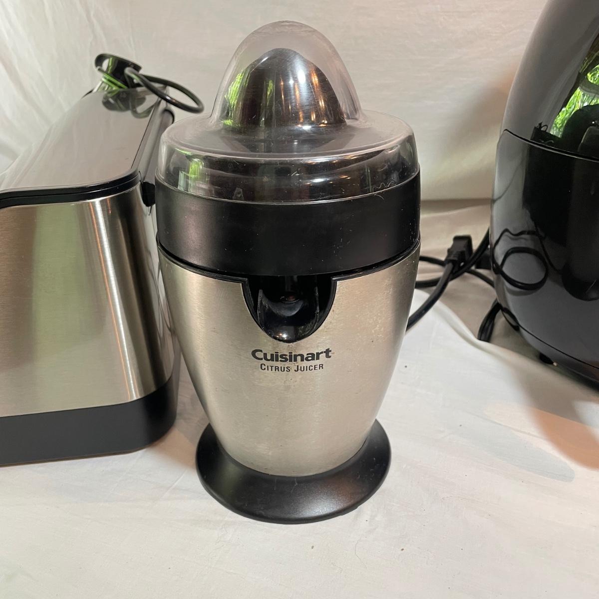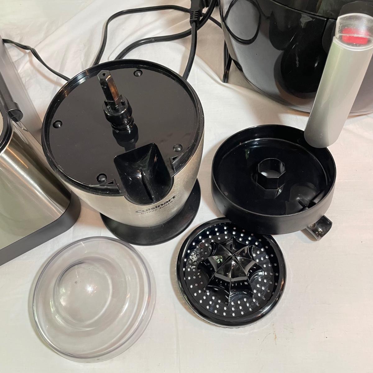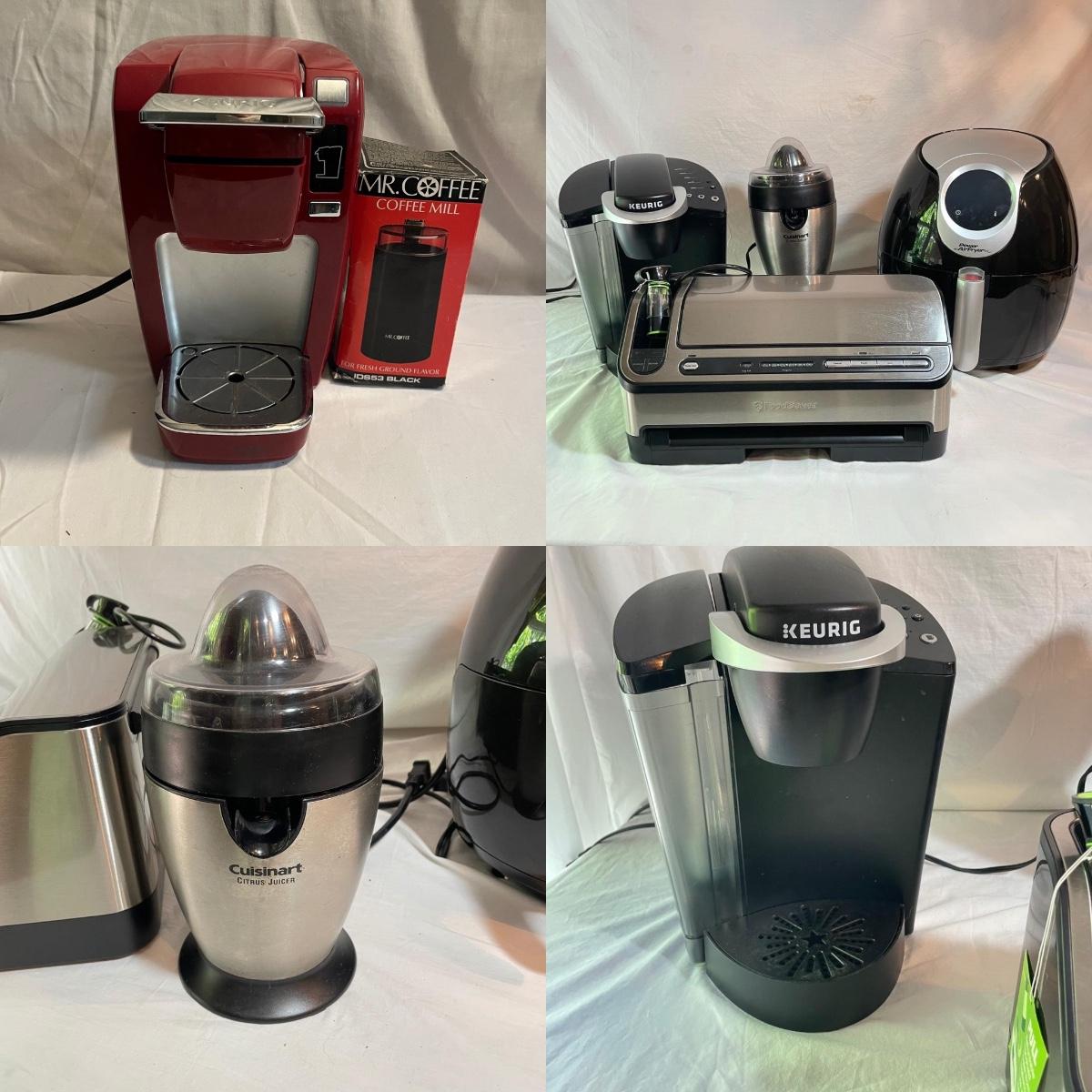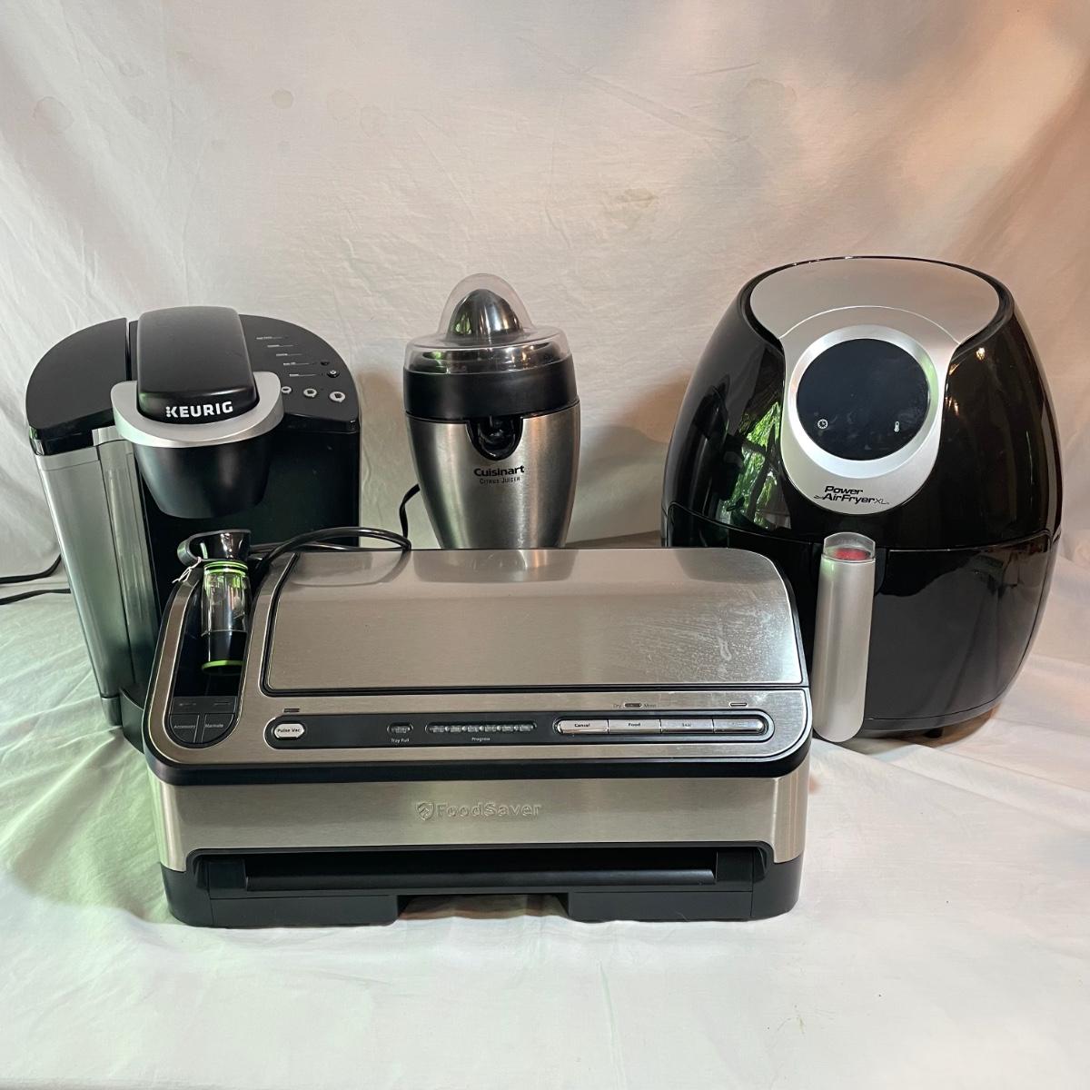 These six small appliances offer many conveniences! Lot includes a Food Saver with an unopened Hot Seal roll, a Cuisinart juicer, two Keurig coffee makers, Mr Coffee coffe grinder and a Power Air Fryer XL. See images. All items powered on when plugged in. Local pick up only.