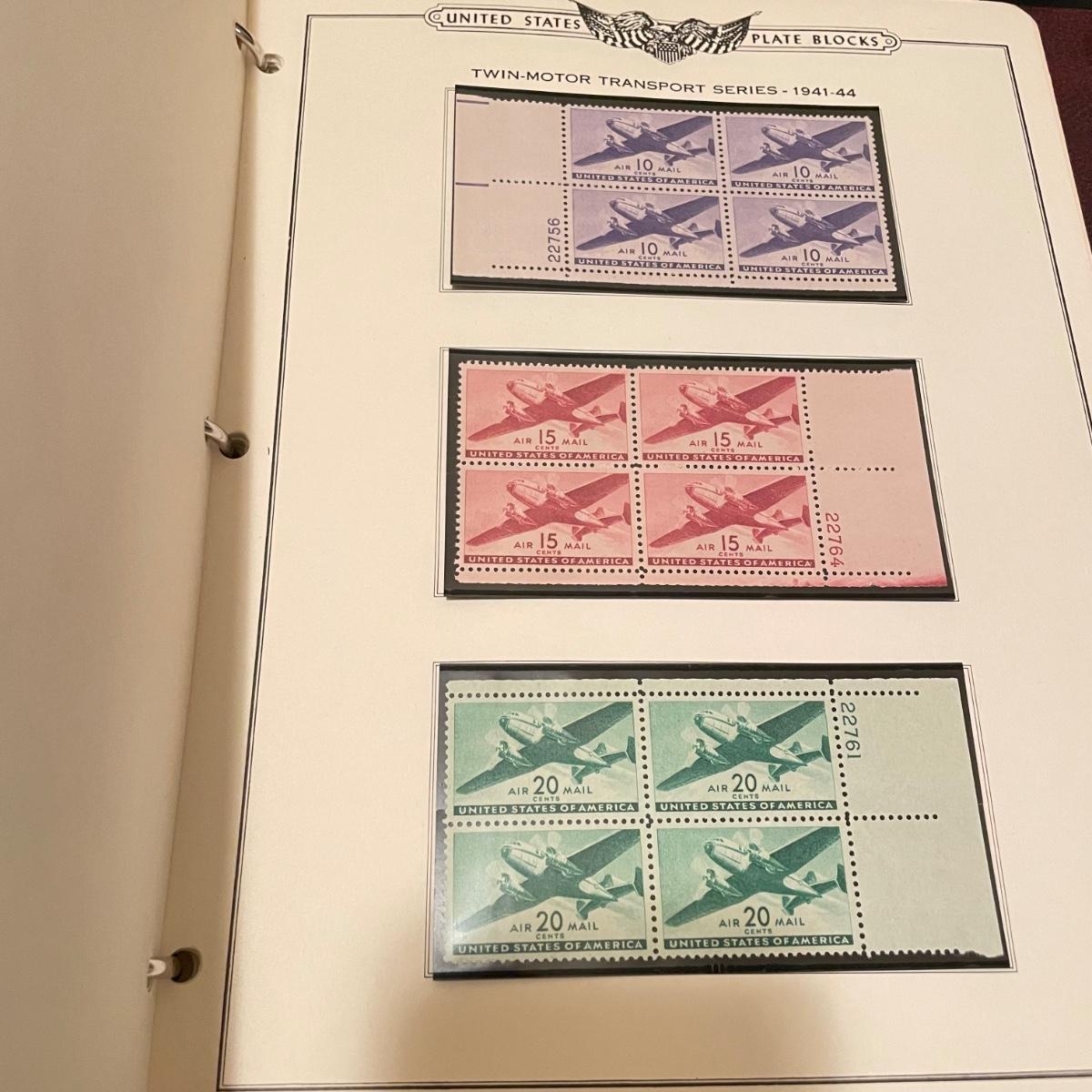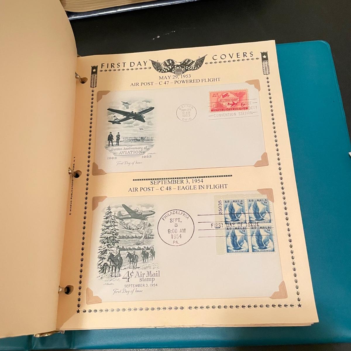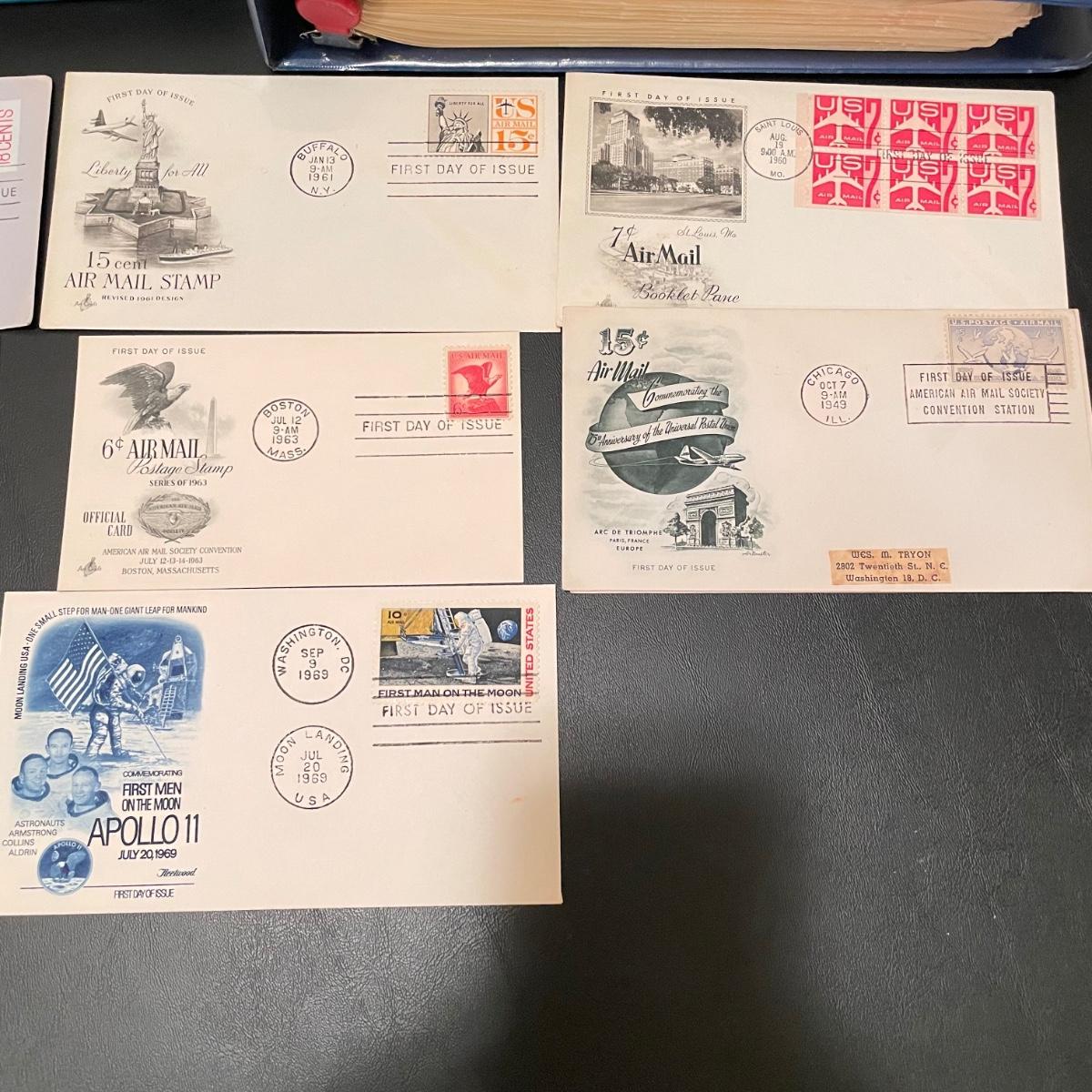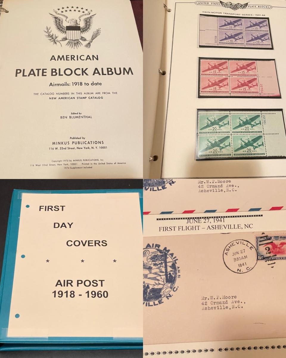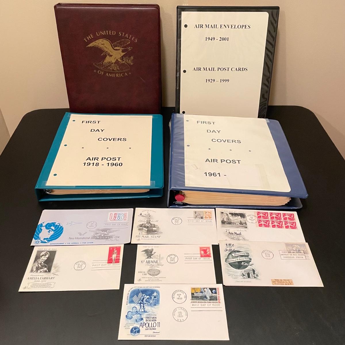 Four organized albums with a focus on aviation and Air Mail. Lot includes a binder with plate blocks, two with 1st day covers, three have air post and one has some Air Mail envelopes. See images for examples. Pages are mostly full, lot includes eight loose envelopes shown in photos. All sales are final. No returns or refunds. Please bid accordingly. Shipping available.