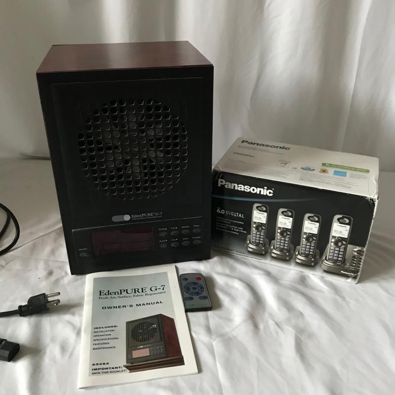 Lot includes EdenPure air purifier (approx. 9” x 8” x 12.5”) and set of Panasonic cordless phones, new in the box. No shipping available. Local pickup only in Hendersonville, NC.
