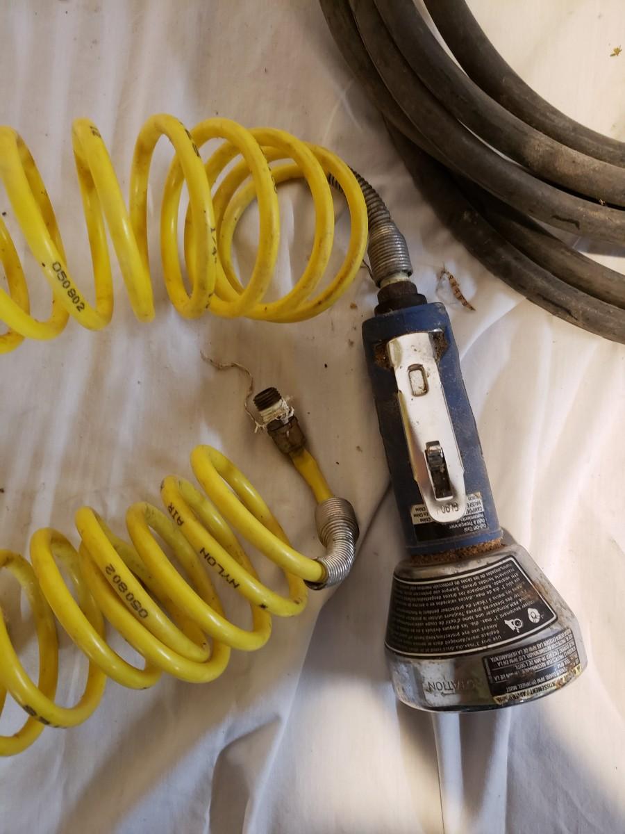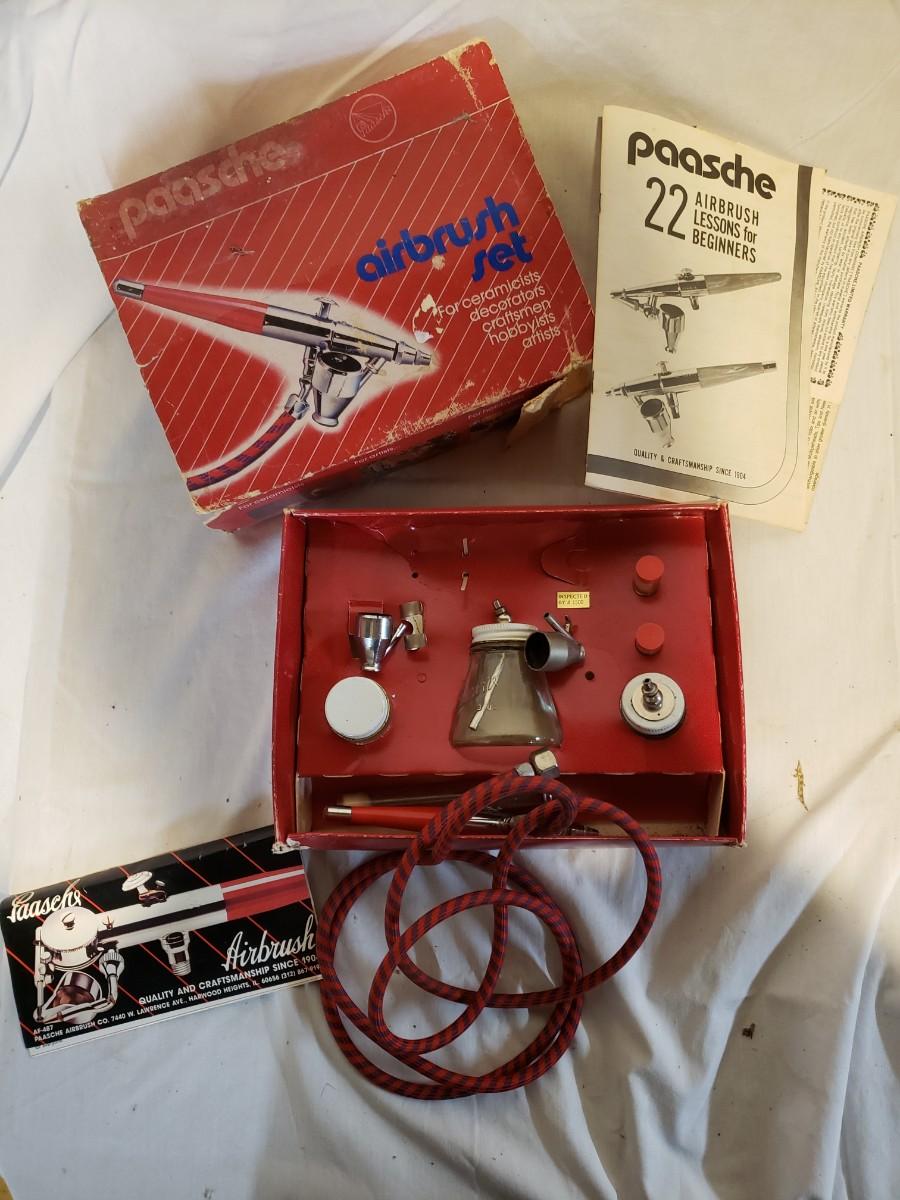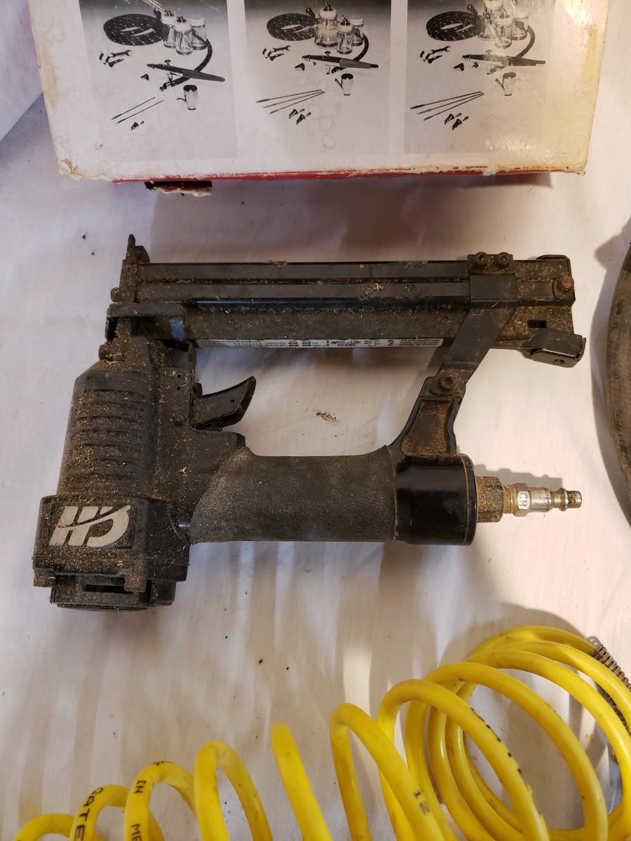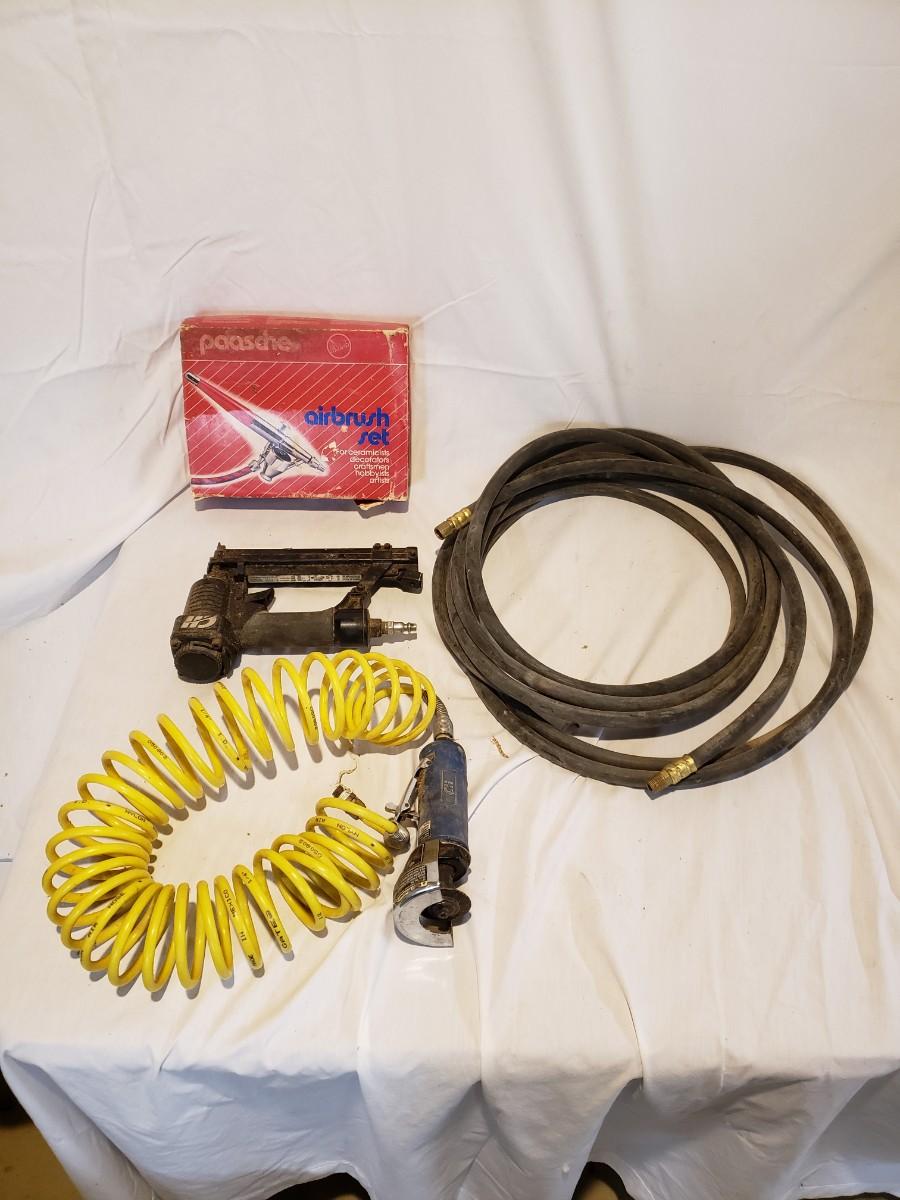 This lot contains 4 items are all air compressor driven. (compressor not included) The Airbrush Set by Paasche appears to be new. The air brush set can be used by ceramicists, decorators, craftsmen, hobbyist and artists. The CH Compressor Cut-Off tool comes with a nylon spiral hose attached to it. The CH Air Compressor Nailer/Stapler (item #SB323200) is stand alone, but this lot comes with a hose that can attach to it. No items were tested. Shipping available.