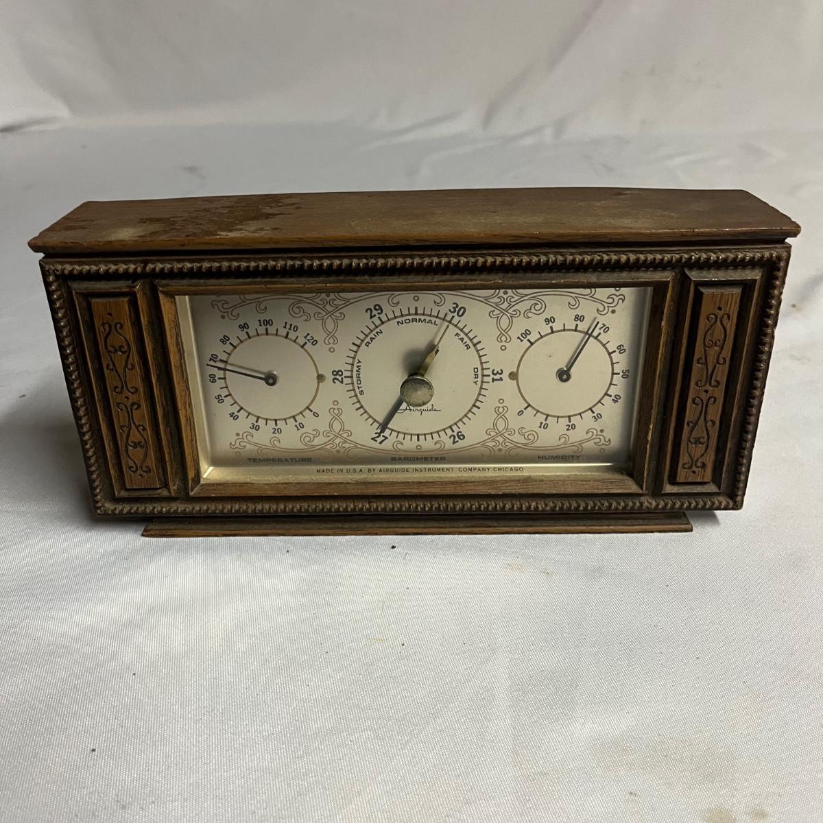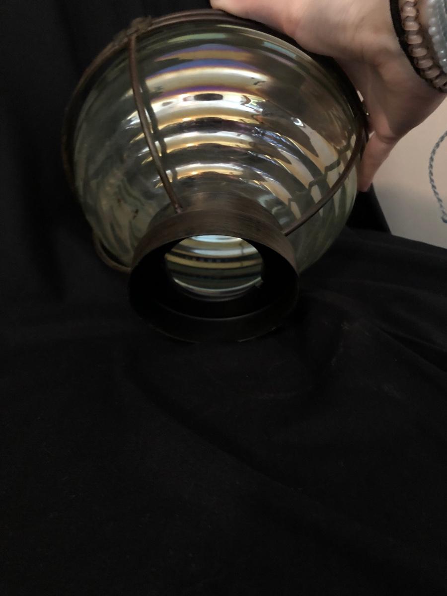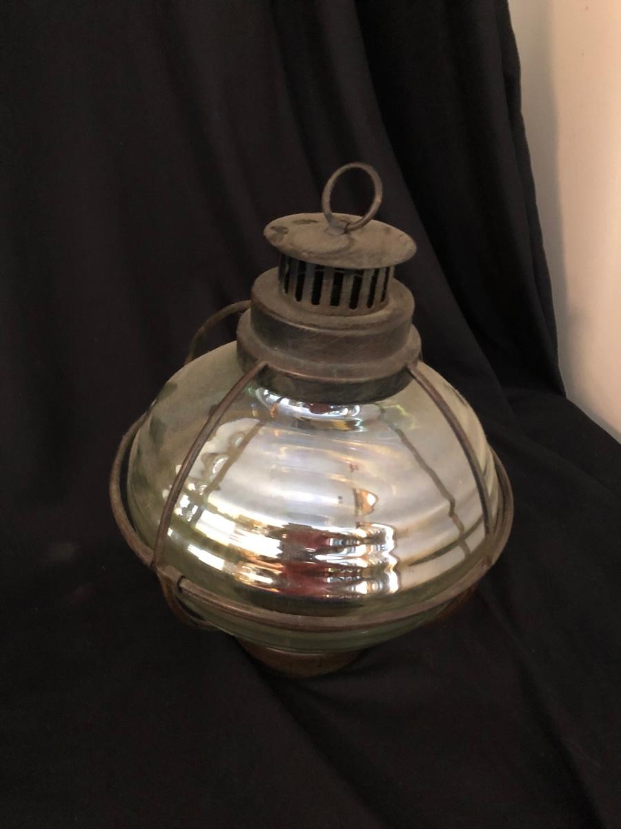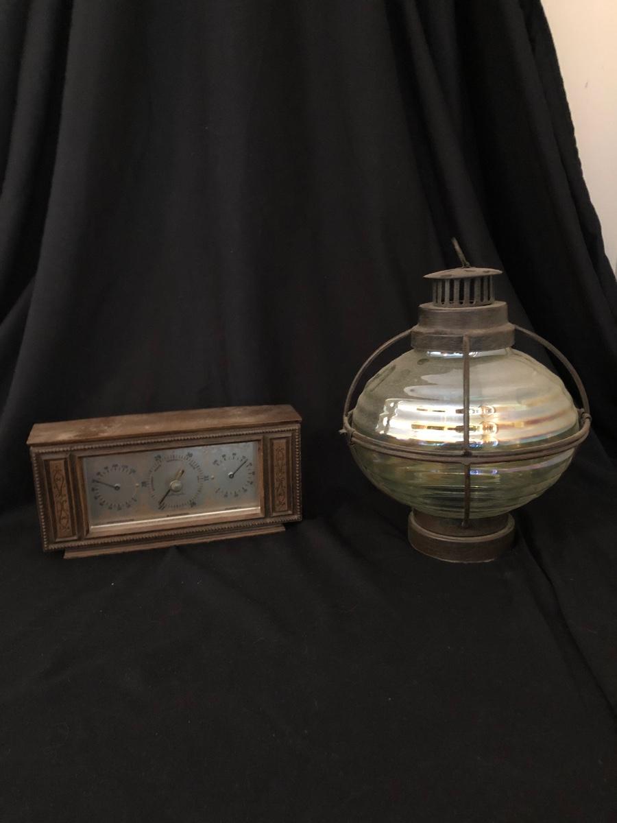 The barometer is plastic with a faux wood look with a plastic face. The “Lantern” has a lantern like top with an open bottom. The top is metal, but the sphere is glass.