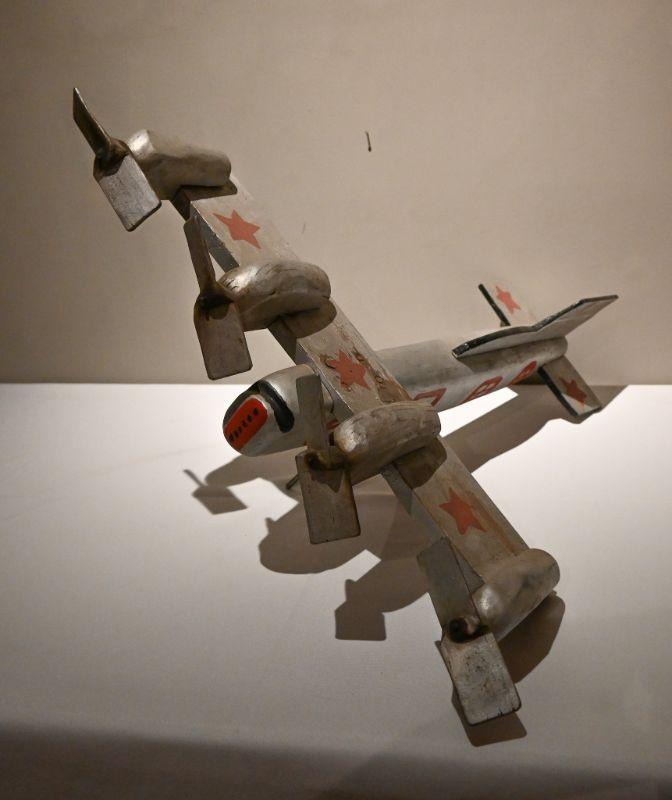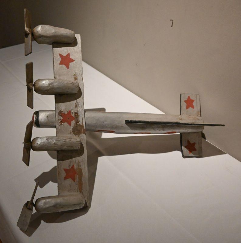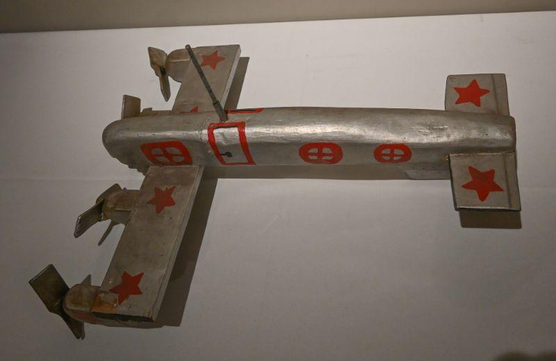 An airplane model by an unknown or anonymous artist. Wood, paint. Approx. 23.5" x 24.5" x 13.5". Please note, height of approx. 13.5" includes mounting pin, as photographed.