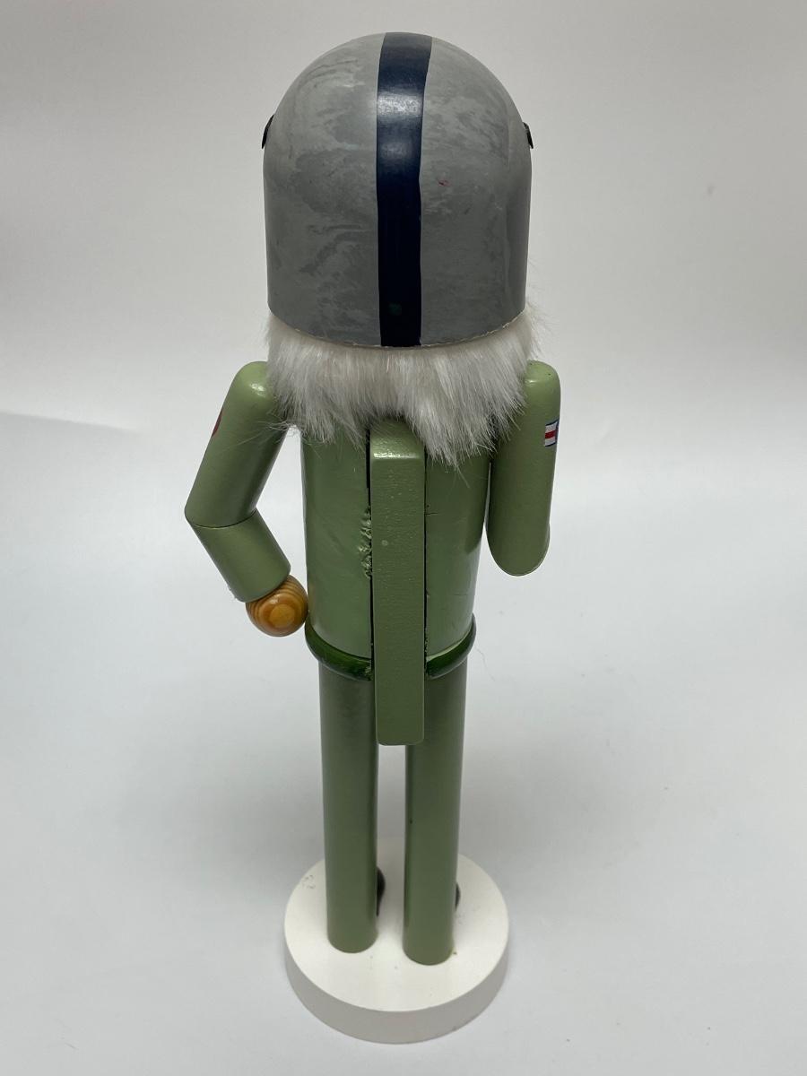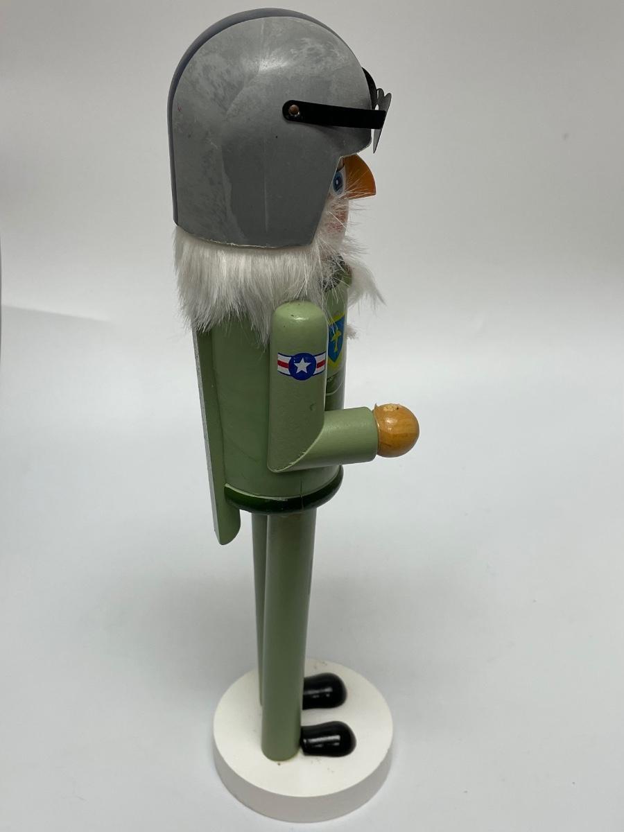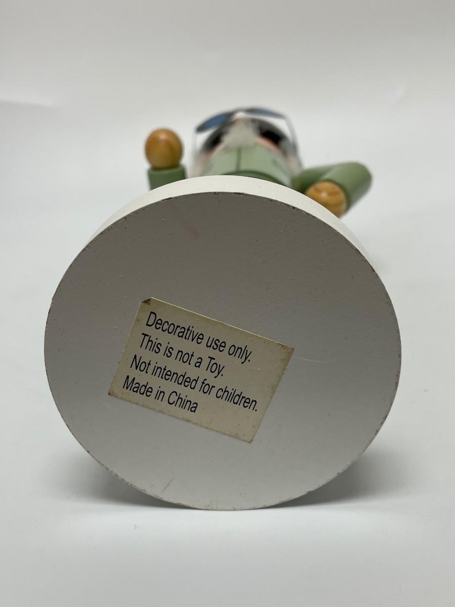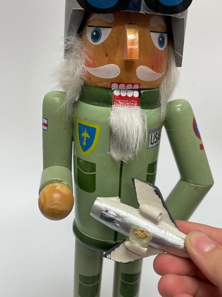 This nutcracker is in good condition. The small plane fell off of his hand but it can be glued back on again easily. The mouth moves perfectly fine. The item is for decoration use only, it is not a toy. The item was made in China.
