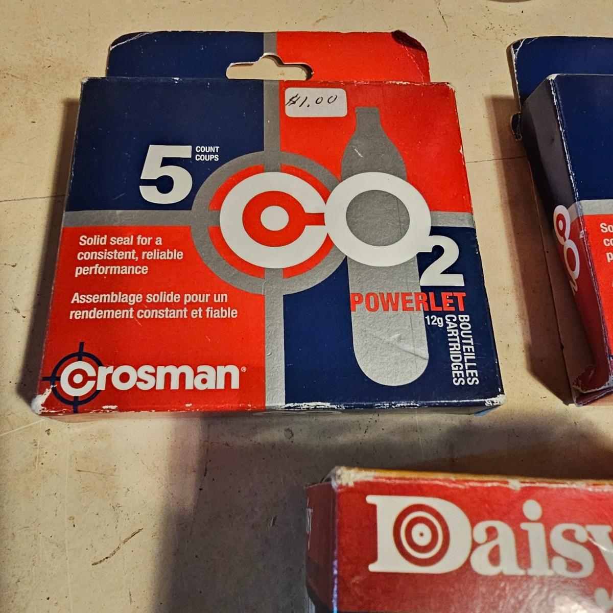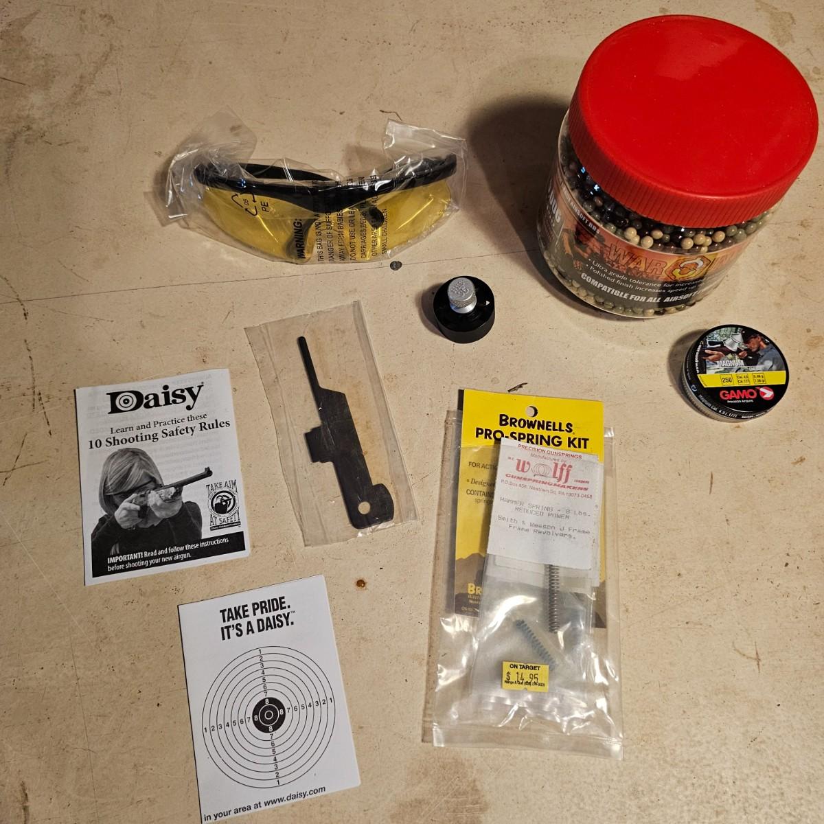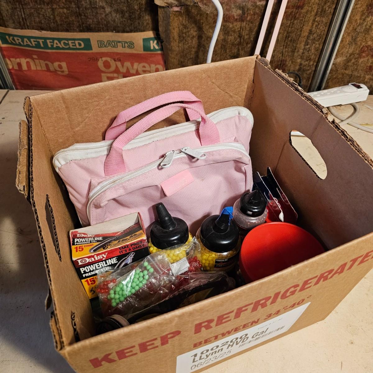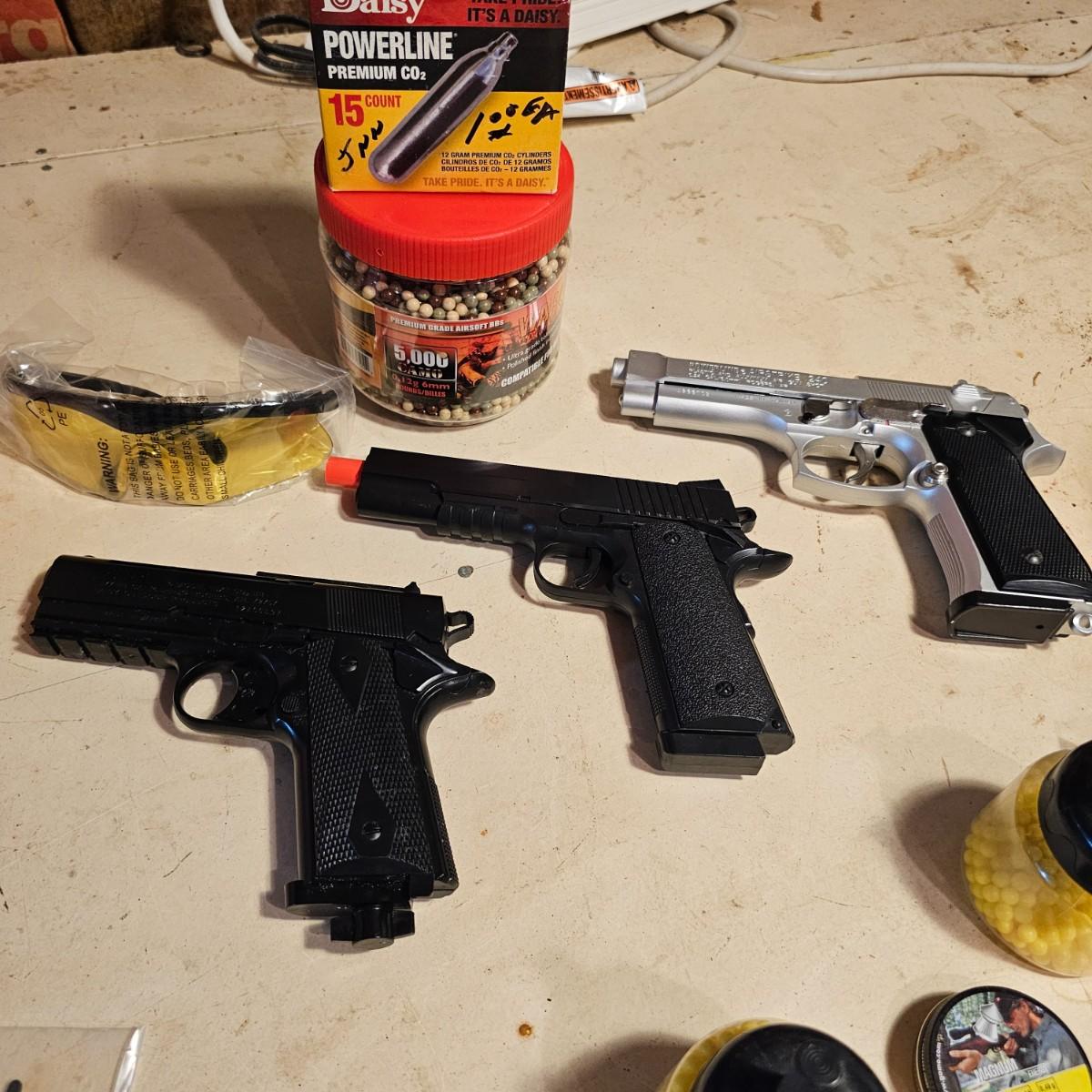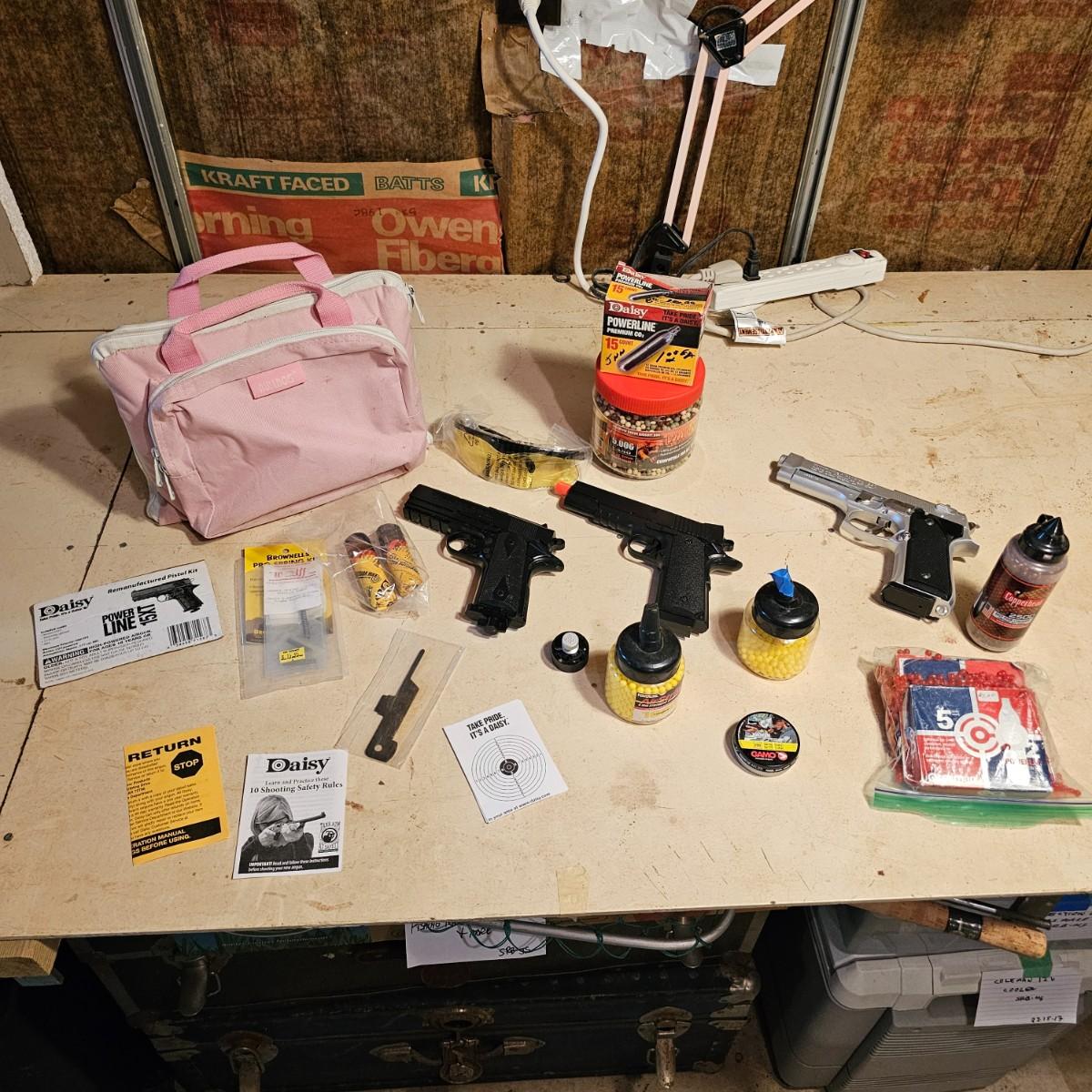 Three pistols, ammo, CO2 cartridges, safety glasses and more. BB's and airsoft pellets for all pistols plus CO2 cylinders (may not be viable due to age). Pink carry-bag is by Bulldog, measures 11" x 2" x 7"H, has compartments for pistol, ammo, etc. One Daisy Powerline CO2 pistol, shoots BBs. Tag indicates item is remanufactured. Untested, also includes over 20 cylinders and ammo. Smaller pistol is a Cyma p662 air gun, has loadable magazine, shoots airsoft pellets, included. Large pistol is a Powerline AirStrike 240, removable magazine, shoots 6mm airsoft pellets, included. Spring loaded. Both spring operating items tested working. Also goggles and a speed loader, caliber unknown. See photos for details. Local pickup only.