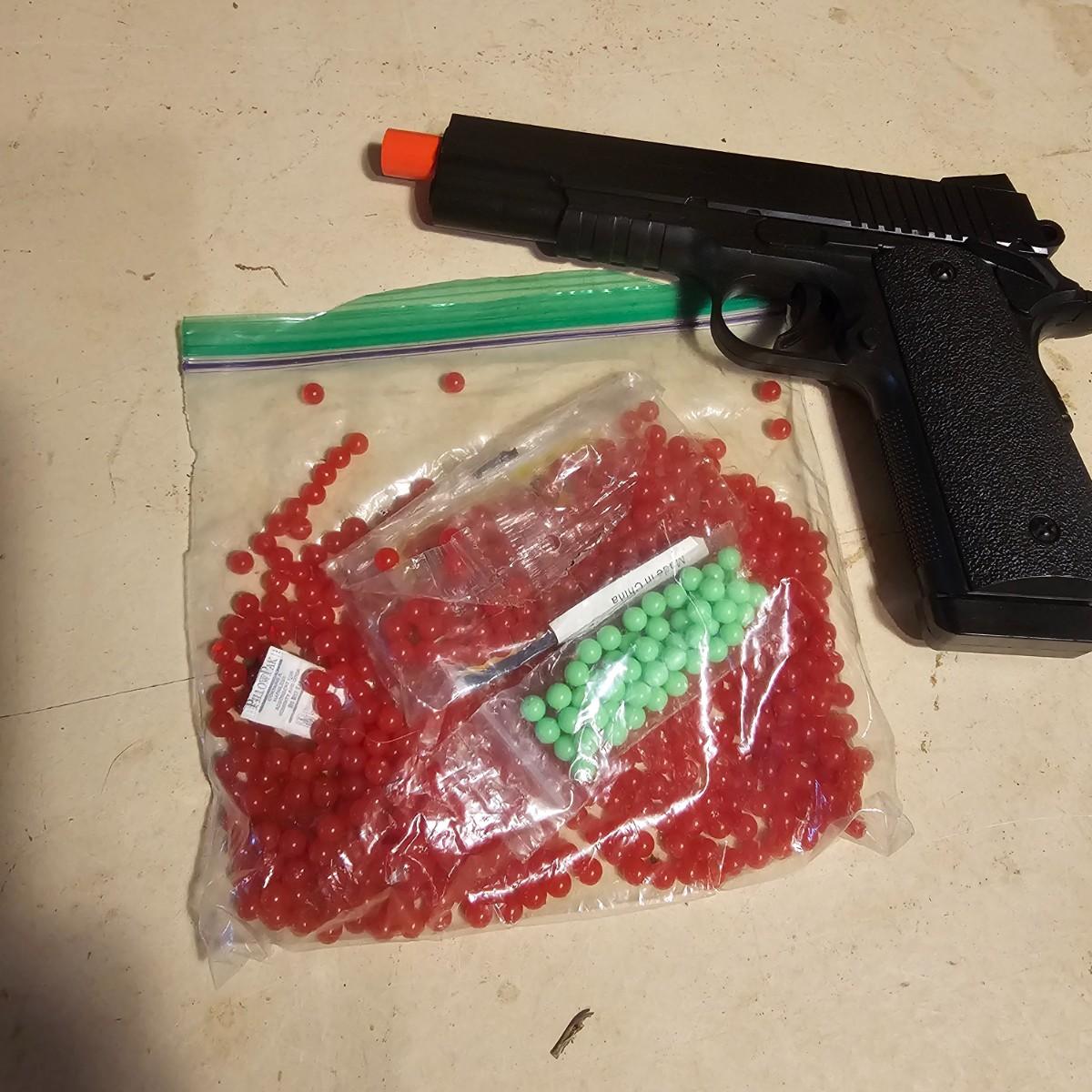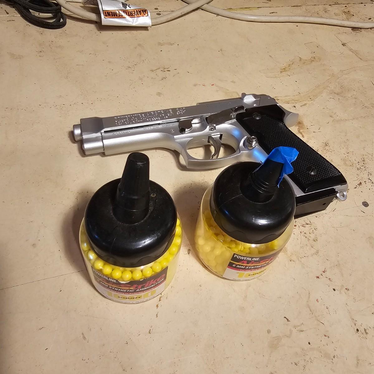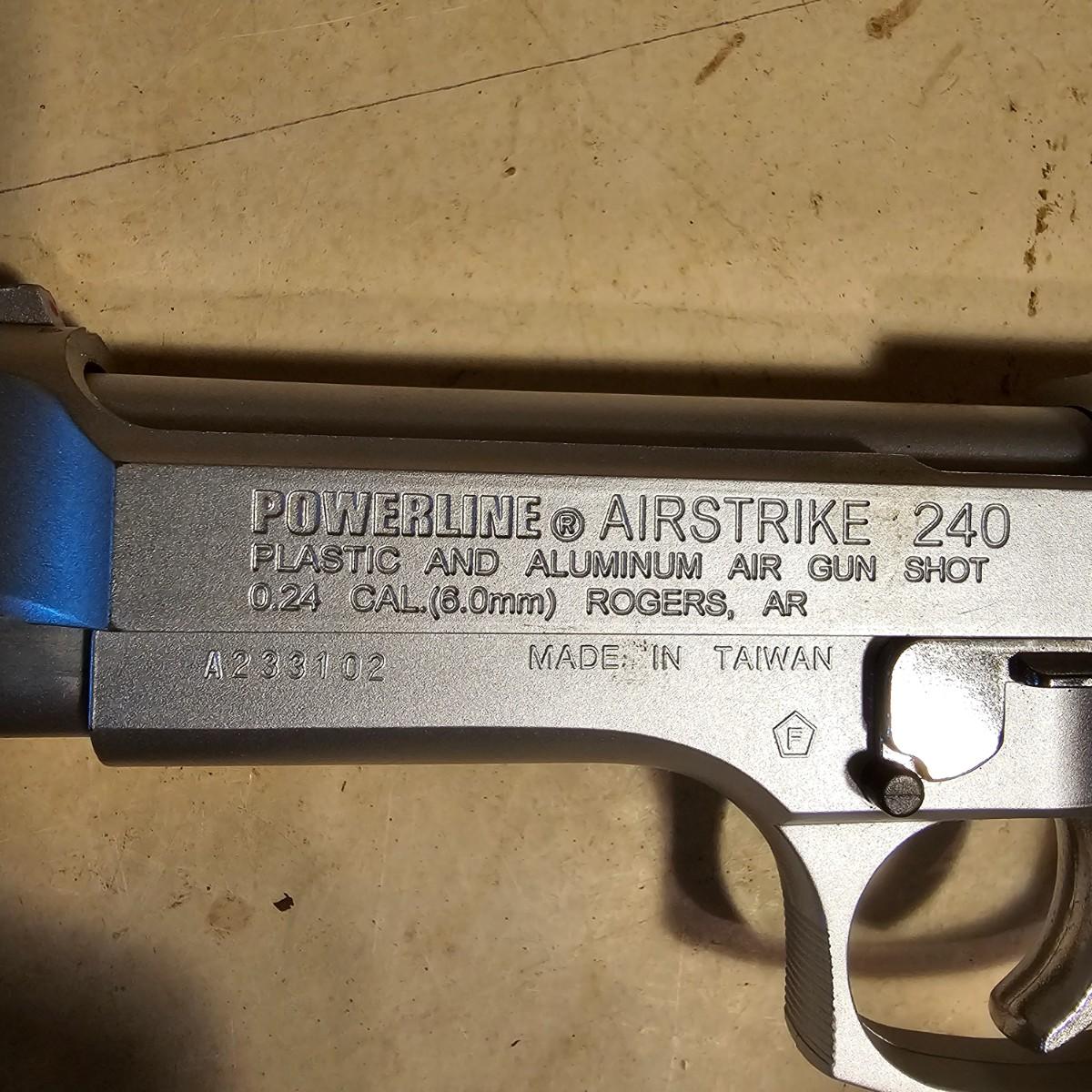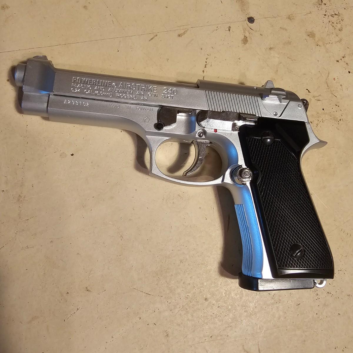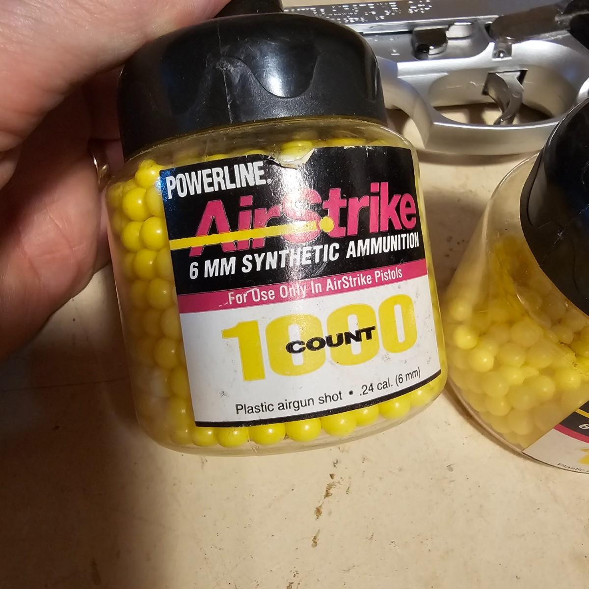 Three pistols, ammo, CO2 cartridges, safety glasses and more. BB's and airsoft pellets for all pistols plus CO2 cylinders (may not be viable due to age). Pink carry-bag is by Bulldog, measures 11" x 2" x 7"H, has compartments for pistol, ammo, etc. One Daisy Powerline CO2 pistol, shoots BBs. Tag indicates item is remanufactured. Untested, also includes over 20 cylinders and ammo. Smaller pistol is a Cyma p662 air gun, has loadable magazine, shoots airsoft pellets, included. Large pistol is a Powerline AirStrike 240, removable magazine, shoots 6mm airsoft pellets, included. Spring loaded. Both spring operating items tested working. Also goggles and a speed loader, caliber unknown. See photos for details. Local pickup only.