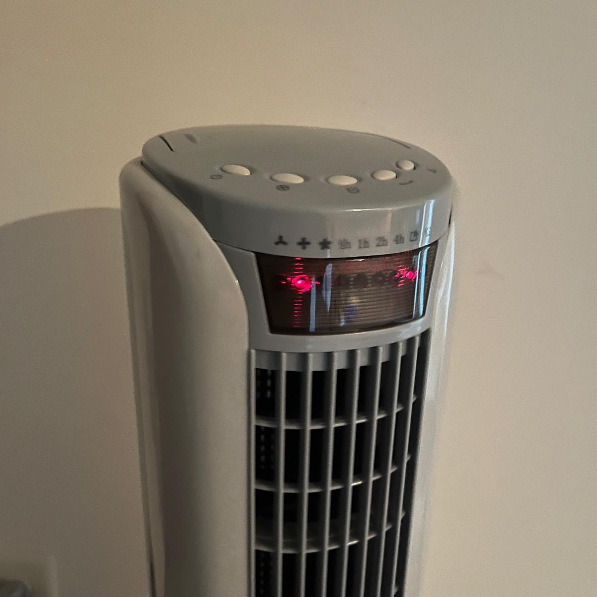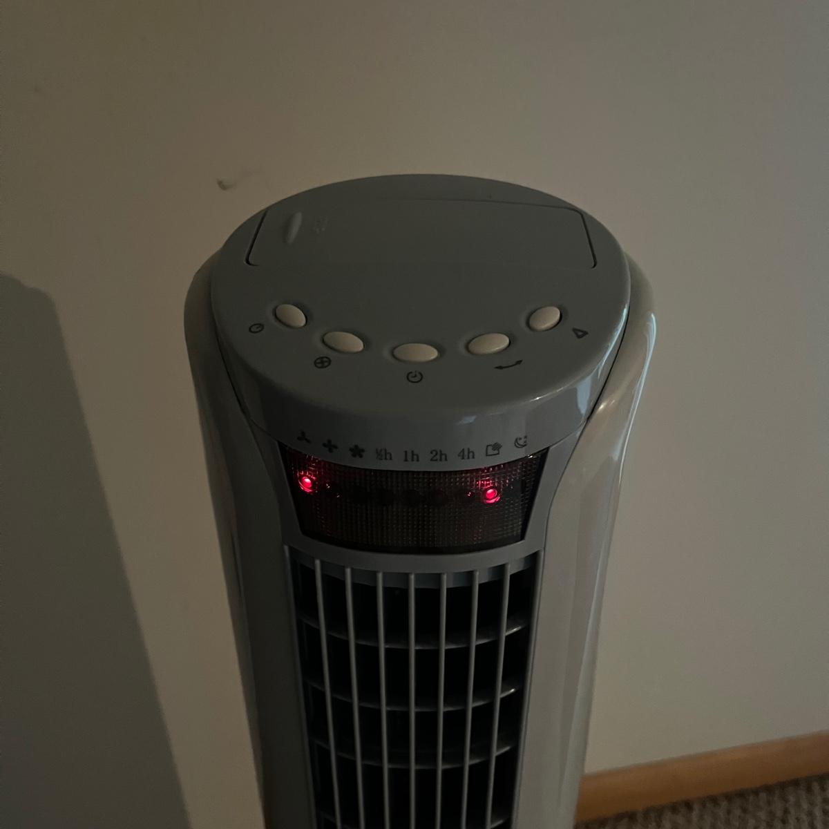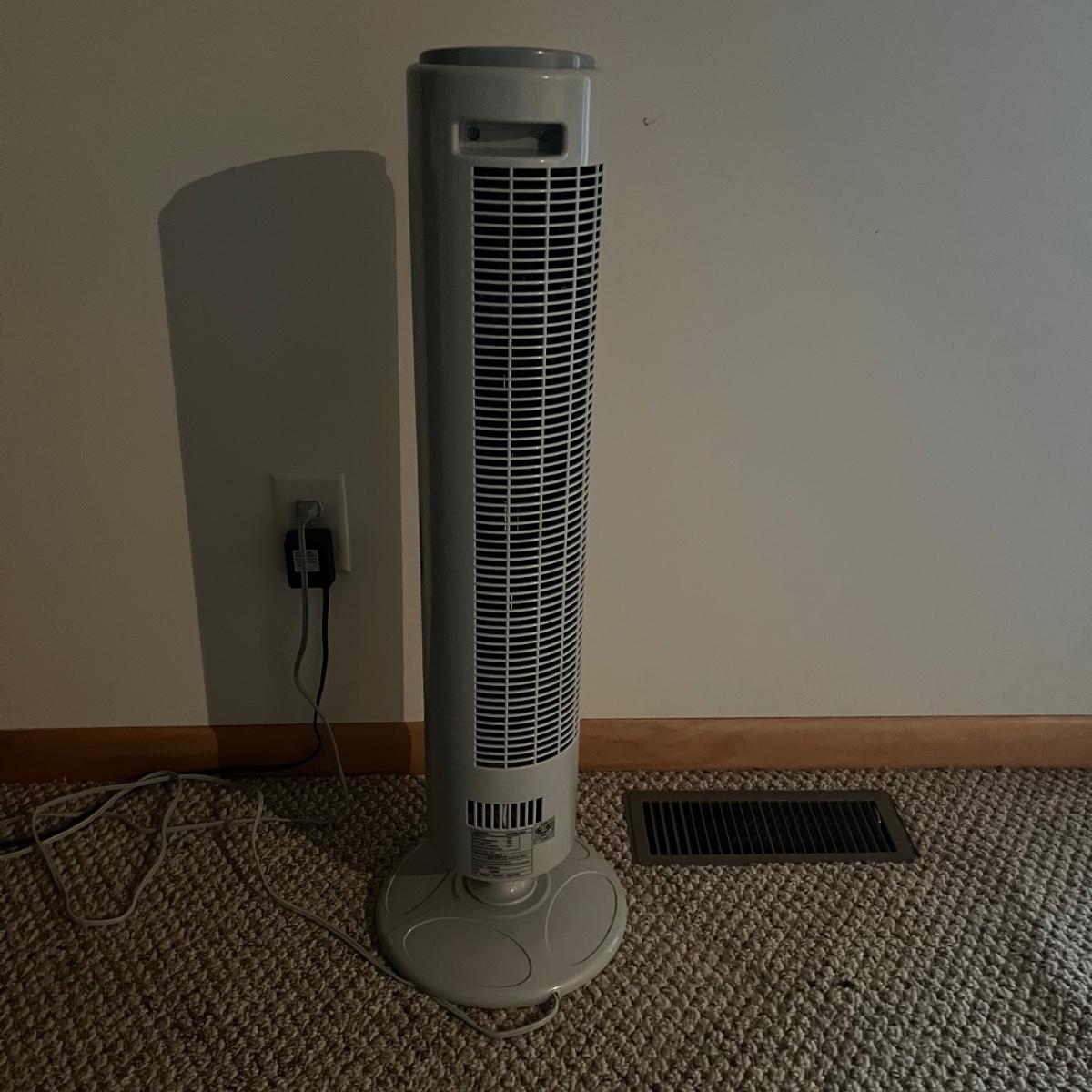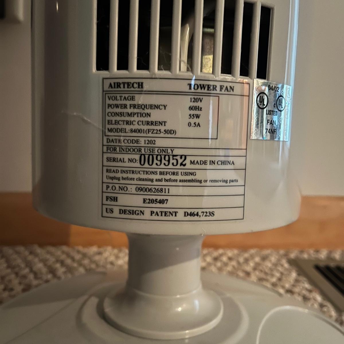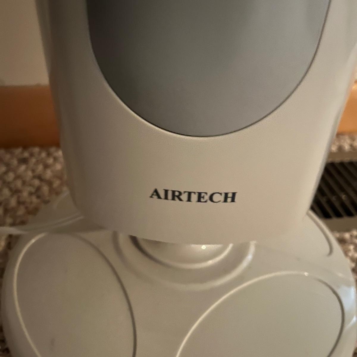 Lot includes a Airtech oscillating tower fan that measures 11”D x 35”H. Fan powered on when plugged in.