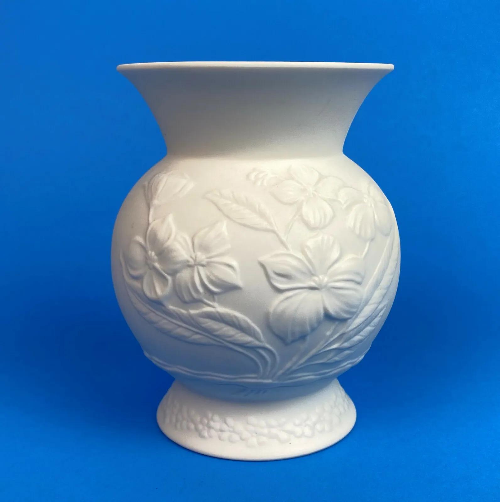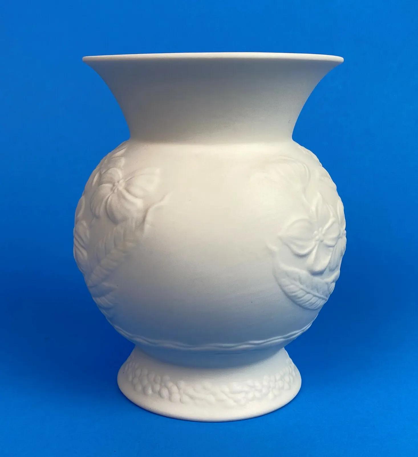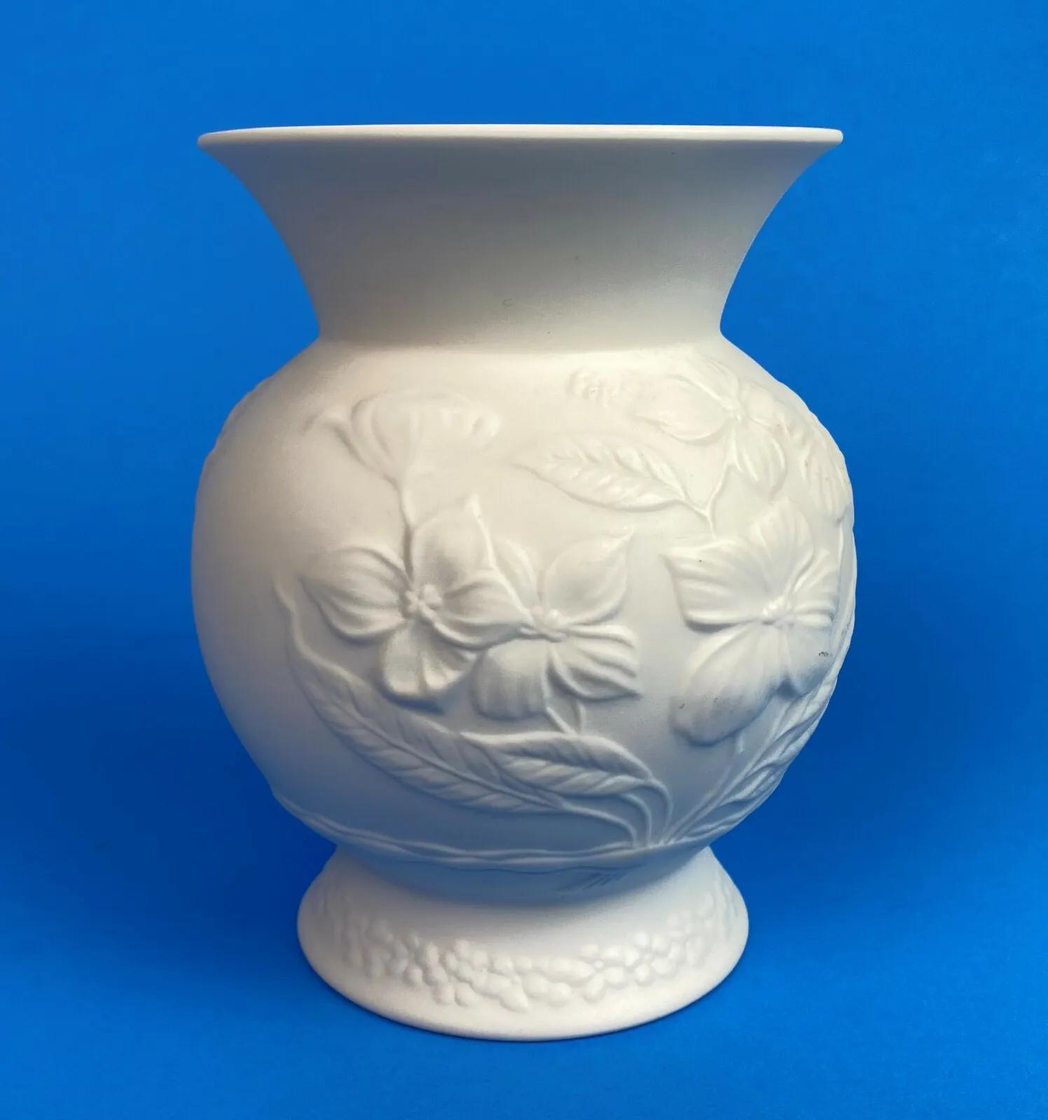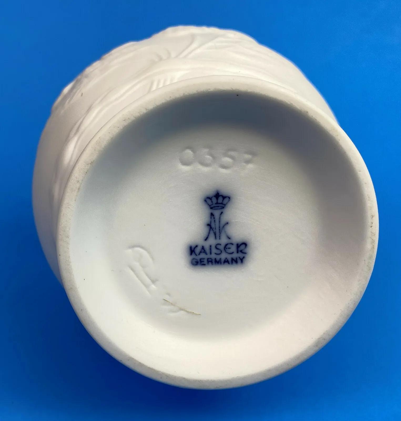 Superb condition on this 4 1/2 inch tall white bisque vase featuring a floral relief motif...glazed interior...Designer signed by Manfred Frey...Produced by Kaiser-Porzellan in West Germany between 1979 and 1990...Handmade...#0357...Kaiser-Porzellanmanufaktur Staffelstein K.G....A beautiful piece.