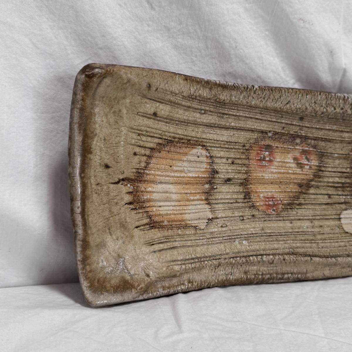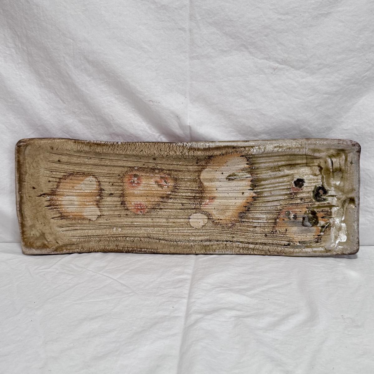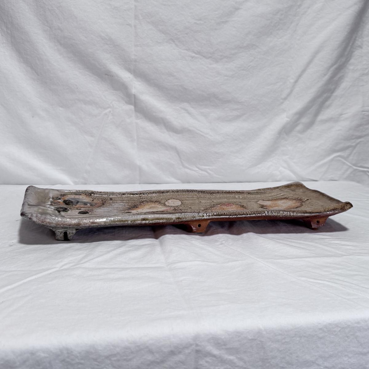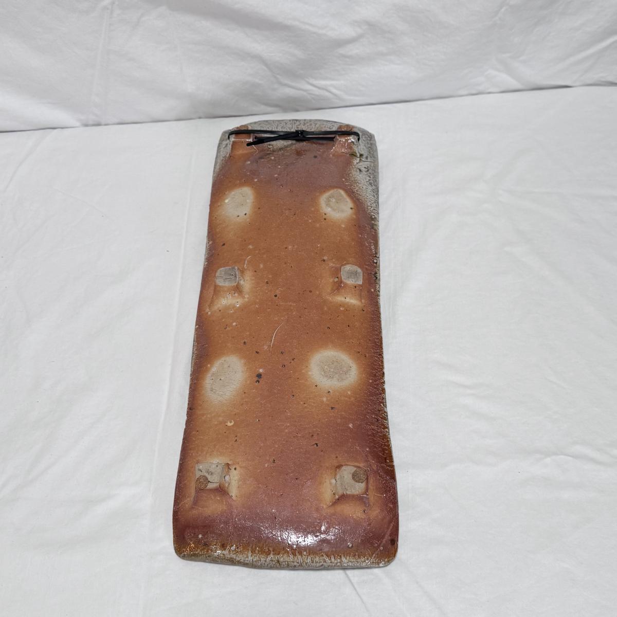 This lot includes one Akira Satake plate made of ceramic. The plate has a zip tie on the back for hanging purposes. There is one small crack on this piece - see pictures included. The plate measures 19.35” x 6.5” x 1.5”H. It appears to be signed on the back with Satake. Per the homeowner, piece was purchased from the artist in 2013. Shipping available.