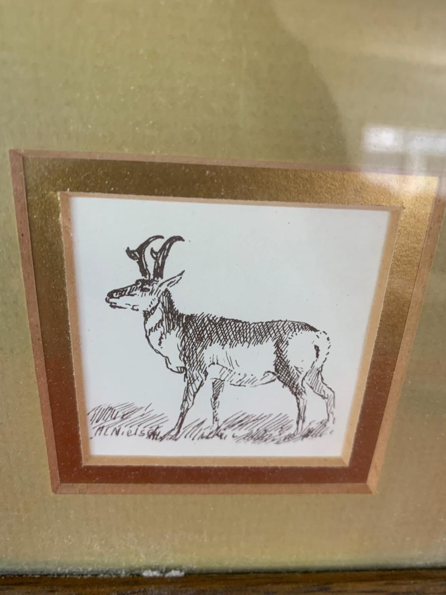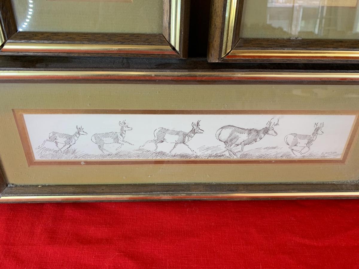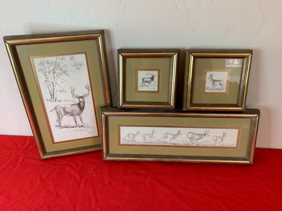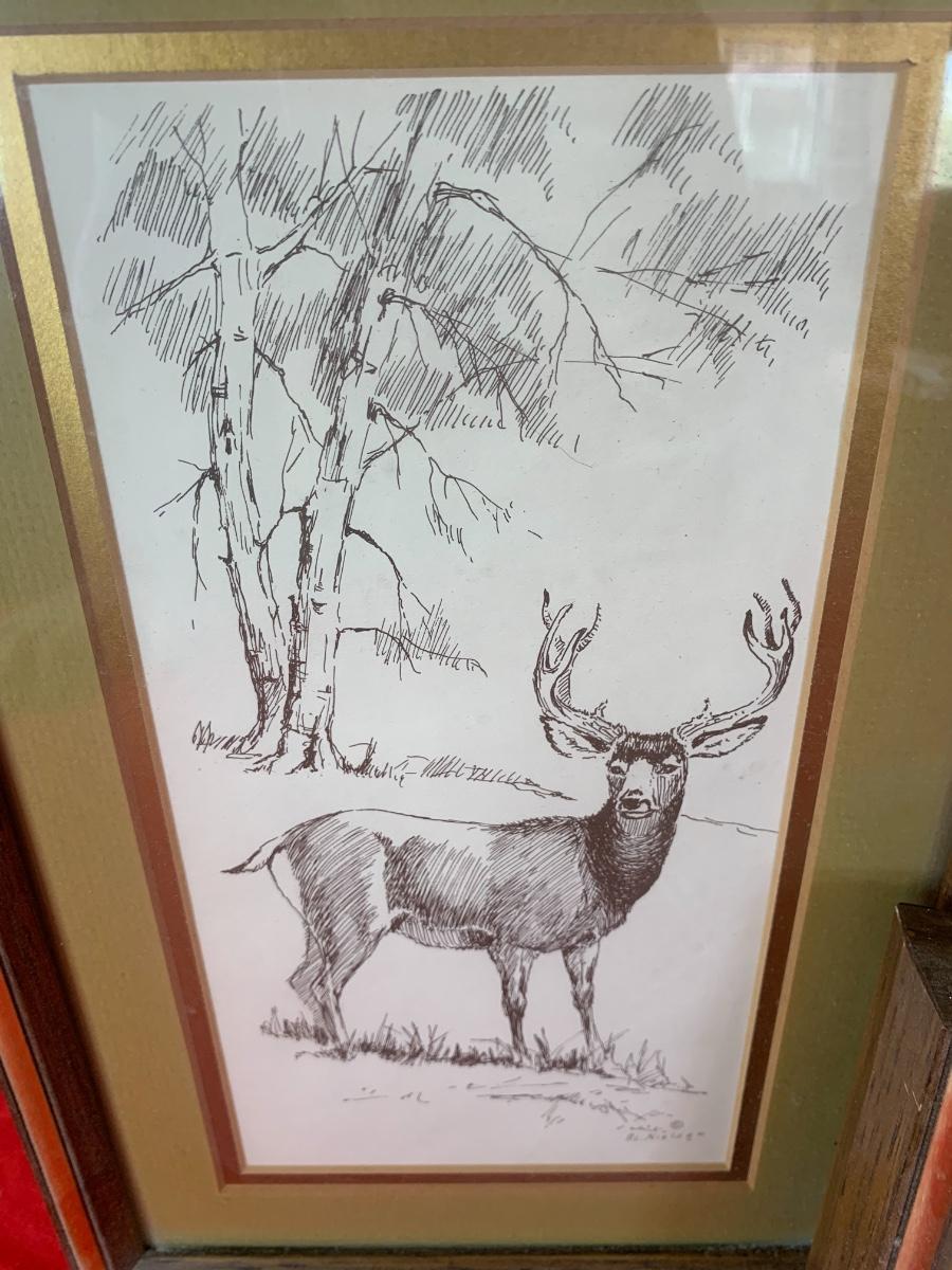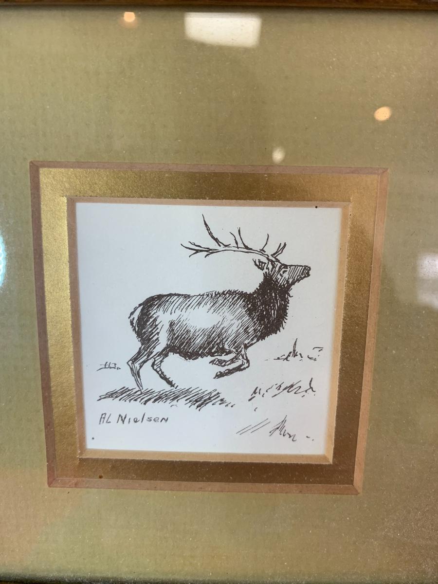 Al Nielson ink drawings depicting deer/elk in wildlife. Four in total, all in matching professionally matted frames. In great condition, just need dusting.