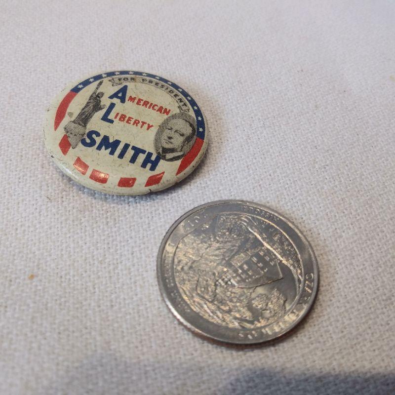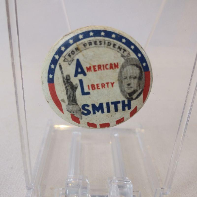 Al Smith Political Button. Al Smith for President - the first Roman Catholic candidate from a major political party. This is an original 1928 political button. It is in very good condition for its age. It is 1 1/2-inches in diameter. Reserve Price $10.