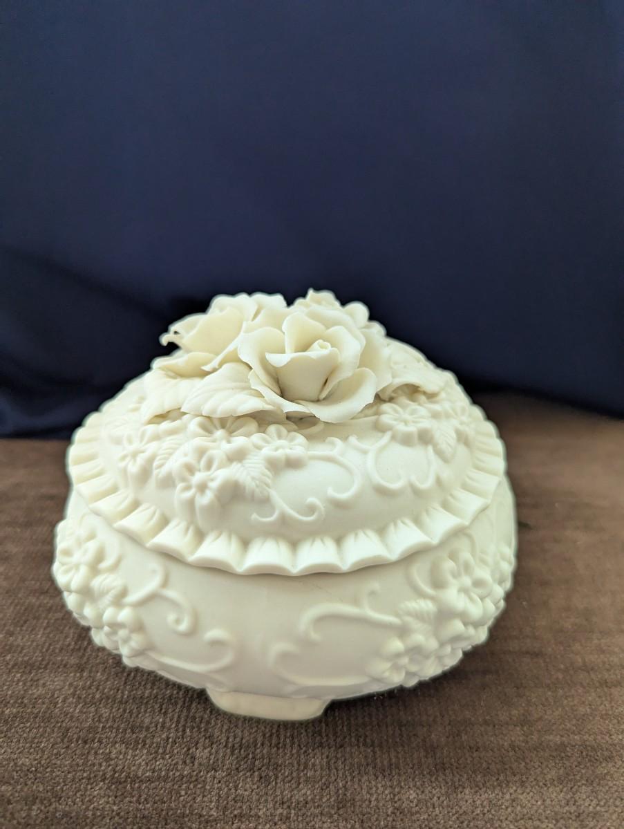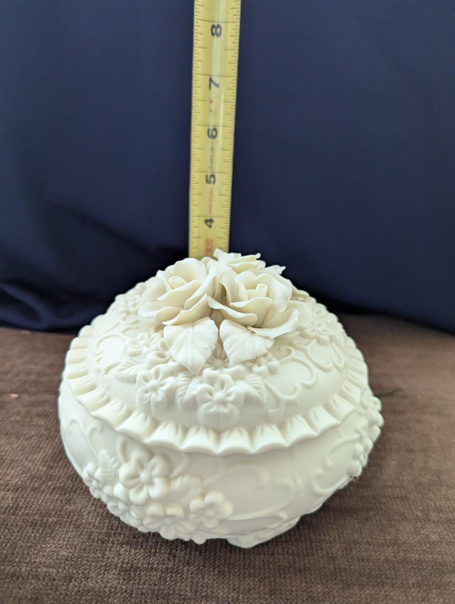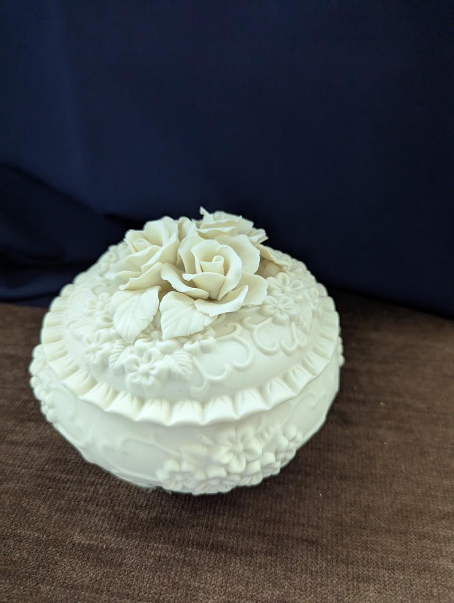 Beautiful victorian style porcelain bisque trinket or jewelry box with lid.