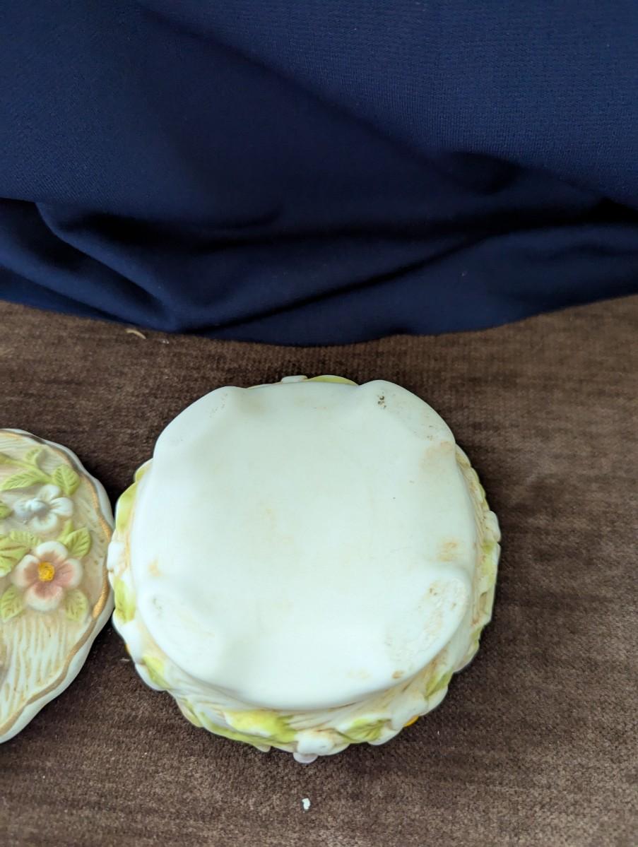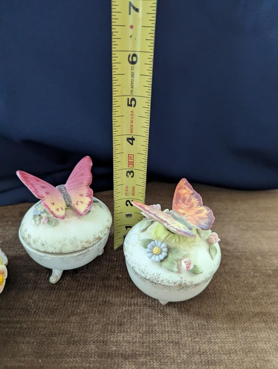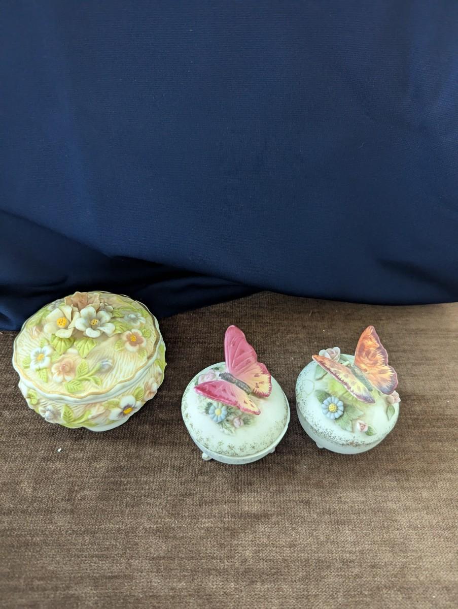 Victorian porcelain round trinket box, it is broken (see pictures). Two bisque porcelain butterfly trinket boxes.