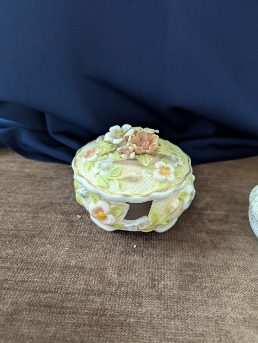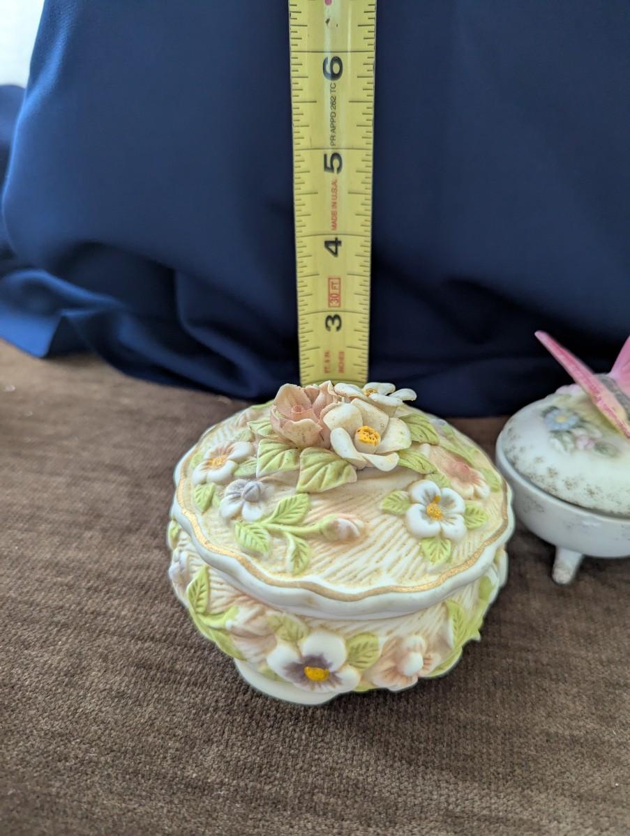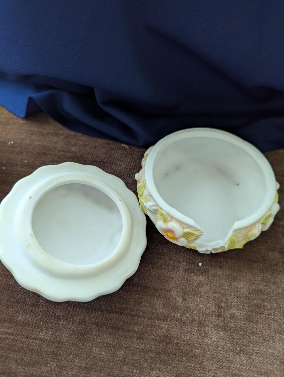 Victorian porcelain round trinket box, it is broken (see pictures). Two bisque porcelain butterfly trinket boxes.