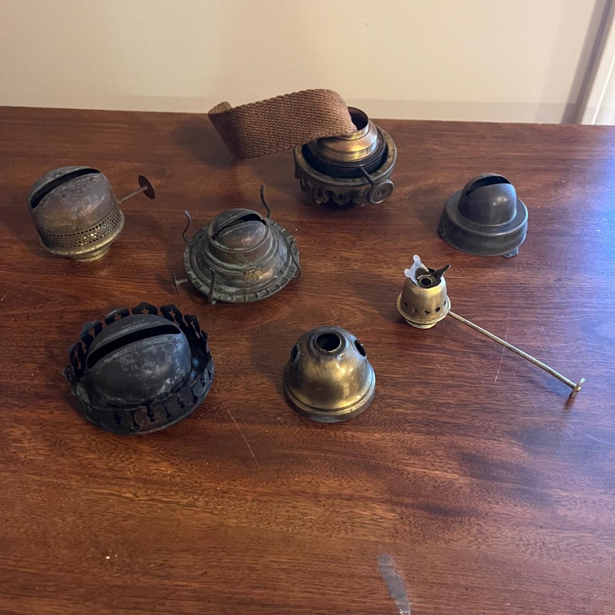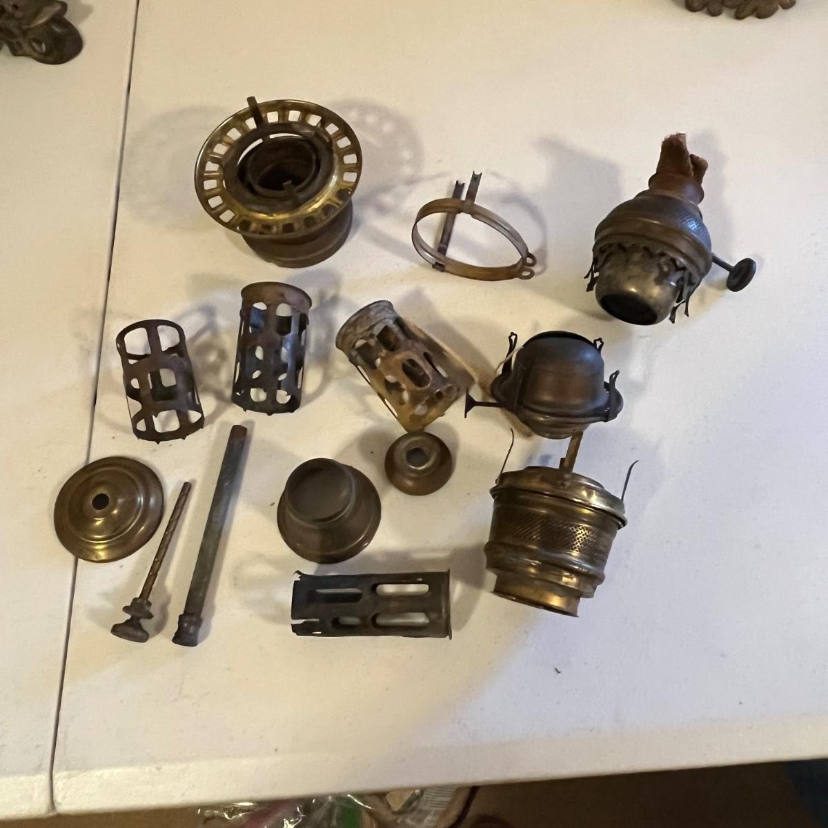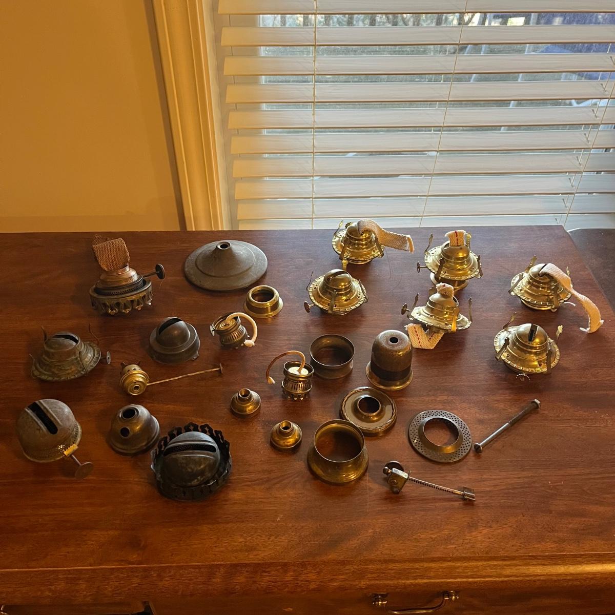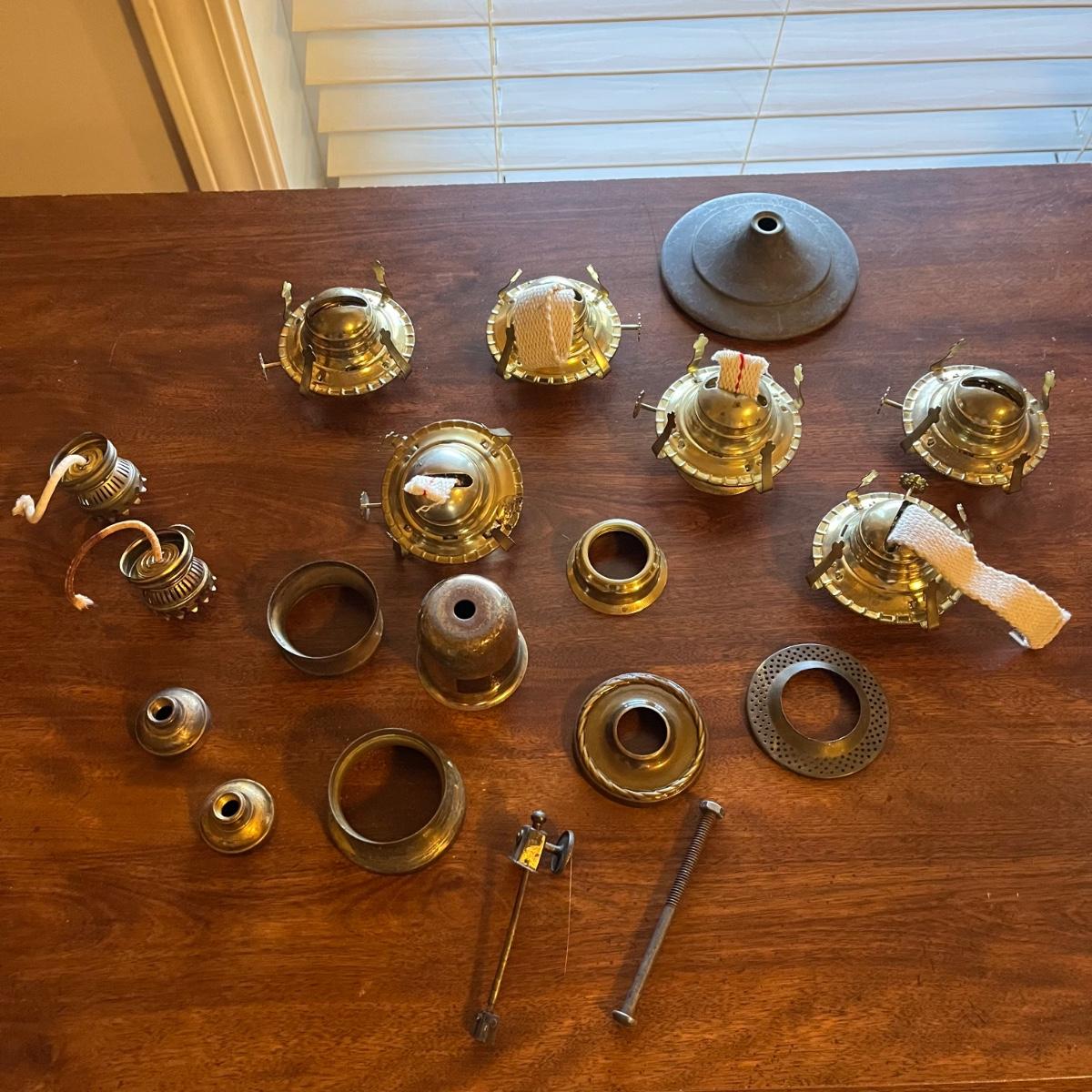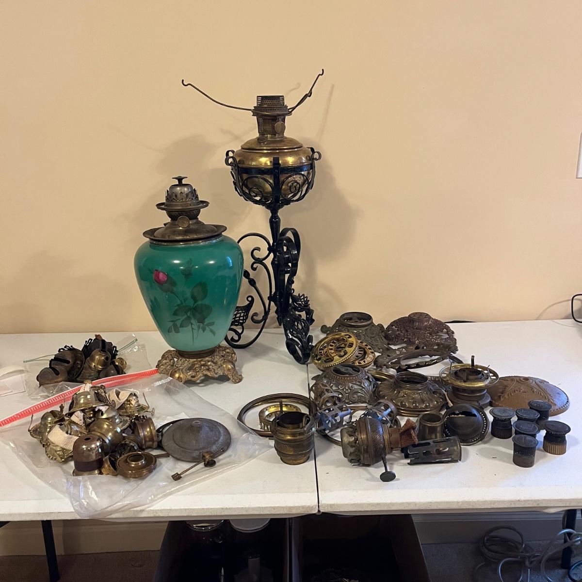 This is a large collection with two oil lamps and many oil lamp parts. The Aladdin oil lamp measures 10”D at the base x 22.5”H. The Success oil lamp measures 9”D x 18”H. Parts include bases, Edward Miller and Fostoria flame spreaders, and much more. See pictures for details.