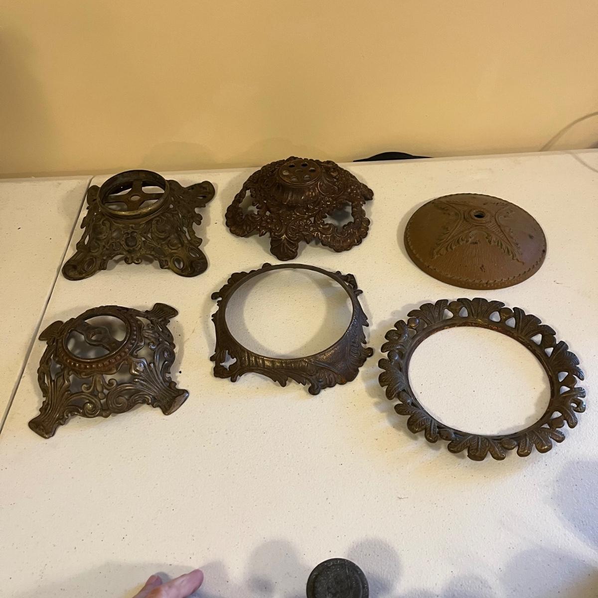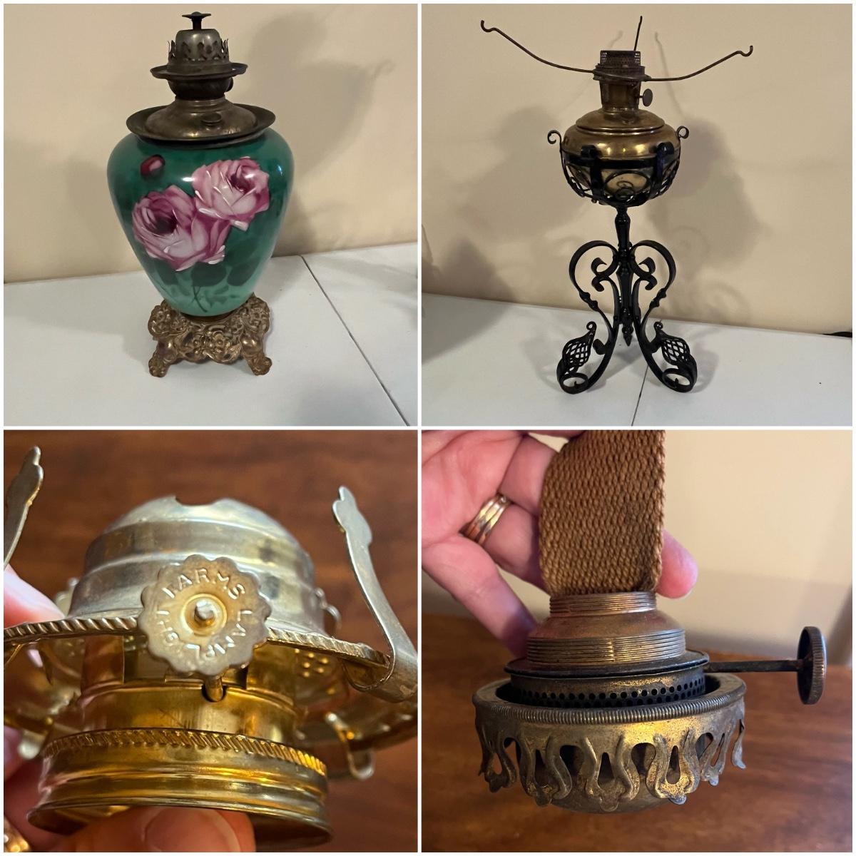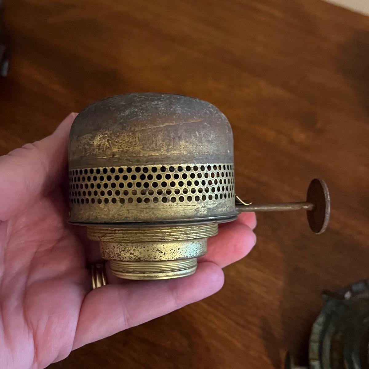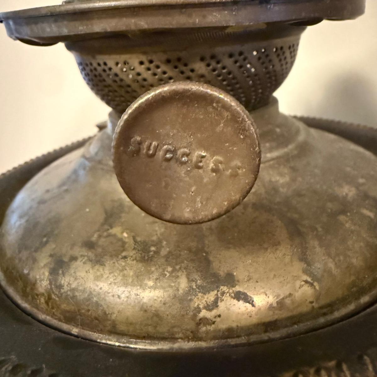 This is a large collection with two oil lamps and many oil lamp parts. The Aladdin oil lamp measures 10”D at the base x 22.5”H. The Success oil lamp measures 9”D x 18”H. Parts include bases, Edward Miller and Fostoria flame spreaders, and much more. See pictures for details.