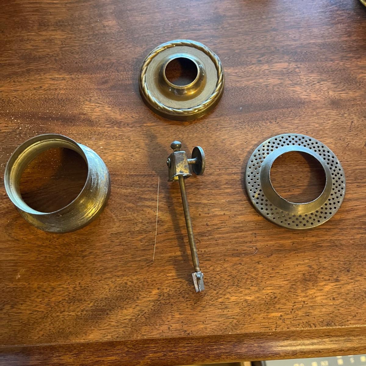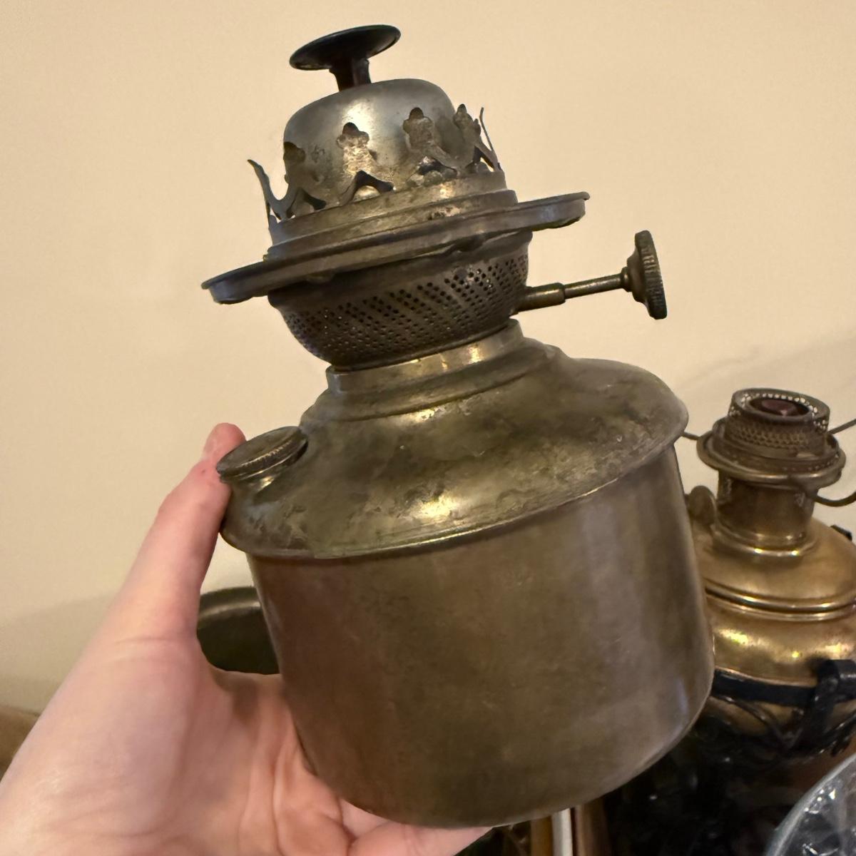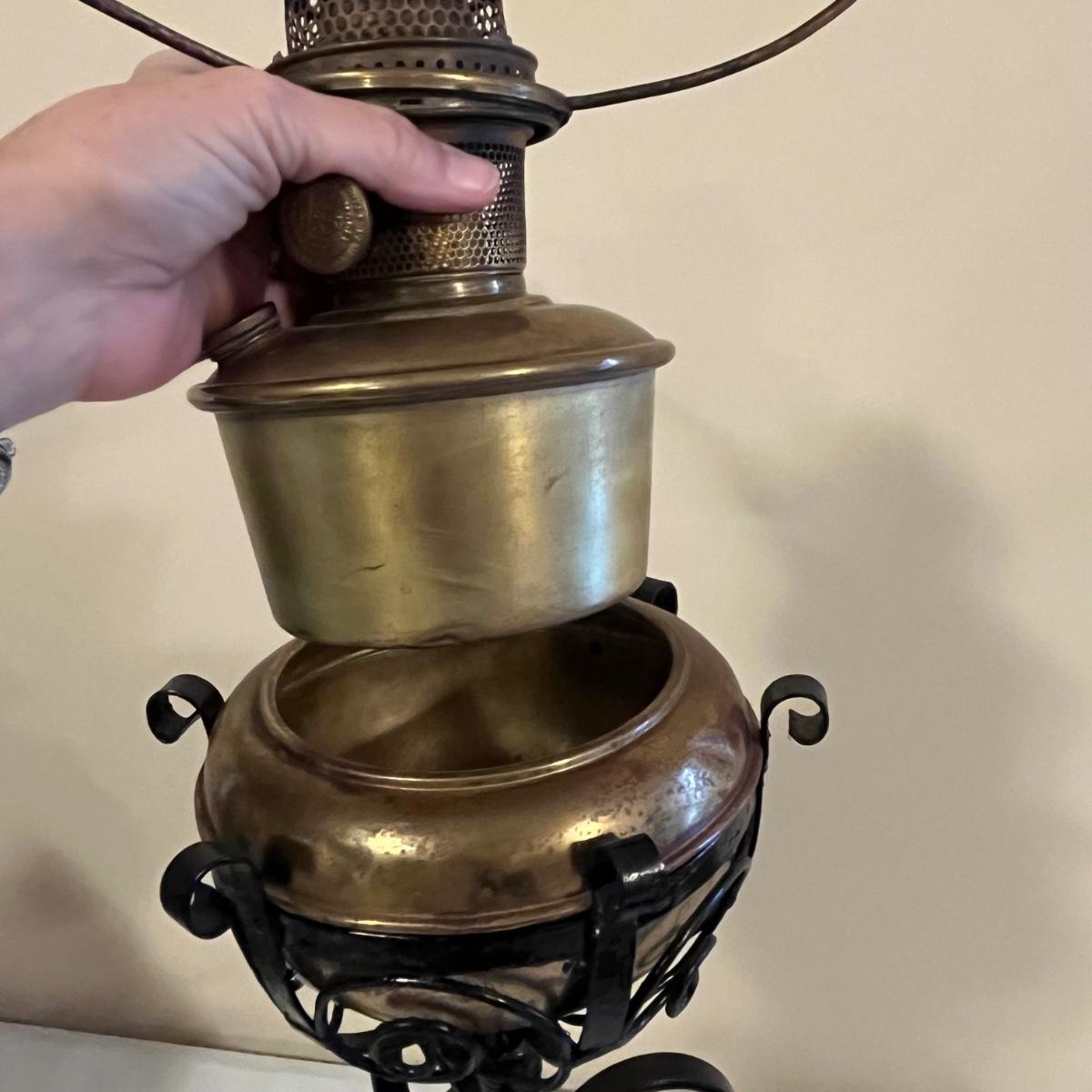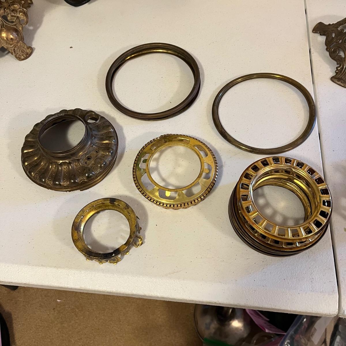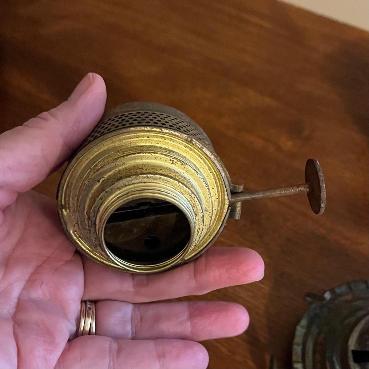 This is a large collection with two oil lamps and many oil lamp parts. The Aladdin oil lamp measures 10”D at the base x 22.5”H. The Success oil lamp measures 9”D x 18”H. Parts include bases, Edward Miller and Fostoria flame spreaders, and much more. See pictures for details.
