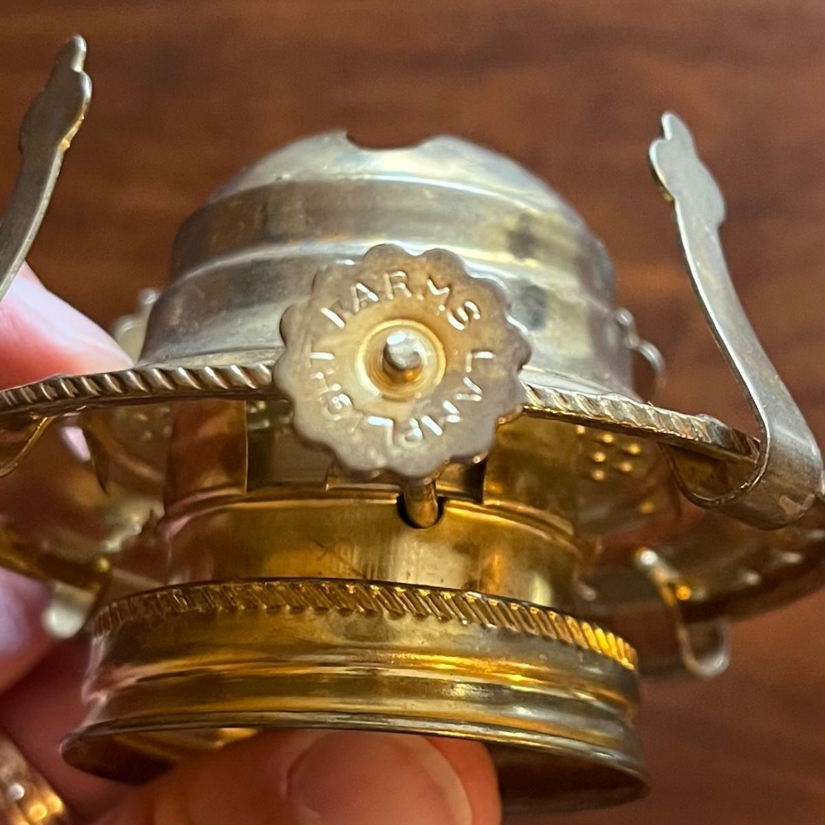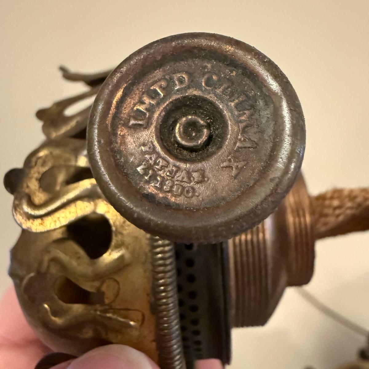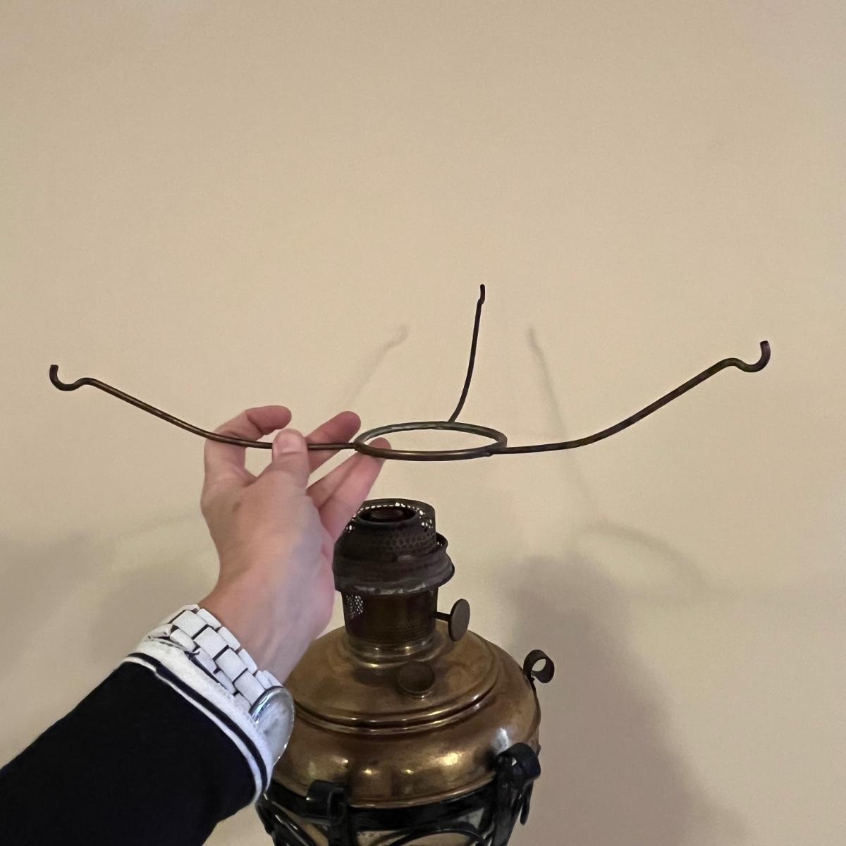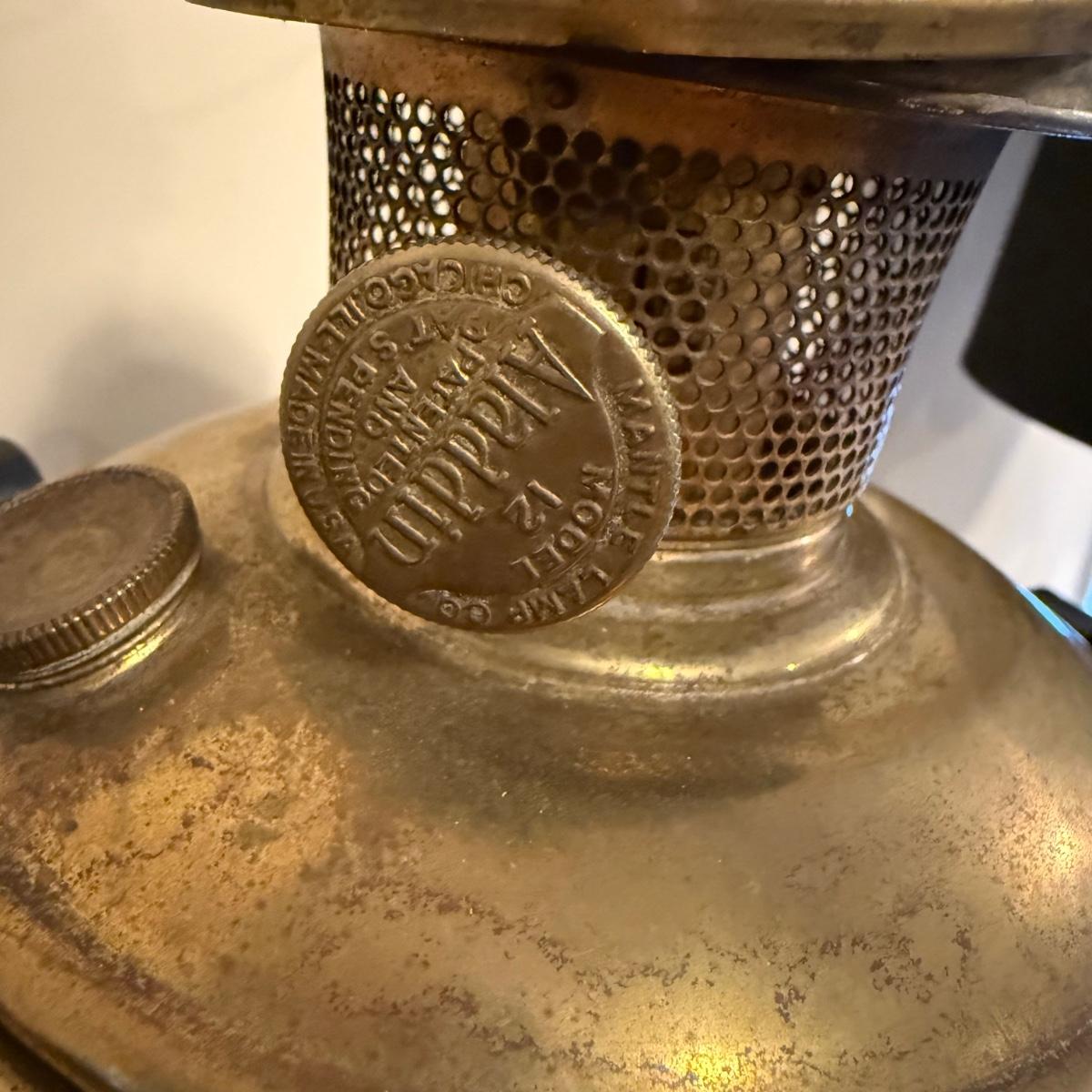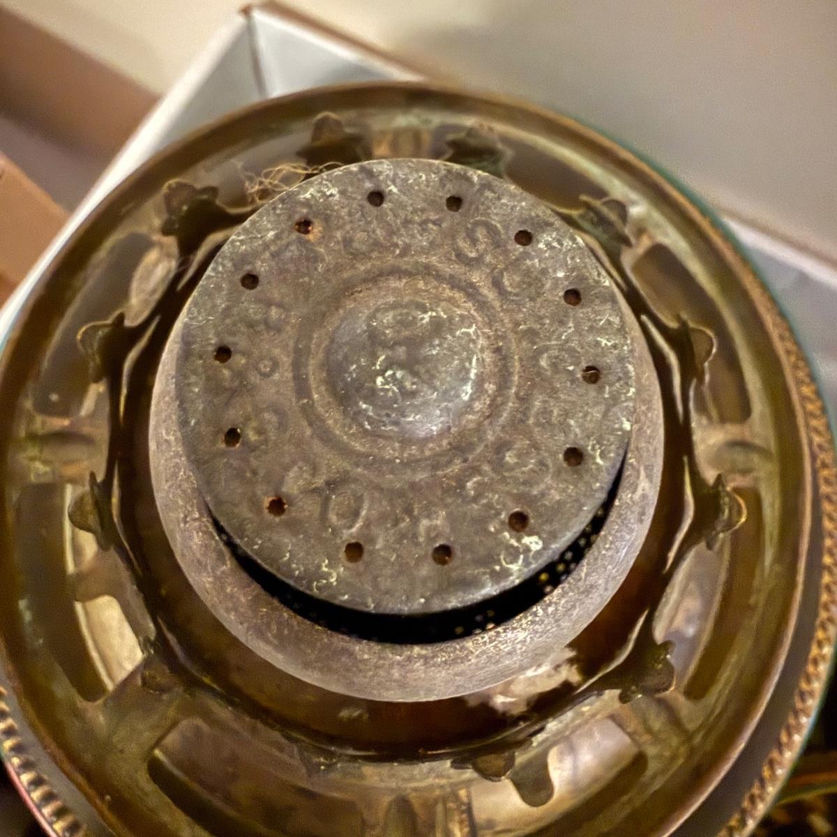 This is a large collection with two oil lamps and many oil lamp parts. The Aladdin oil lamp measures 10”D at the base x 22.5”H. The Success oil lamp measures 9”D x 18”H. Parts include bases, Edward Miller and Fostoria flame spreaders, and much more. See pictures for details.