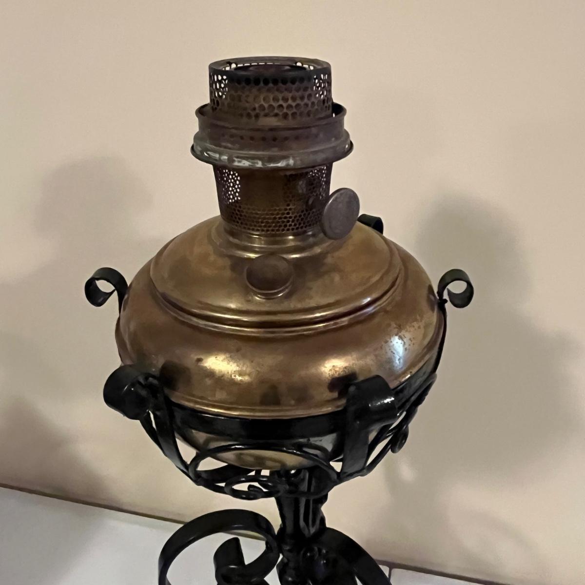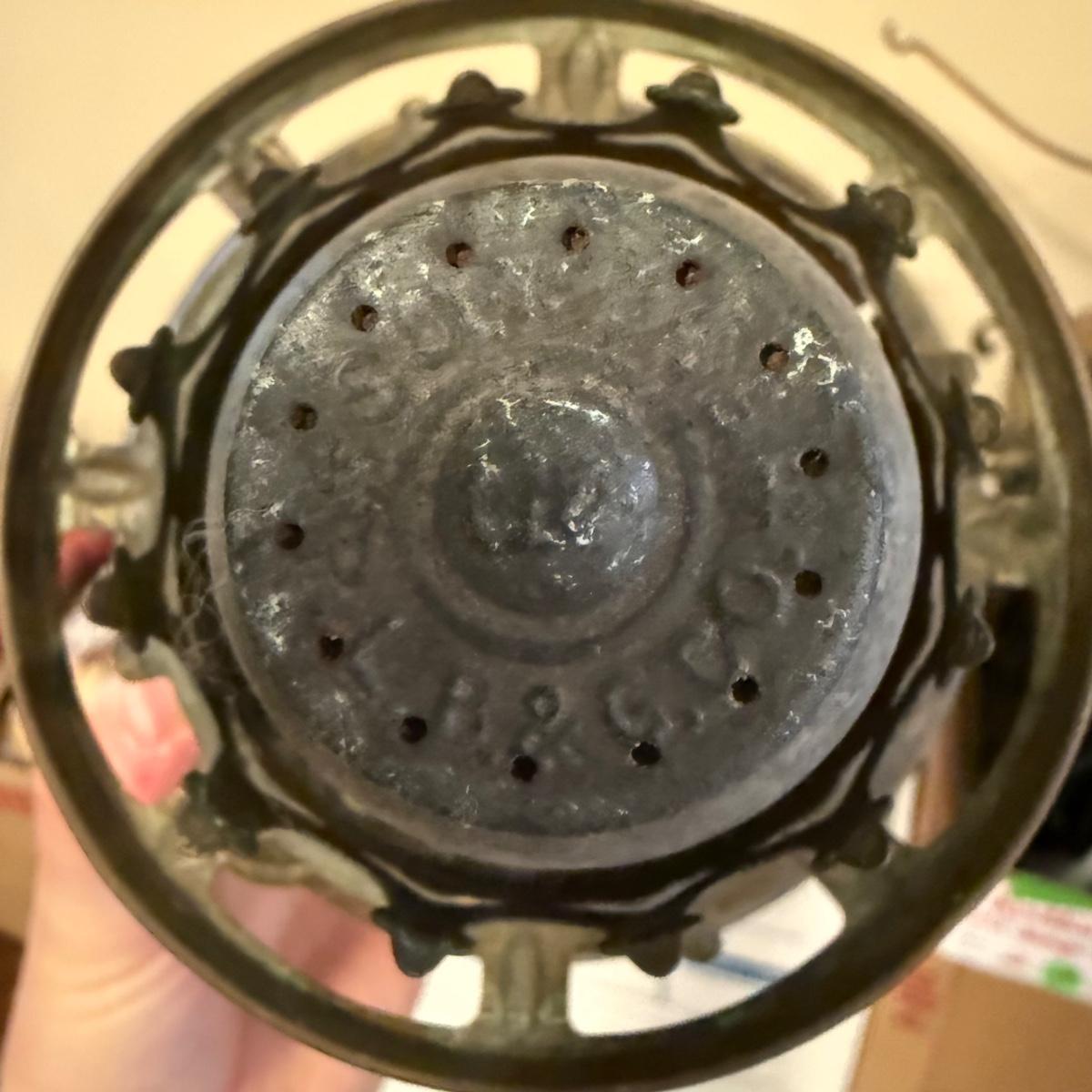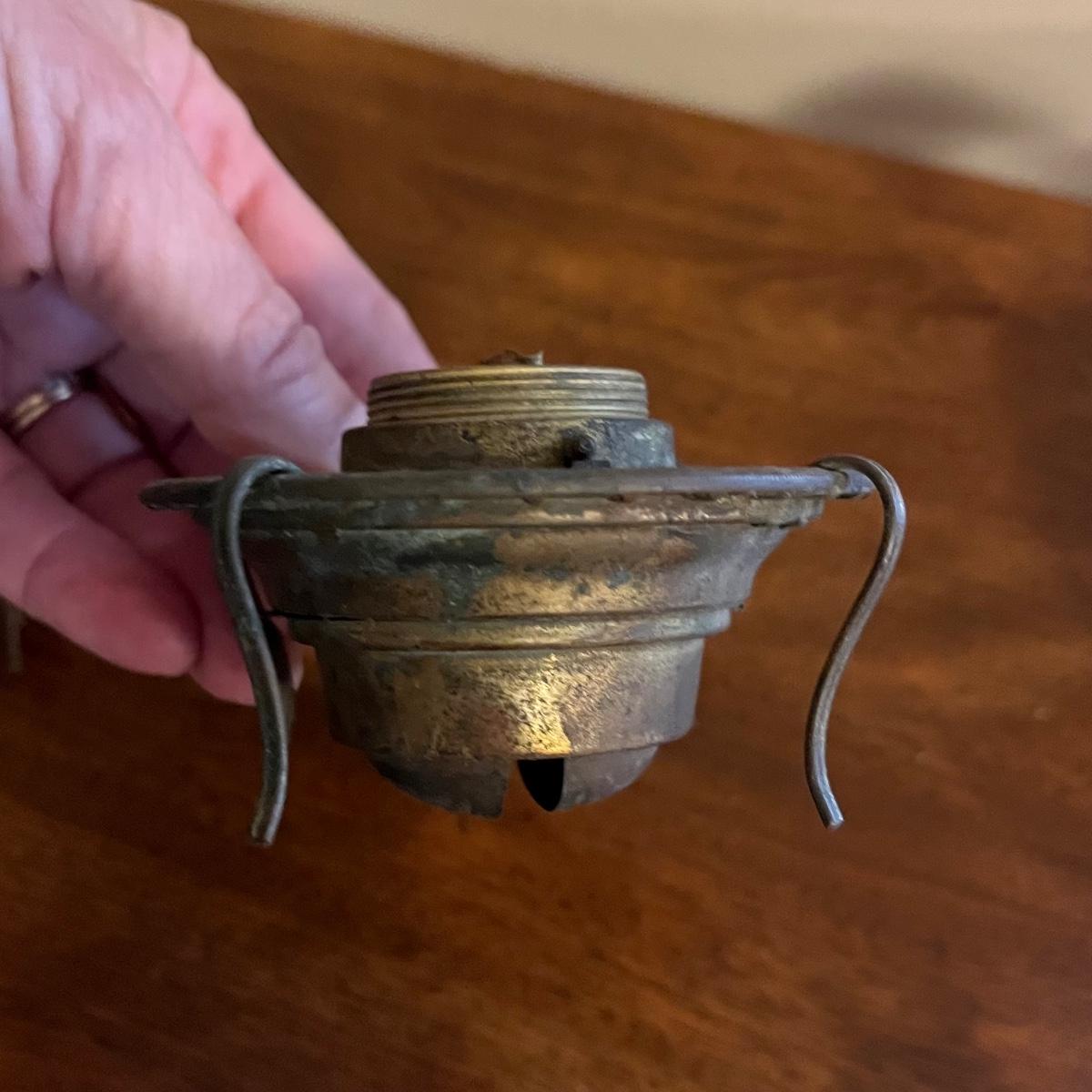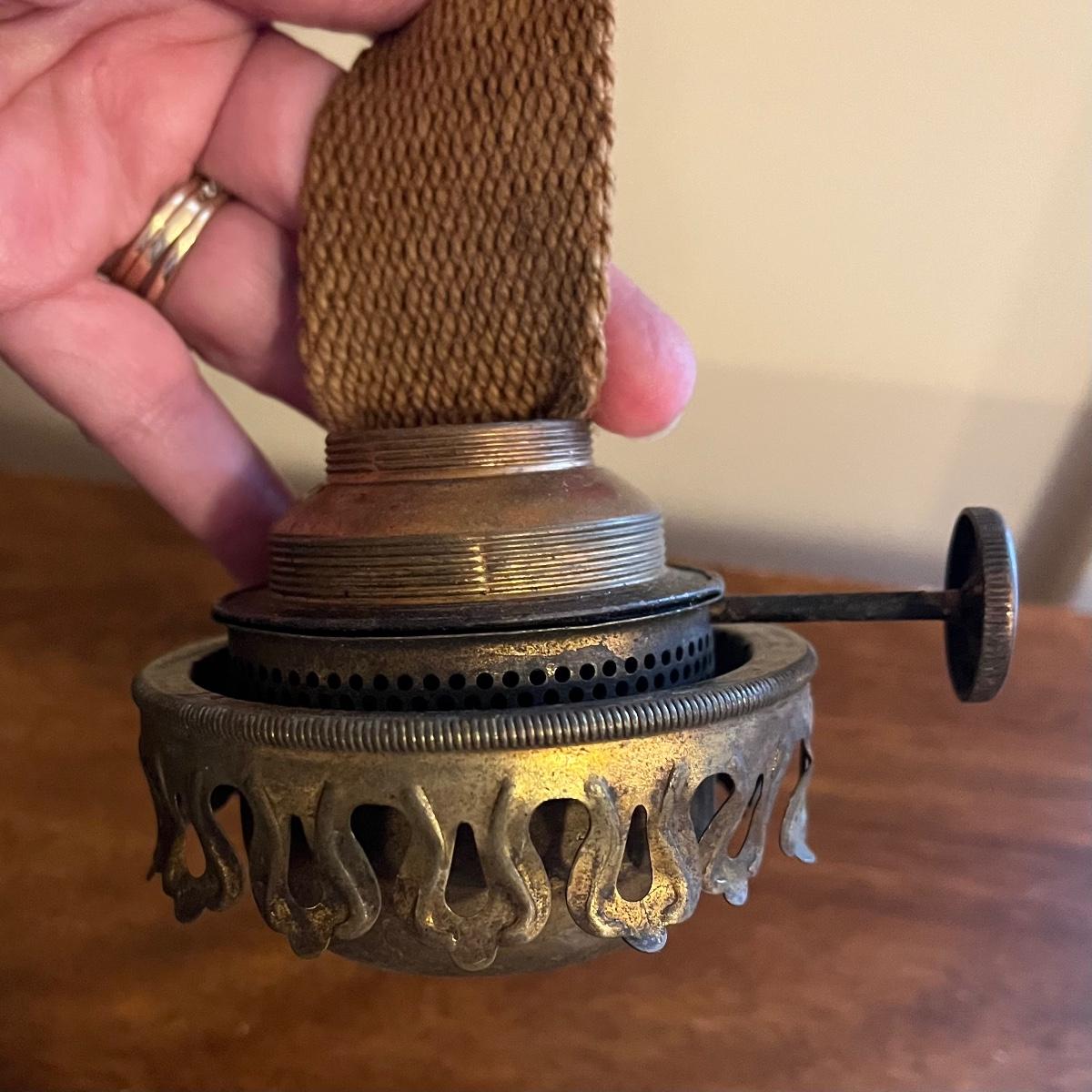 This is a large collection with two oil lamps and many oil lamp parts. The Aladdin oil lamp measures 10”D at the base x 22.5”H. The Success oil lamp measures 9”D x 18”H. Parts include bases, Edward Miller and Fostoria flame spreaders, and much more. See pictures for details.