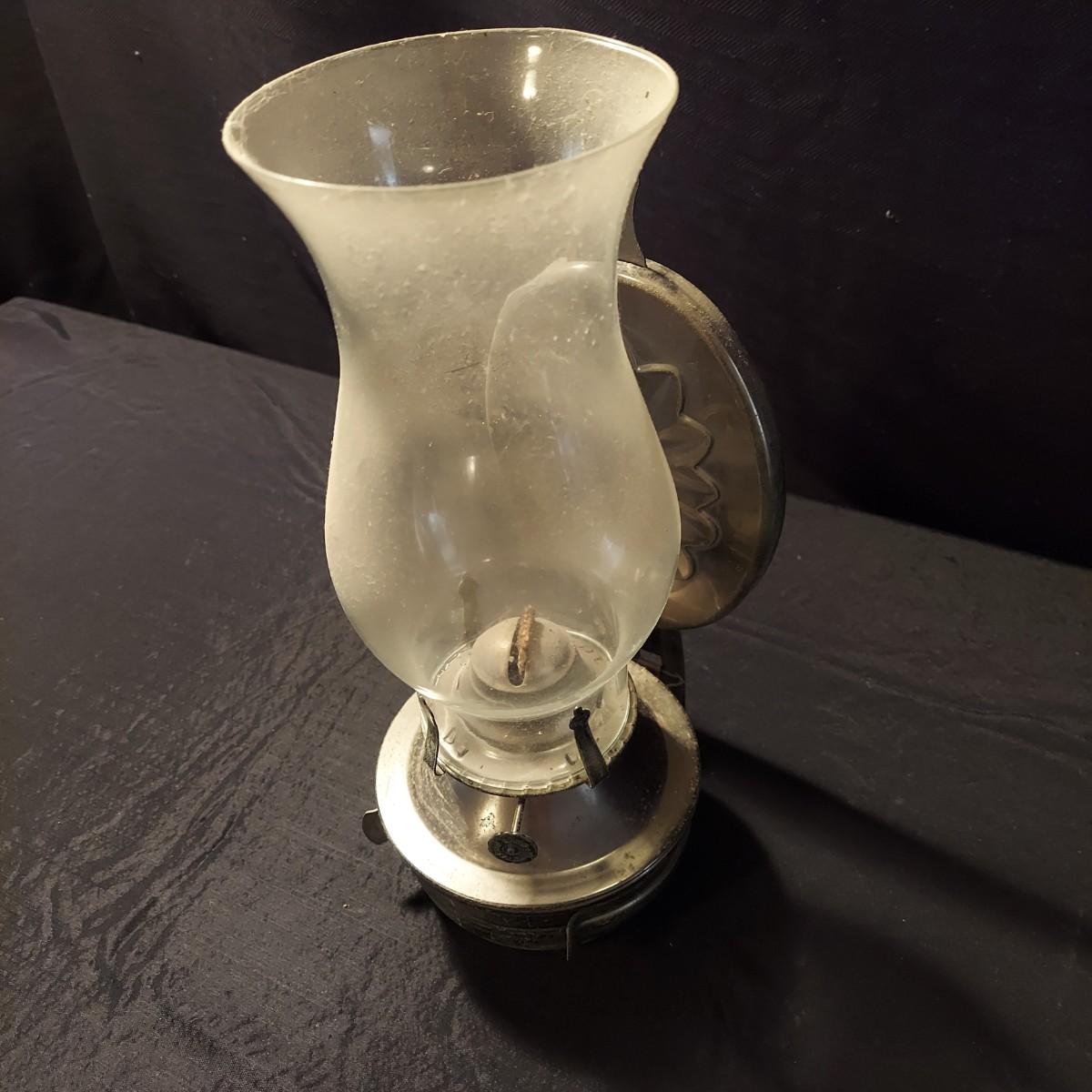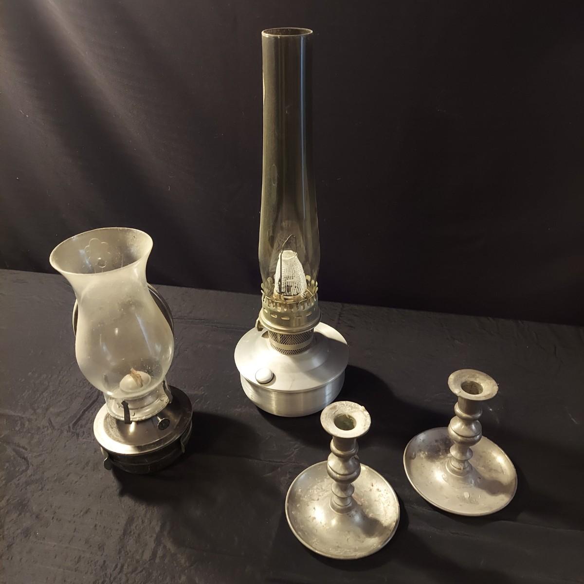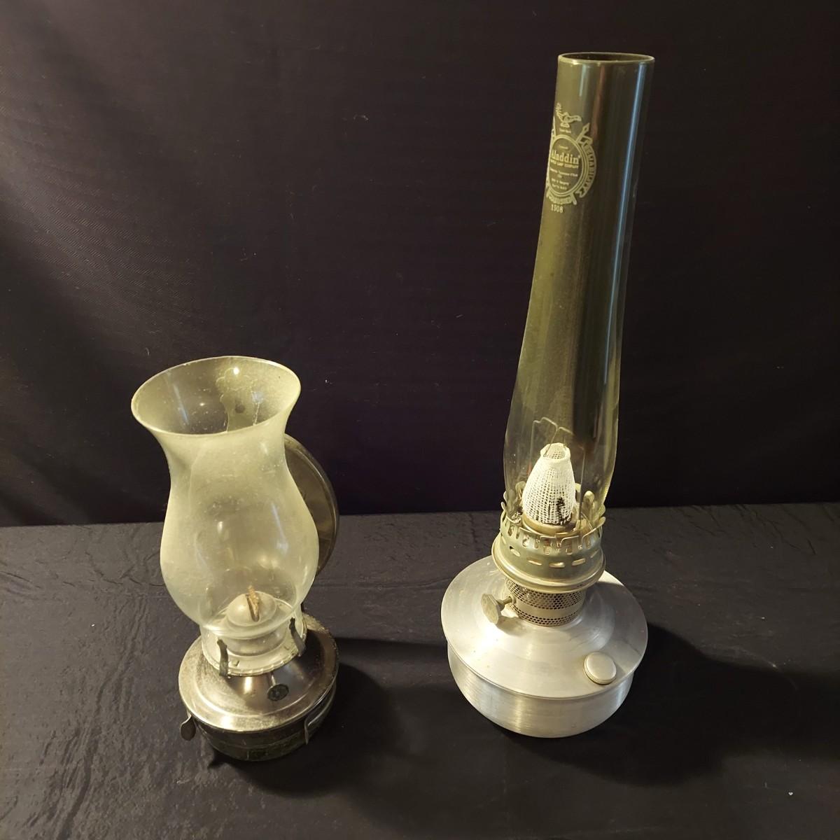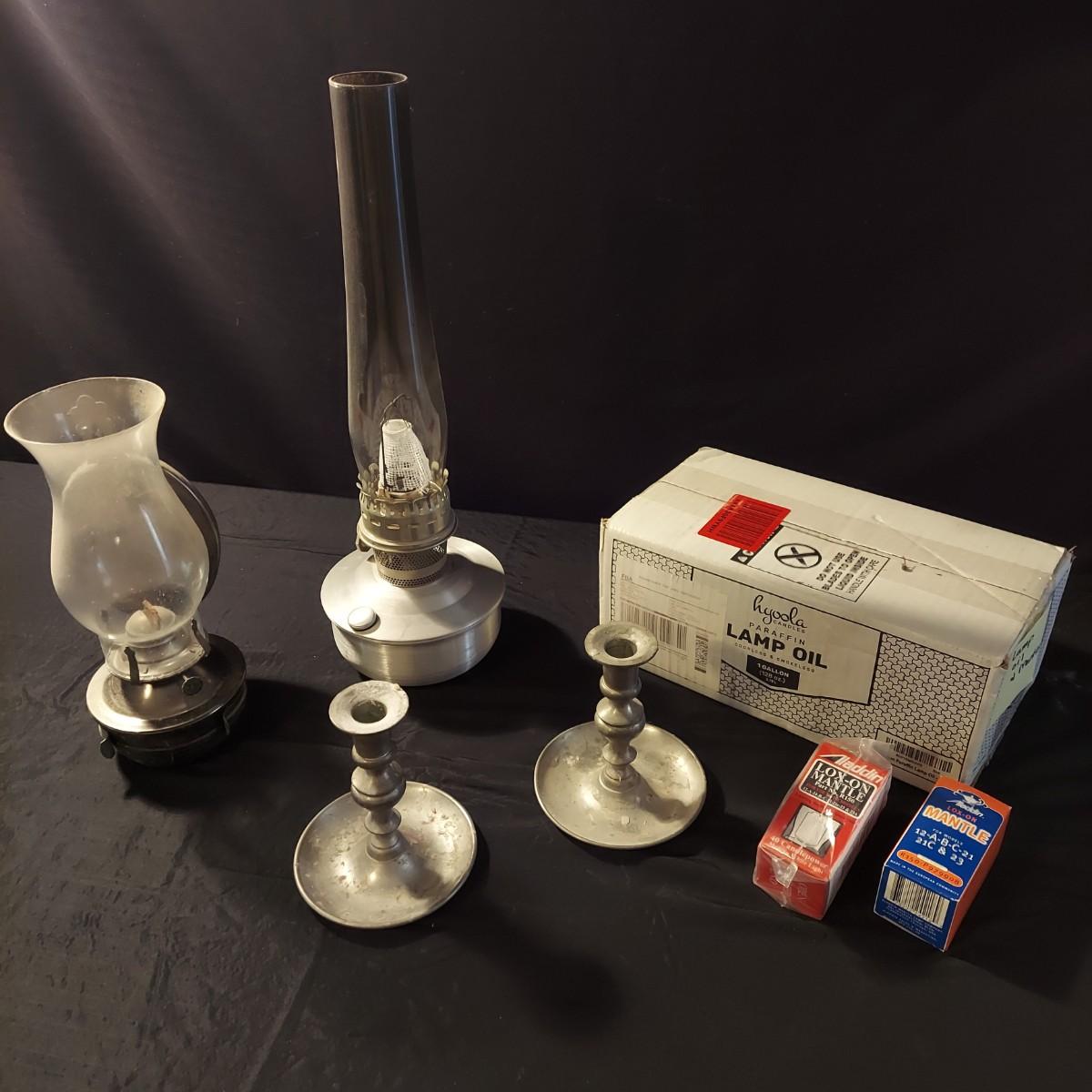 Lot includes a metal, possibly aluminum, oil lamp by Aladdin Lamp Co that measures 6"D x 19"H. With wall mount oil lamp, two extra mantle wicks, an unopened box of lamp oil and two metal candle holders. Please see photos for details. Shipping available