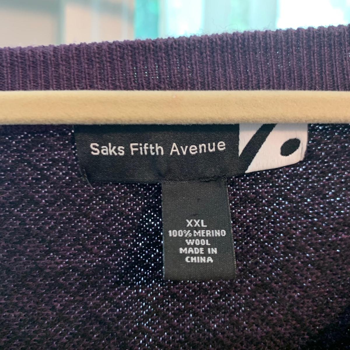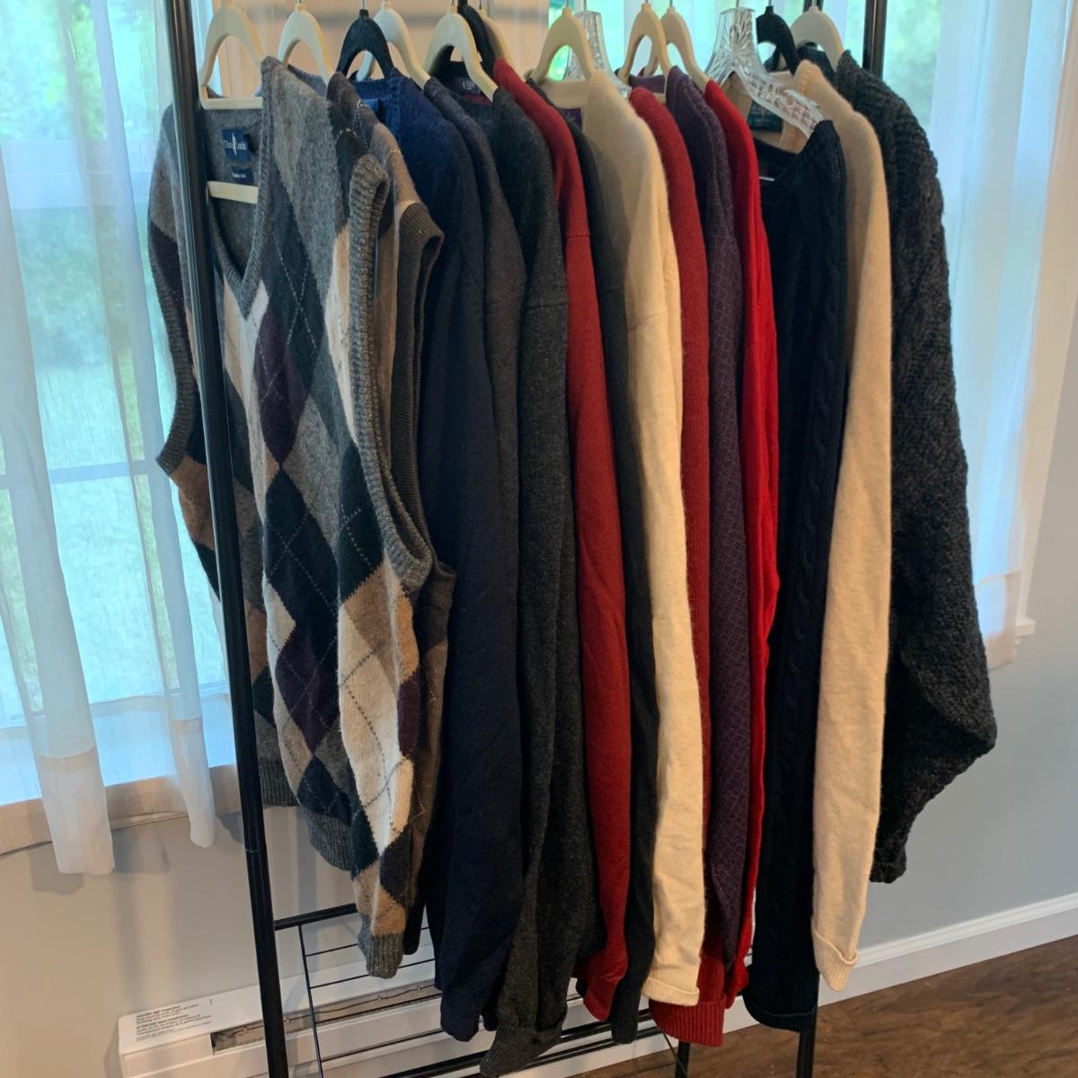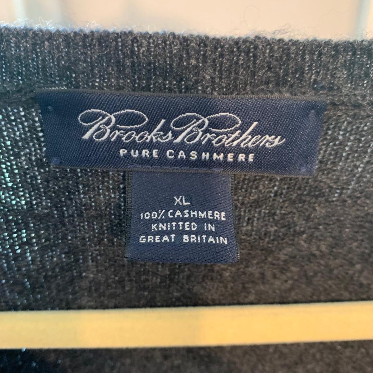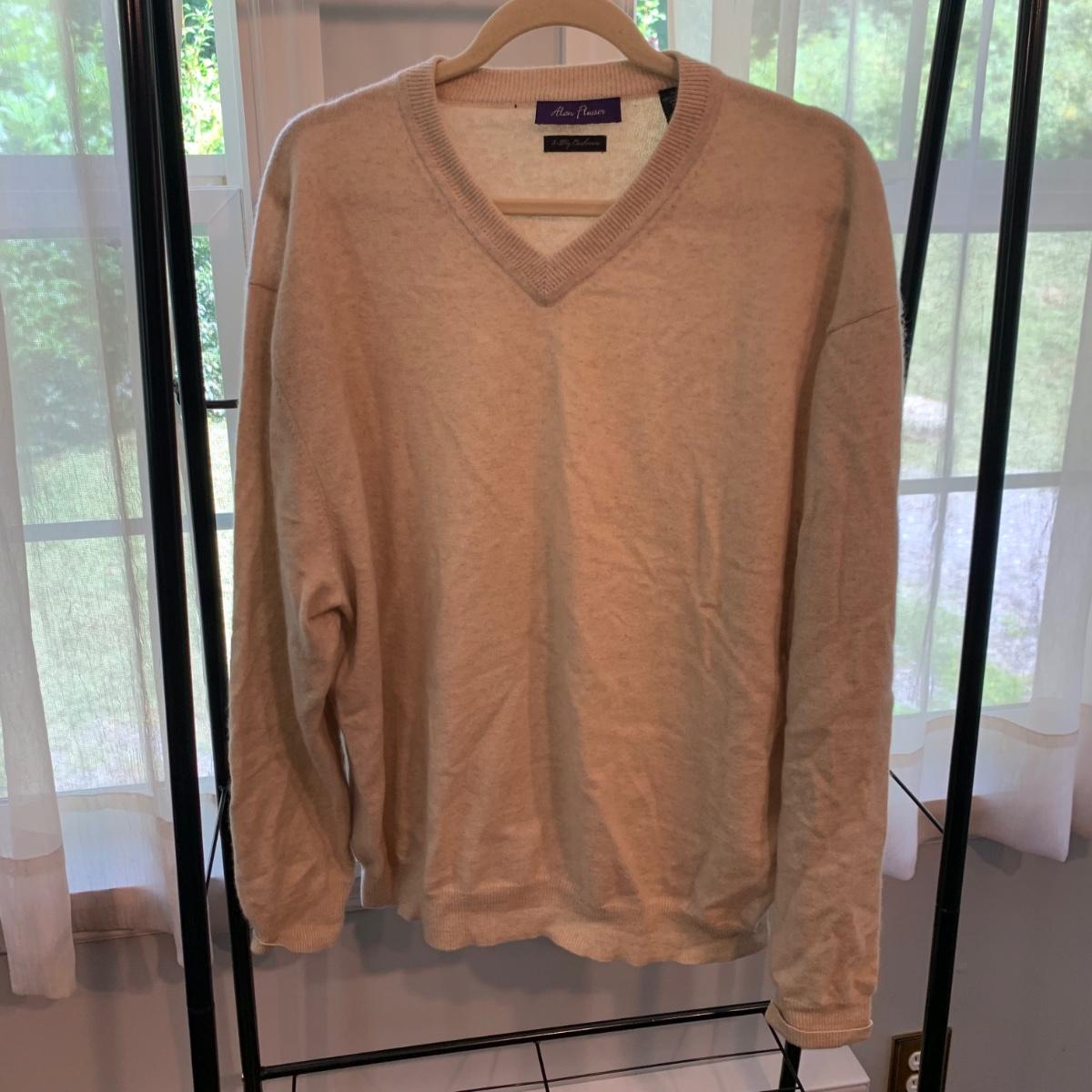 A collection of luxurious cashmere and merino wool sweaters by Alain Paine, Tiger of Sweden, Saks Fifth Avenue, Brooks Brothers, and more. Included are two sweater vests, nine v-neck sweaters, two crew neck sweaters, and a heavyweight cardigan. All items except for the Brooks Brothers navy sweater have tags that state cashmere or wool; the navy Brooks Brothers is mercerized cotton. Most items are XL, but a few are 2X and one is 3X. One tiny hole was found on the back the Raffi sweater vest; see picture. Please see photos for inventory and details. Hangers are not included.