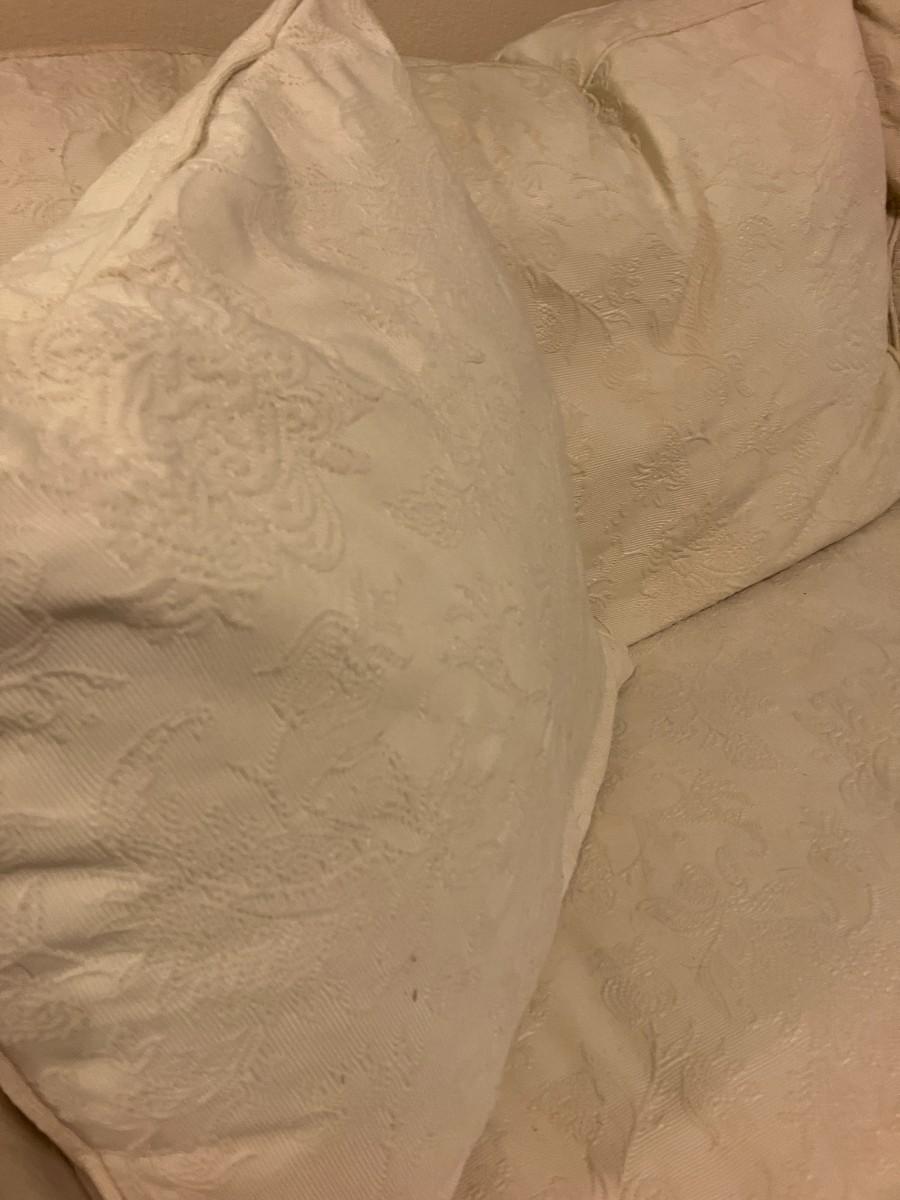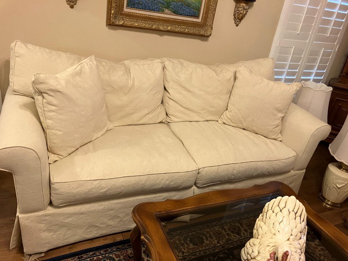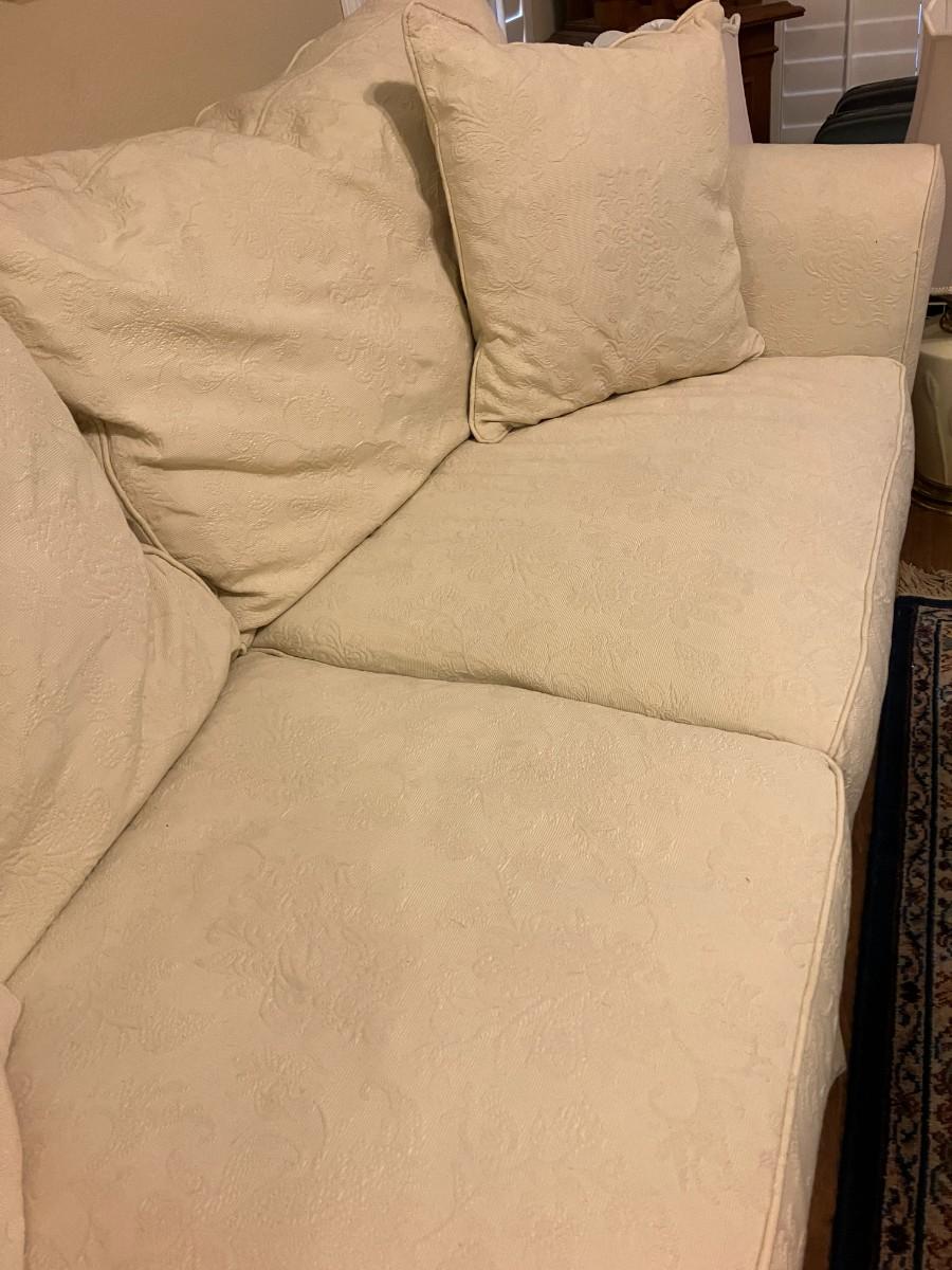 Alan White brand white brocade sofa. Excellent condition, no stains or rips. 39" H x 82" W x 39" D