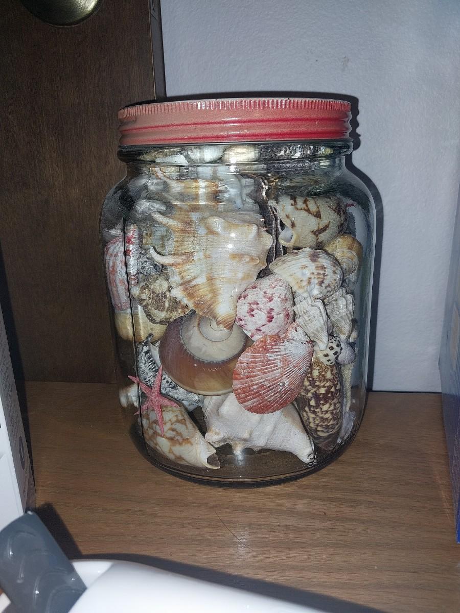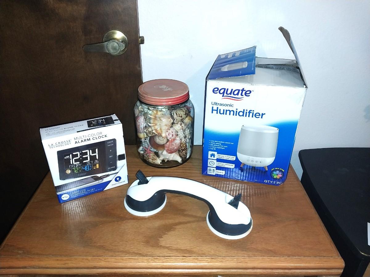 ALARM CLOCK, HUMIDIFIER, JAR OF SEASHELLS & WALL GRABBER
