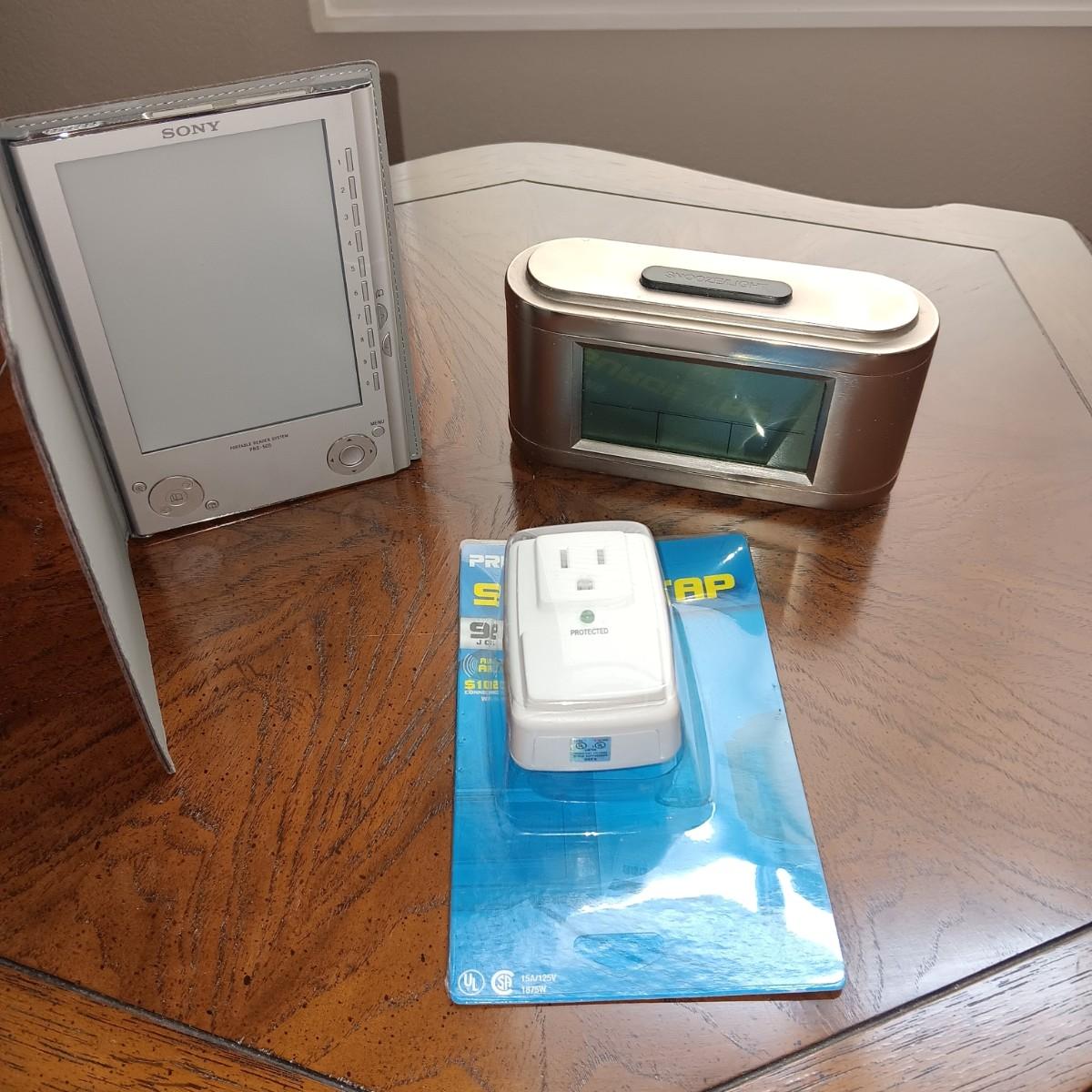 ALARM CLOCK WITH CALENDAR, PORTABLE READER SYSTEM AND A SURGE TAP